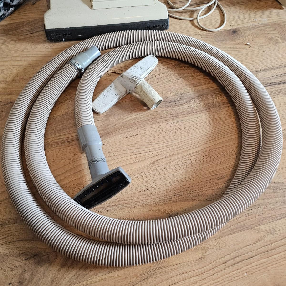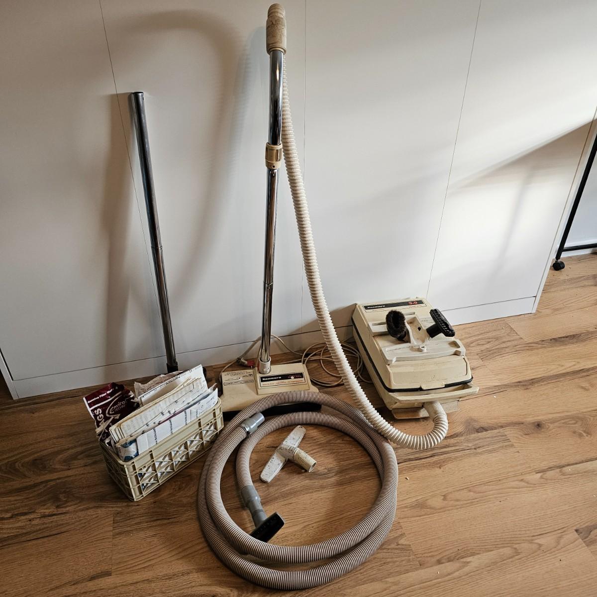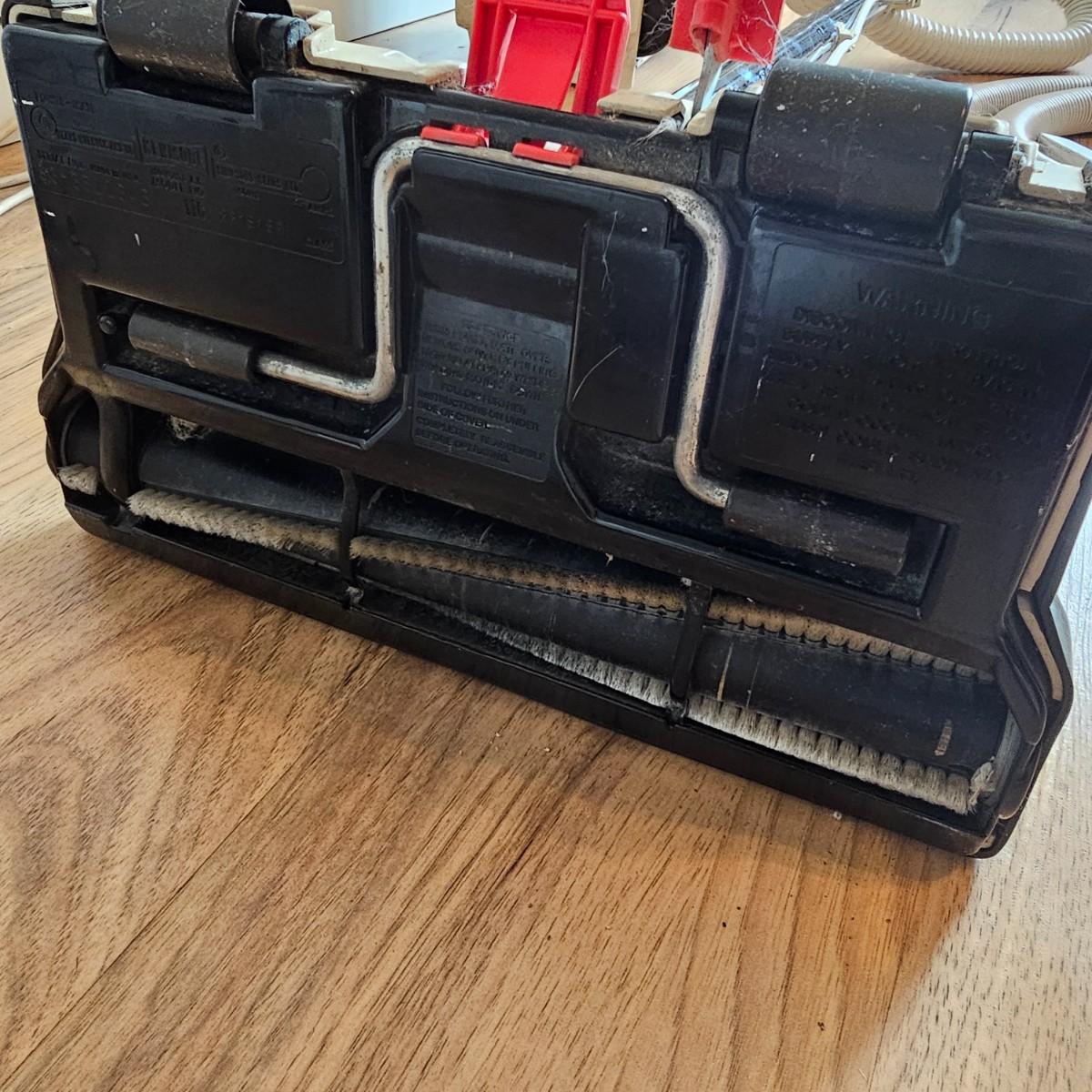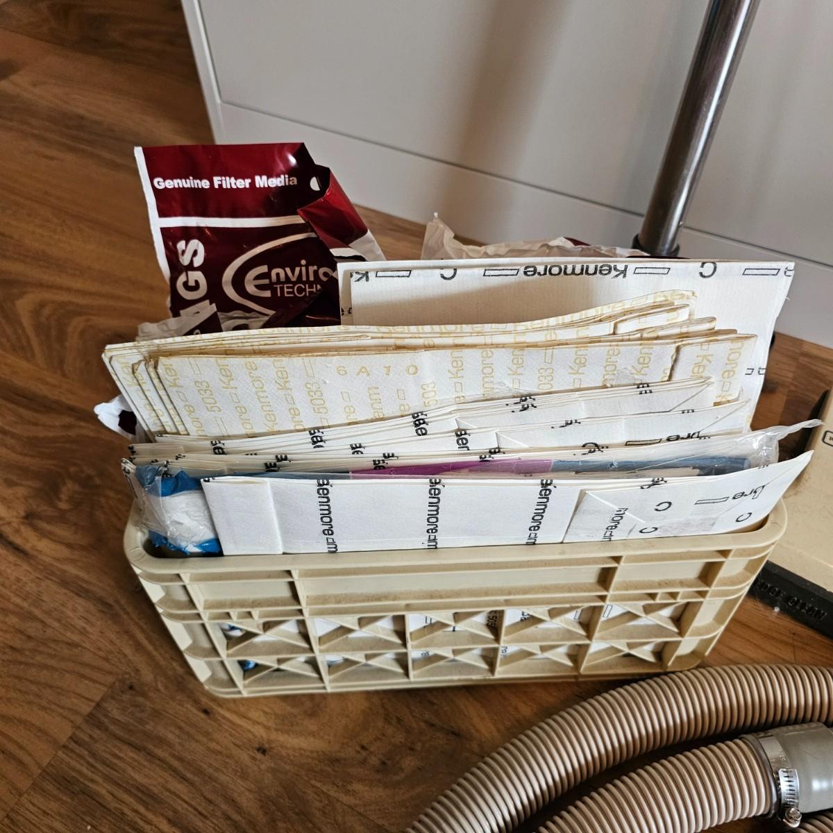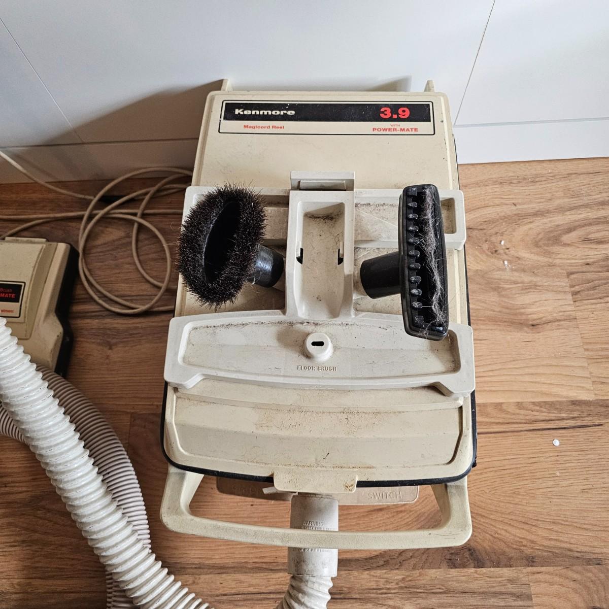 Sears Kenmore canister double brush vacuum. Comes with Power Mate head, extra bags and attachments, additional floor wand and another hose for extended reach. Measures 12" x 21" x 9"H, powered on when plugged in. Power cord has one taped area, case has minor scratches & scuffs. See photos for details. Local pickup only.