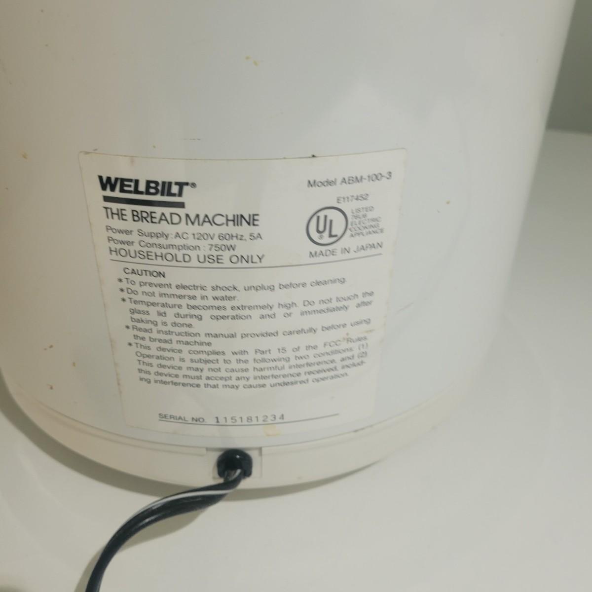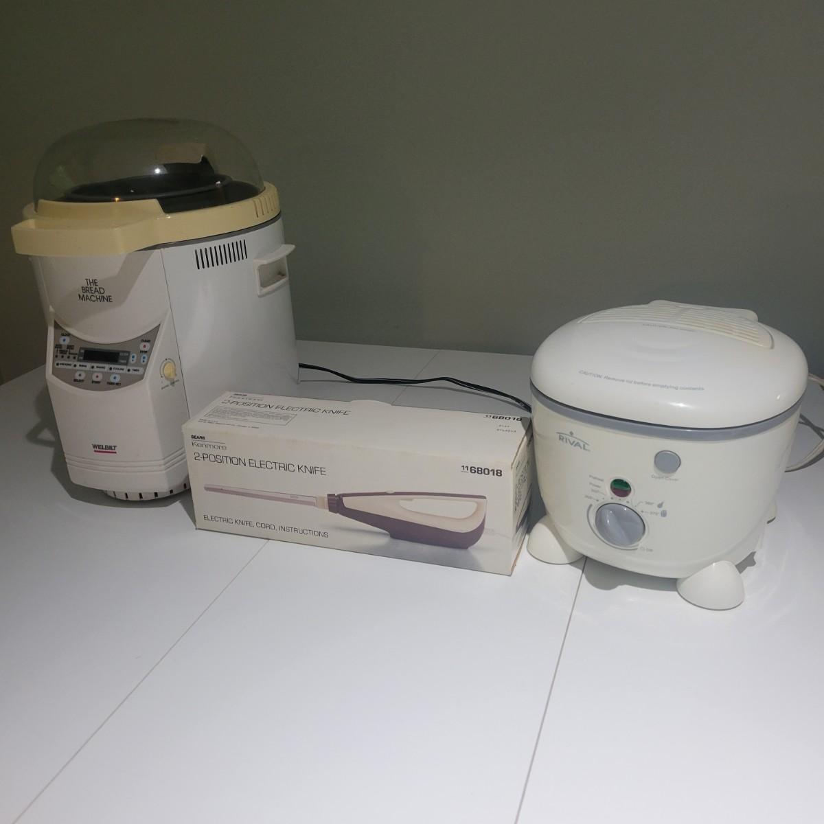 Lot consists of three small appliances in good condition. A small deep fry by Rival that was tested and works. An electric serrated knife made by Kenmore that was tested and works. A bread machine by Welbilt that powered on when tested. Bread machine measures approximately 10" x 14.5".