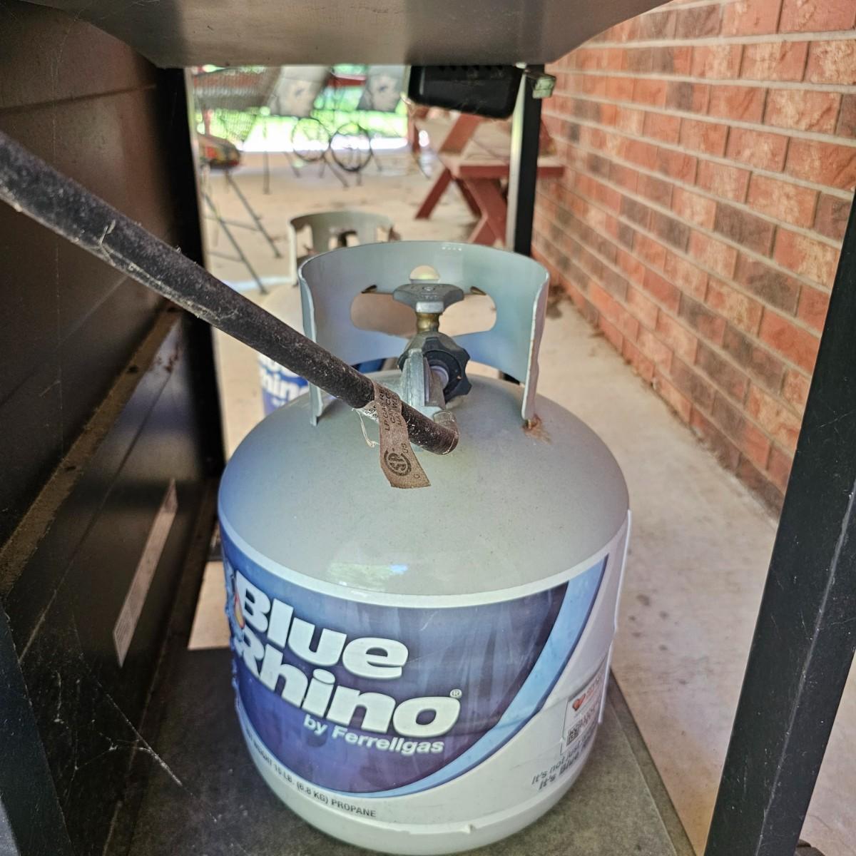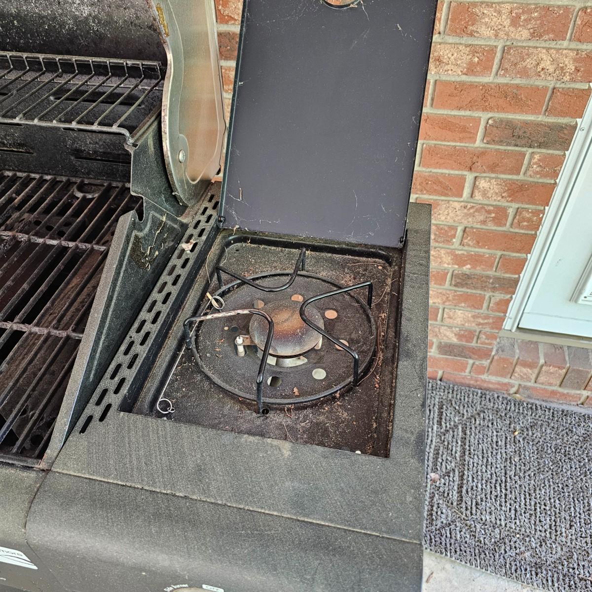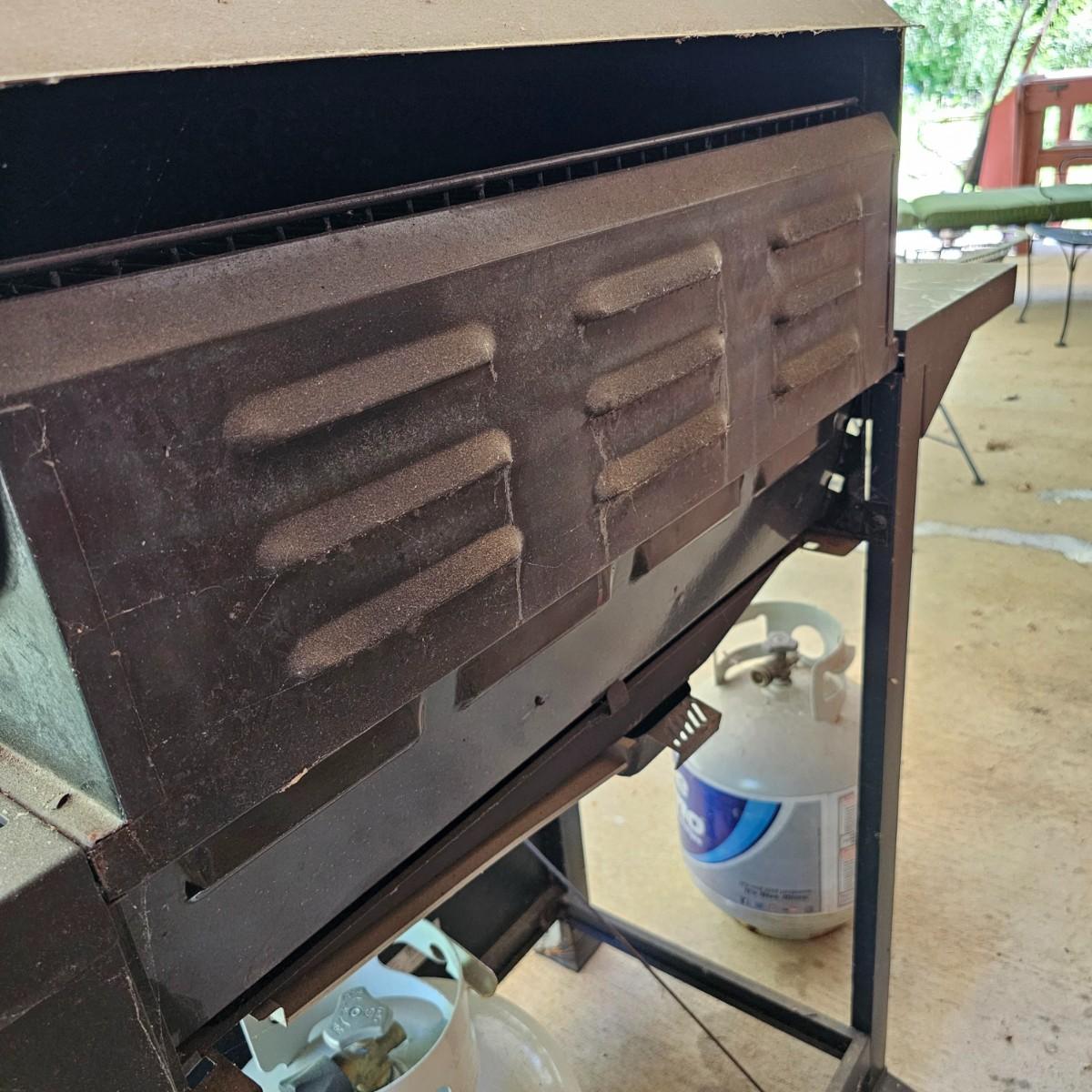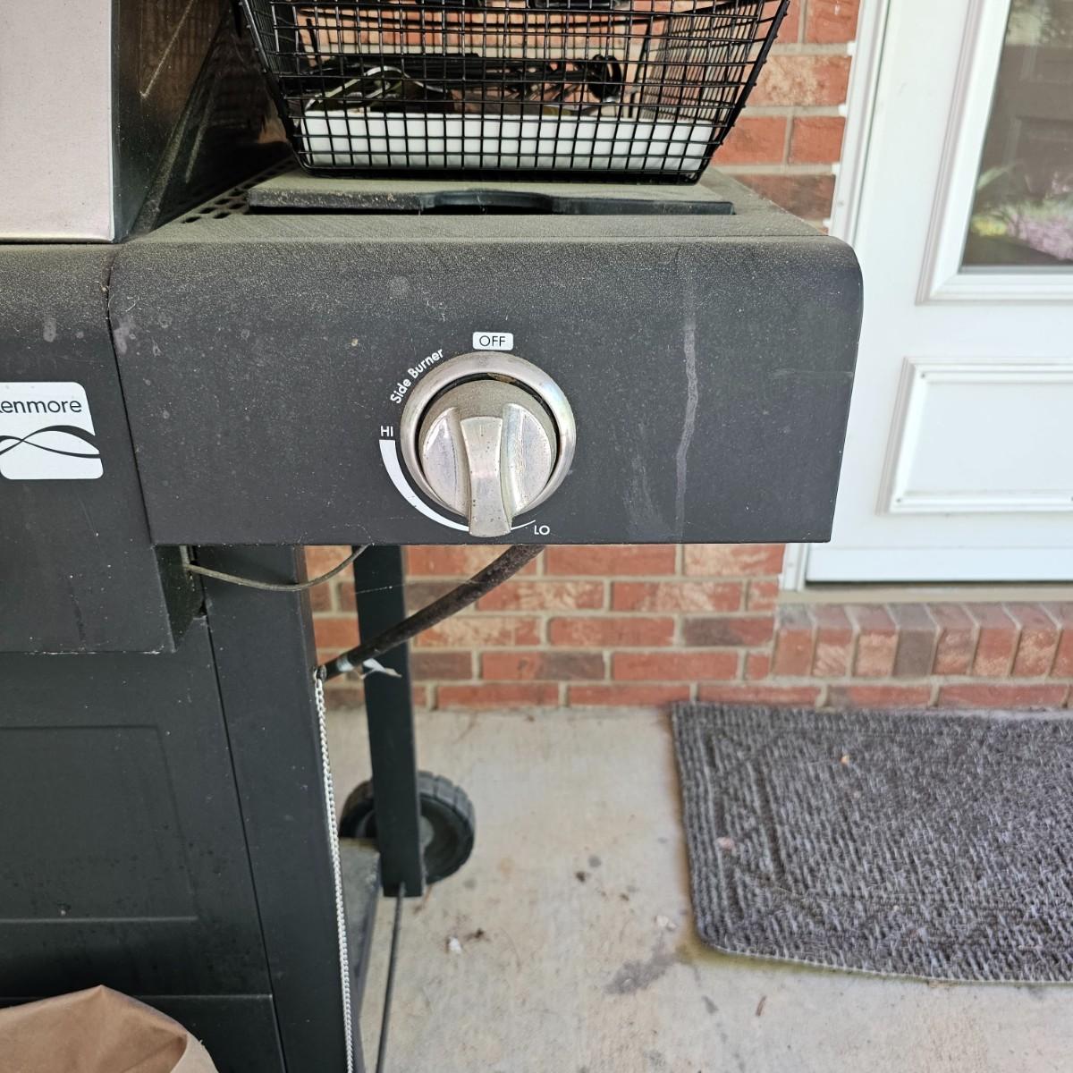 Outdoor gas grill by Kenmore has four main burners and a side burner. Includes cover, cooking tools, baskets and two LP tanks, we cannot verify tank contents. Grill measures 51" x 22" x 47"H. Some rust/corrosion on grill plates, see photos for details. Shipping available.
