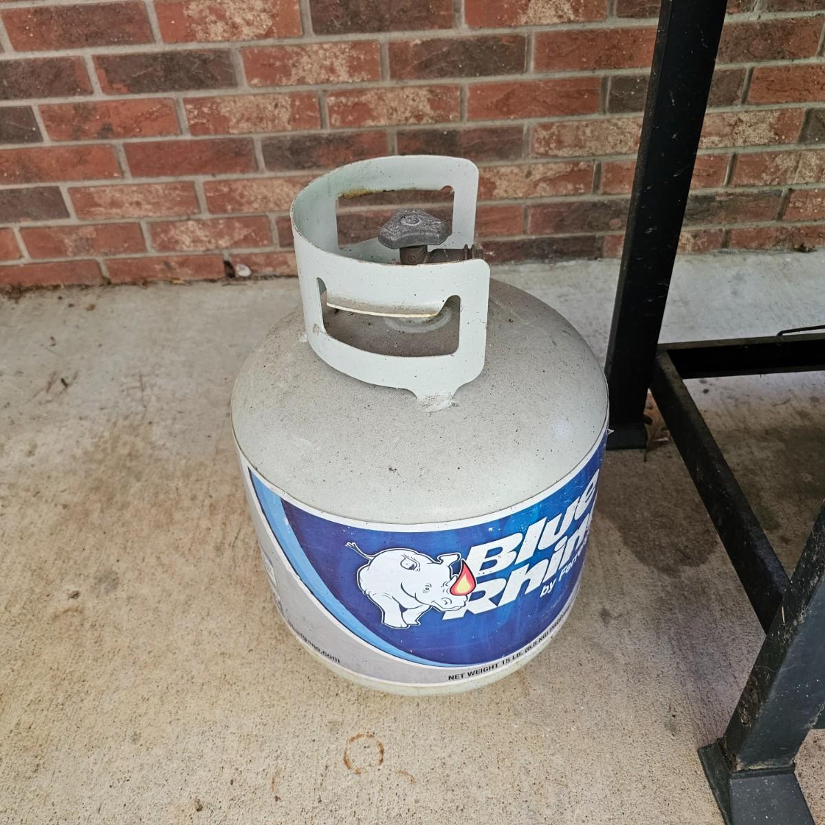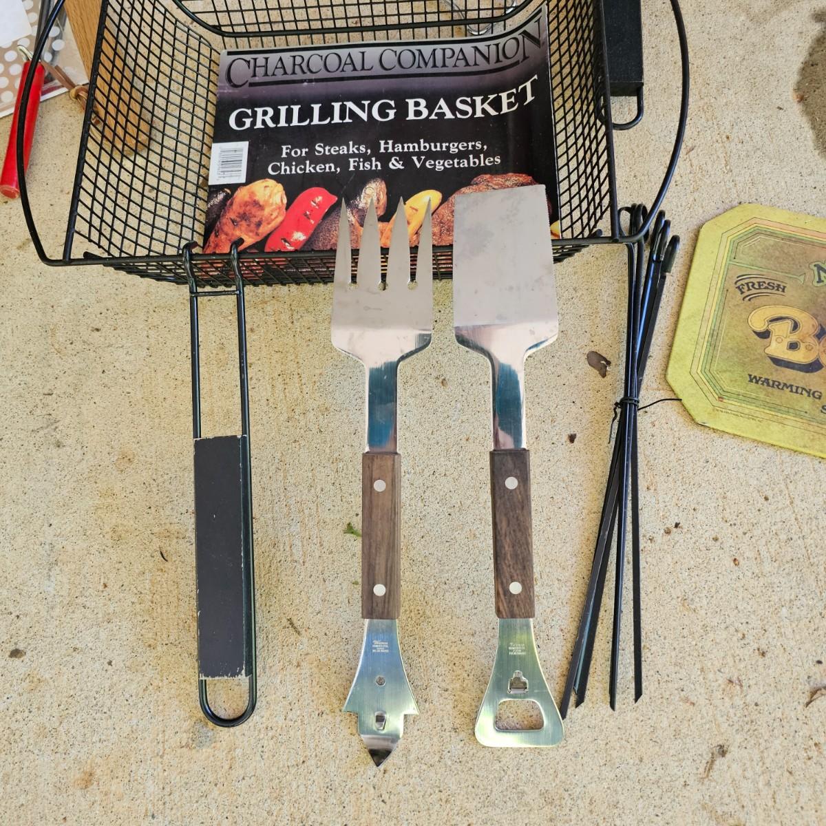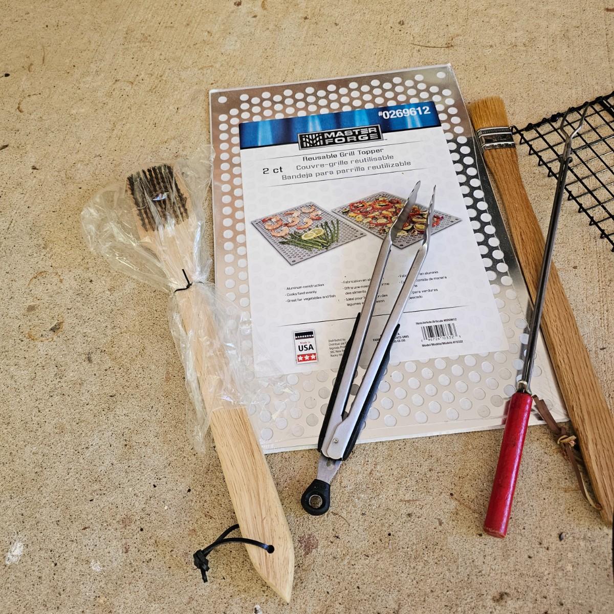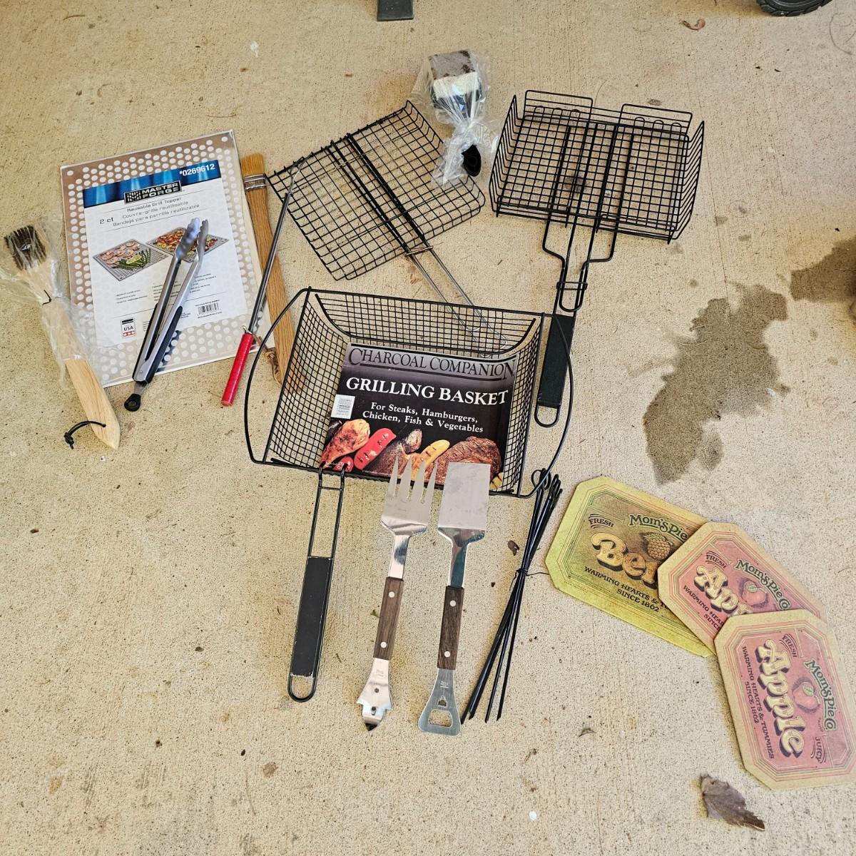 Outdoor gas grill by Kenmore has four main burners and a side burner. Includes cover, cooking tools, baskets and two LP tanks, we cannot verify tank contents. Grill measures 51" x 22" x 47"H. Some rust/corrosion on grill plates, see photos for details. Shipping available.