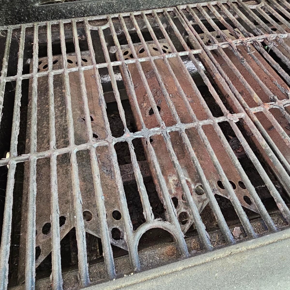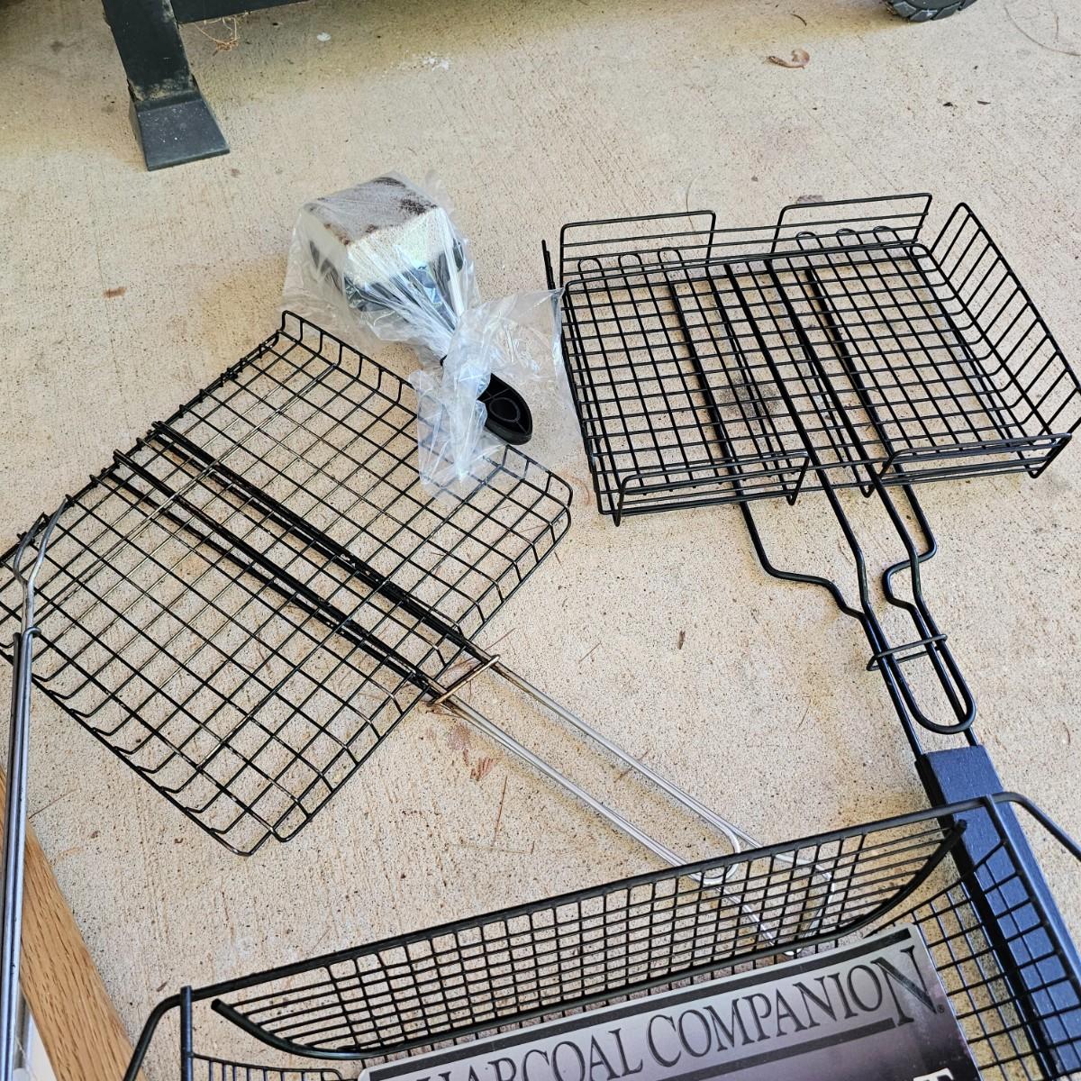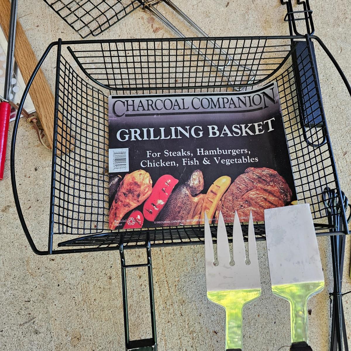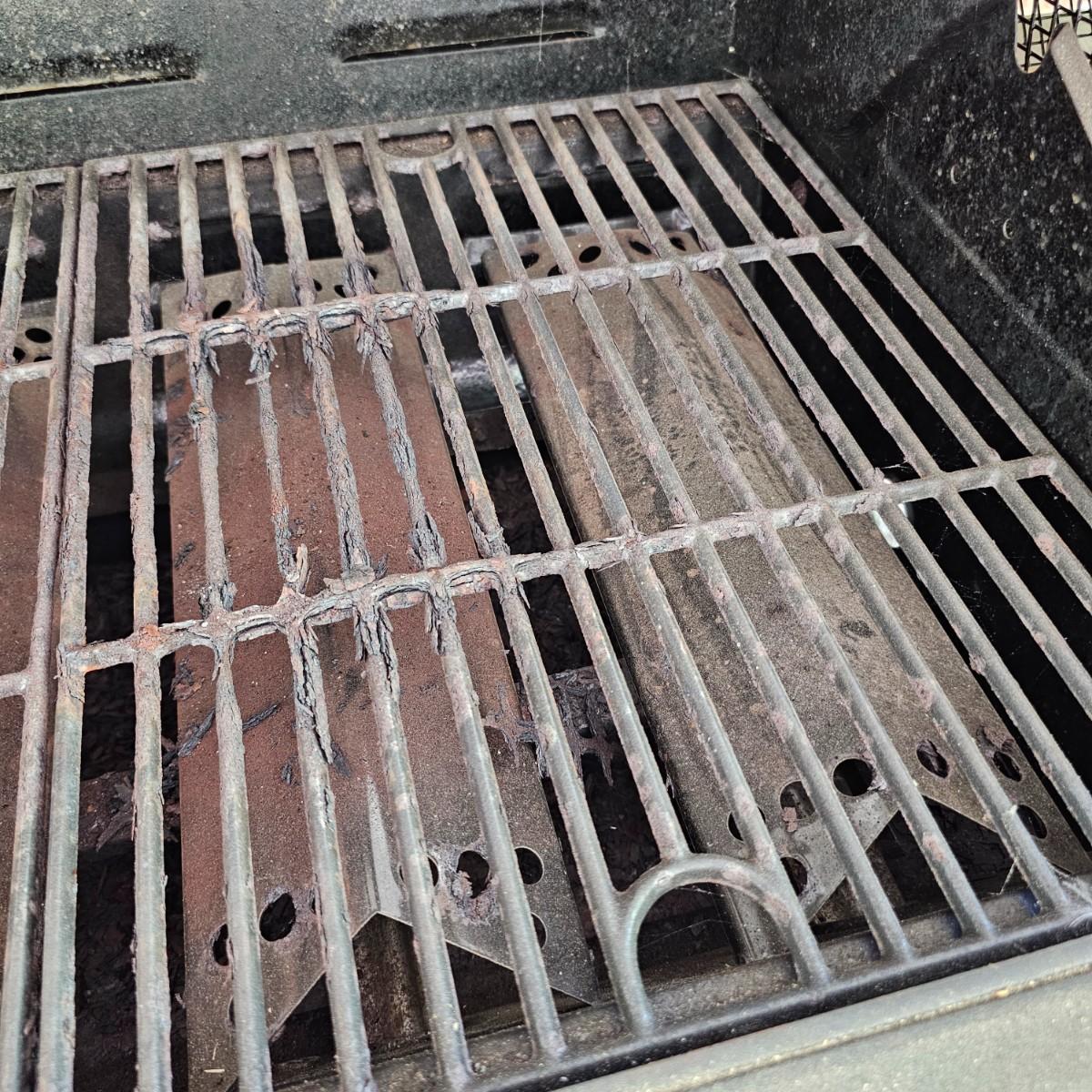 Outdoor gas grill by Kenmore has four main burners and a side burner. Includes cover, cooking tools, baskets and two LP tanks, we cannot verify tank contents. Grill measures 51" x 22" x 47"H. Some rust/corrosion on grill plates, see photos for details. Shipping available.