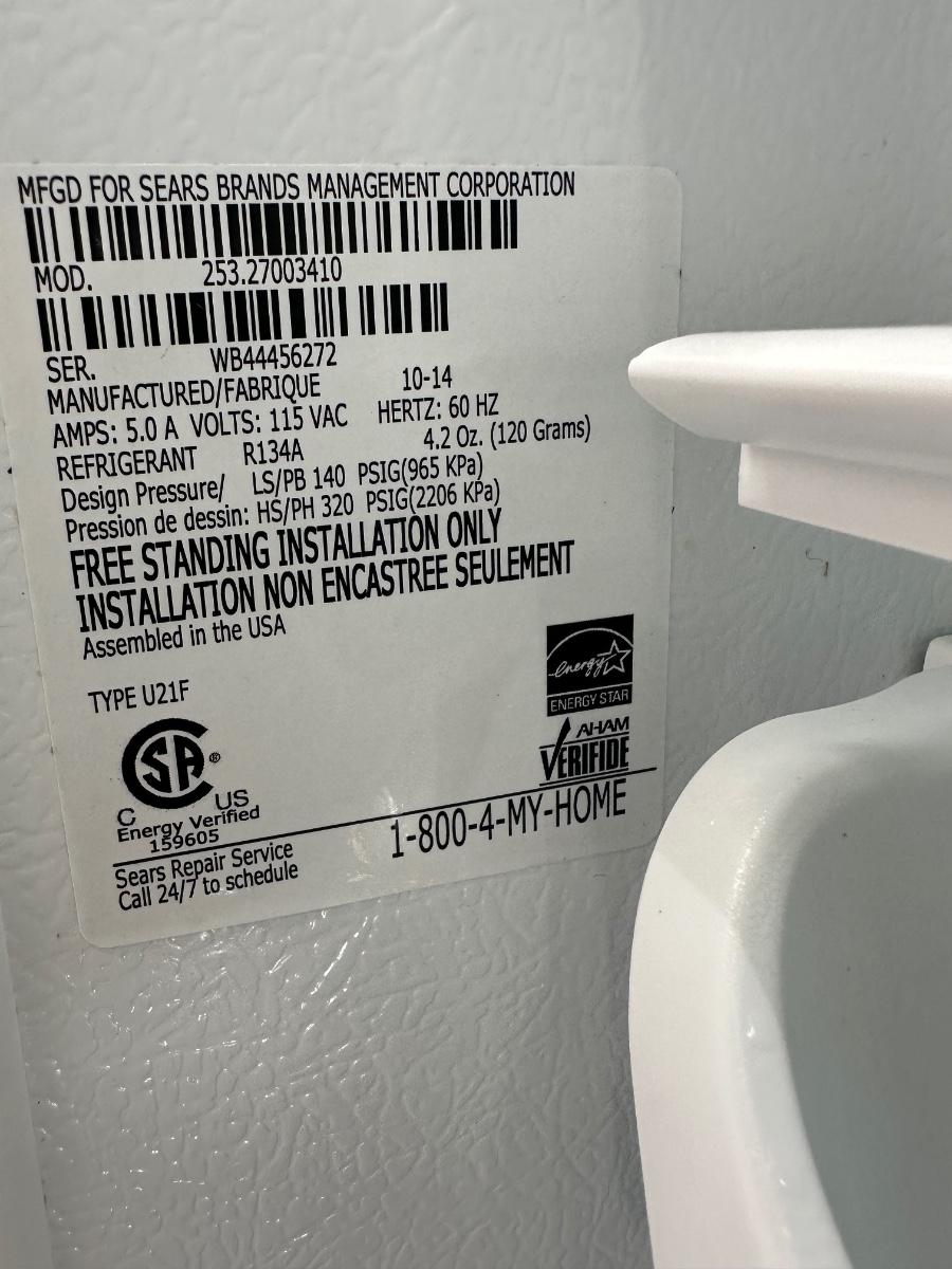 Kenmore Elite upright freezer, model 253.27003410, manufactured in 2014.