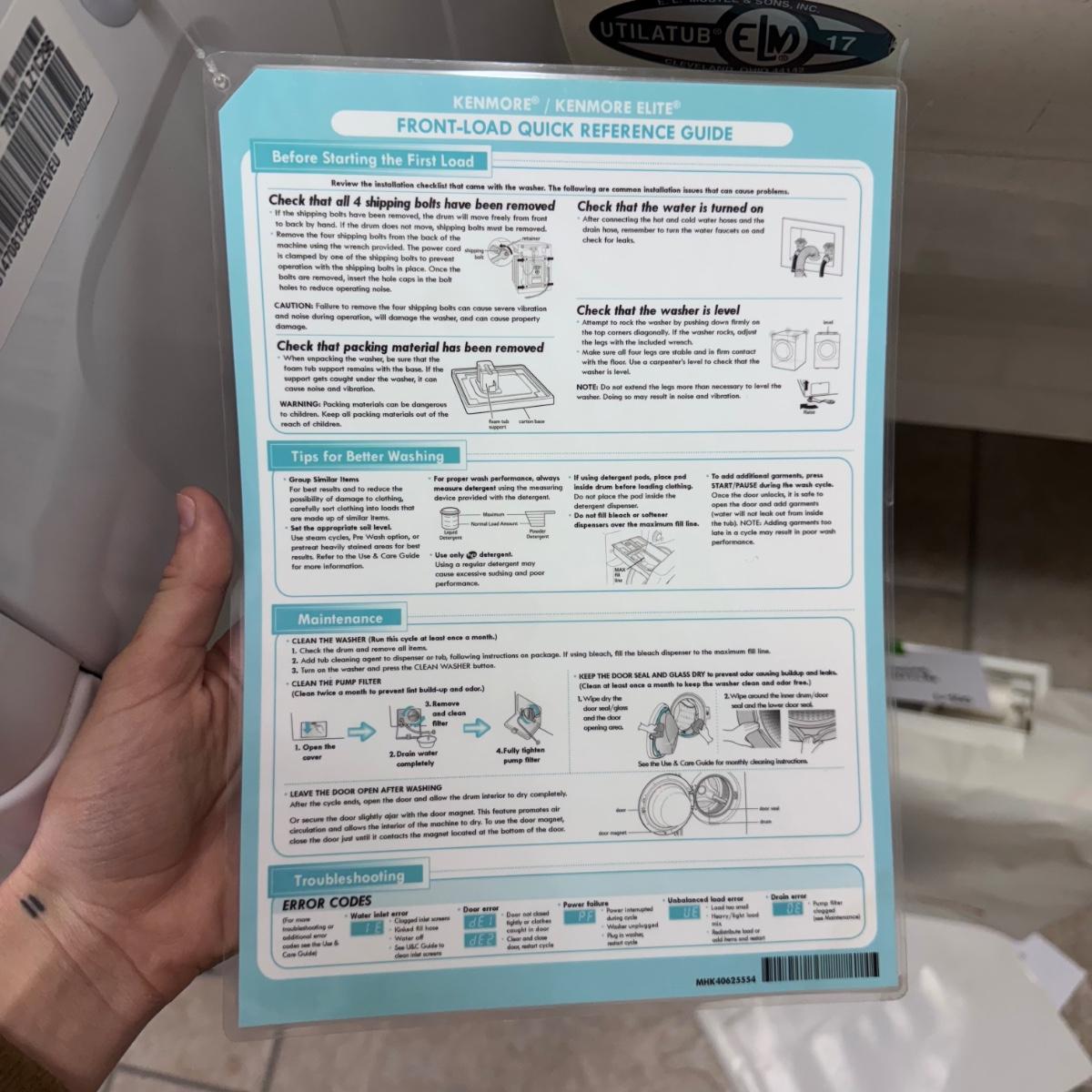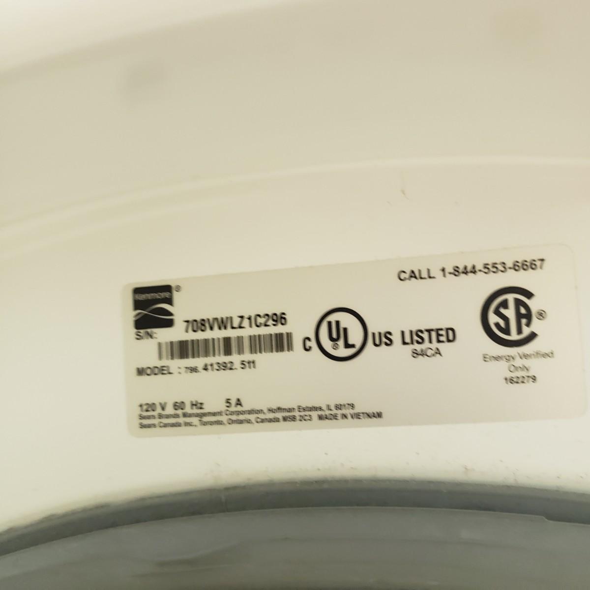 This is a Kenmore front loading washing machine. The washer measures 27" x 28" x 39"H. See pictures for model and serial numbers. Comes with owners manual and four feet. The washer powered on when plugged in, see pictures.