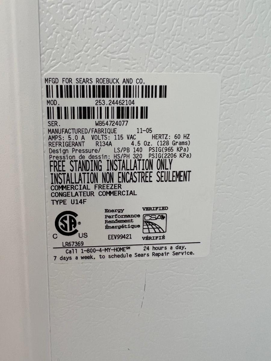 KENMORE U14F Frost free commercial freezer. Model 253.24462104