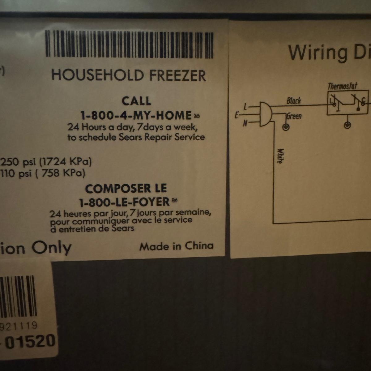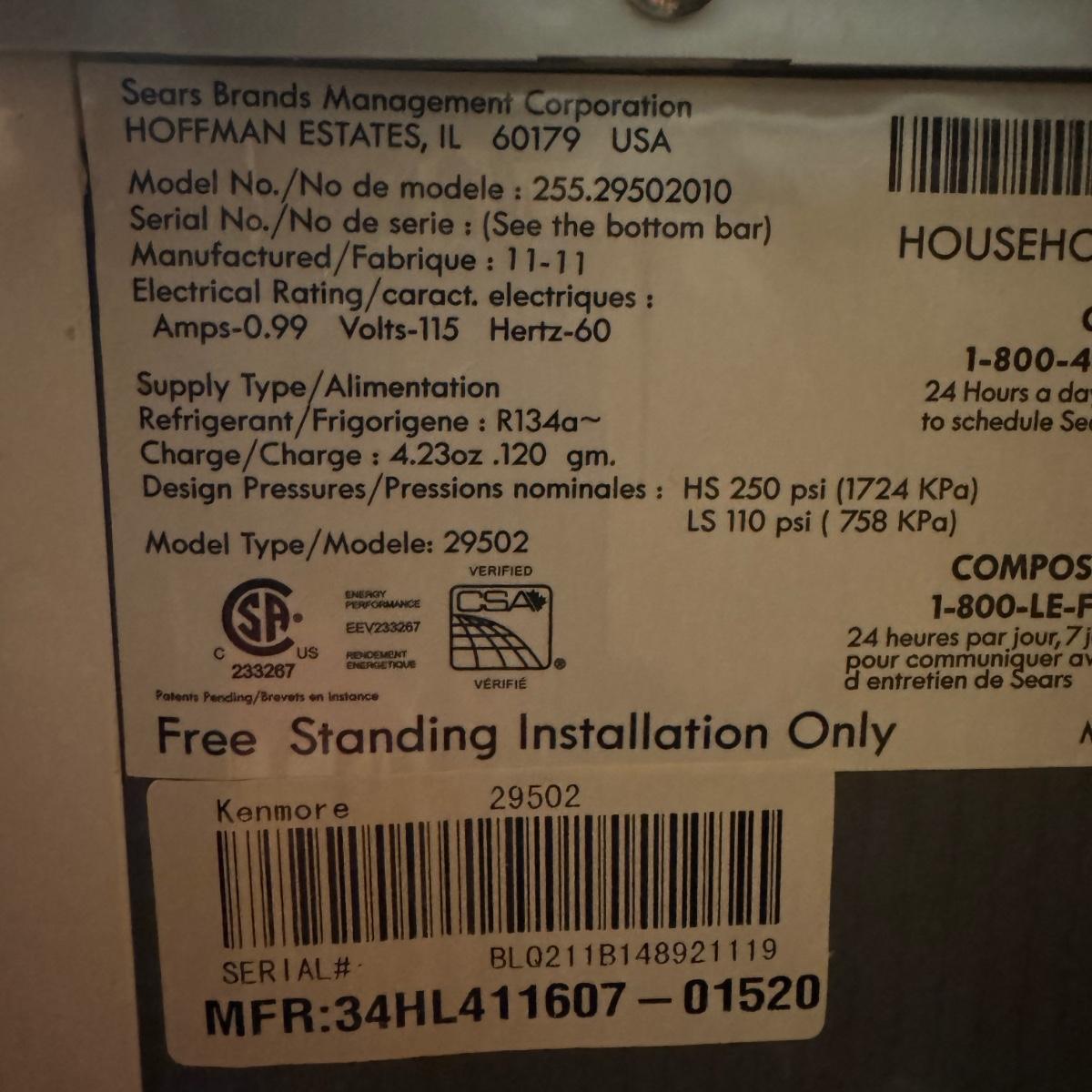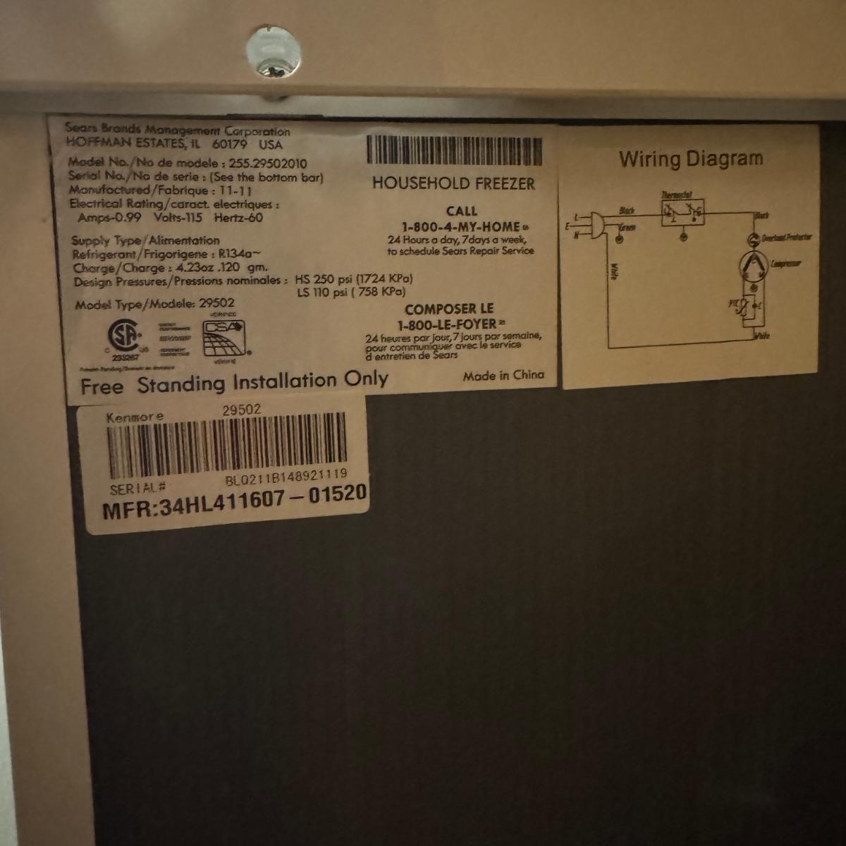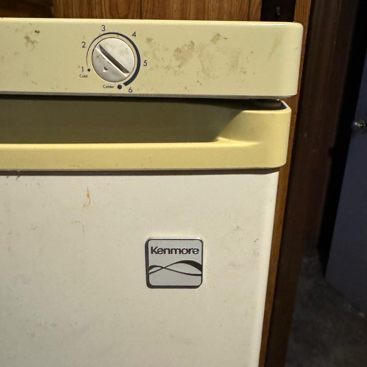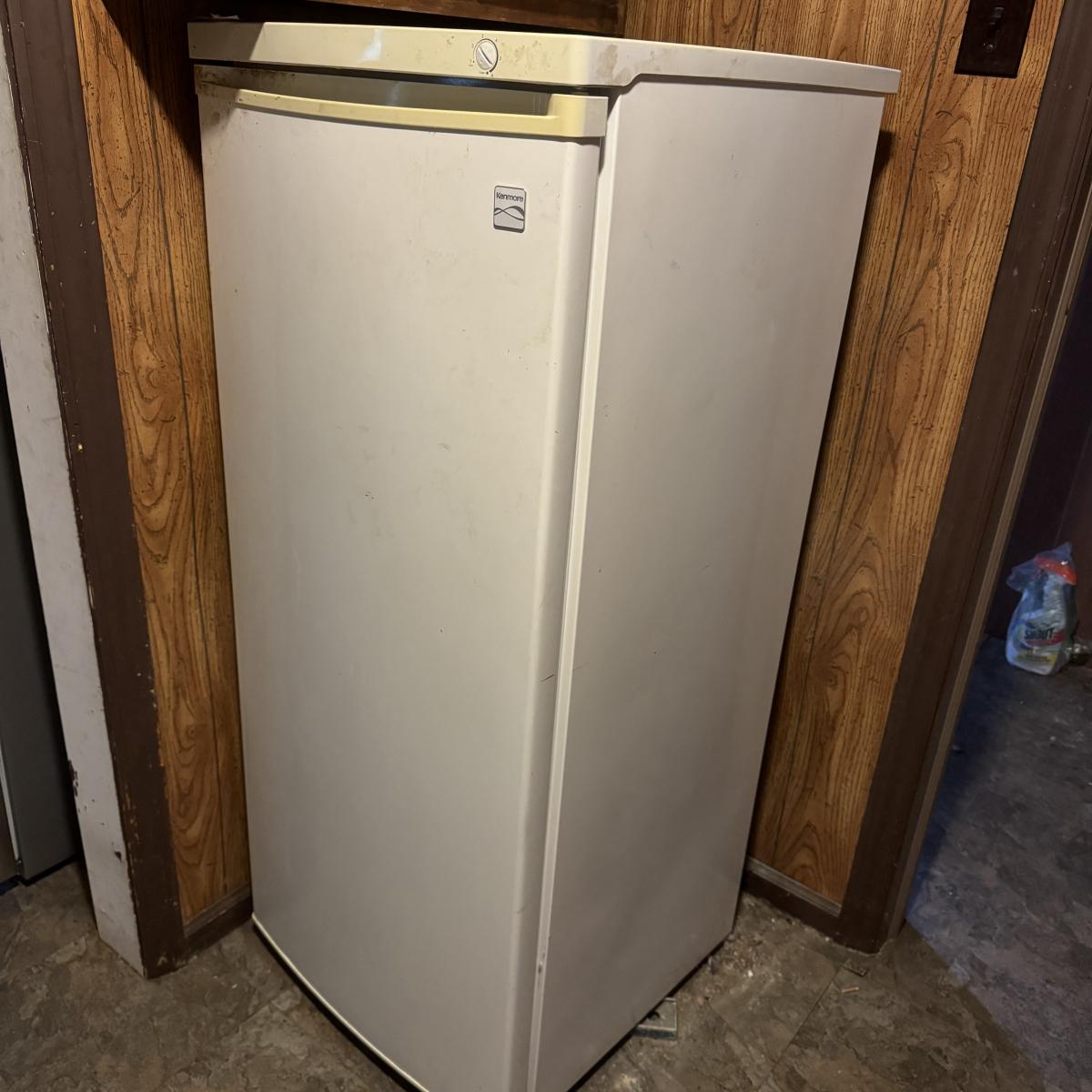 Freestanding household freezer by Kenmore. See photos for model number. Was cold when plugged in. Could use a cleaning. Measures 22” x 22.5” x 50”H. Local pick up only.