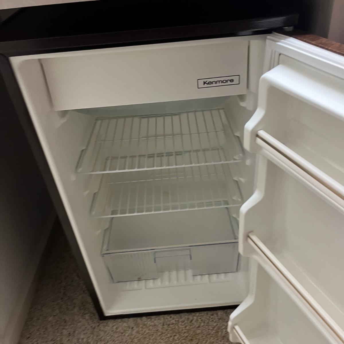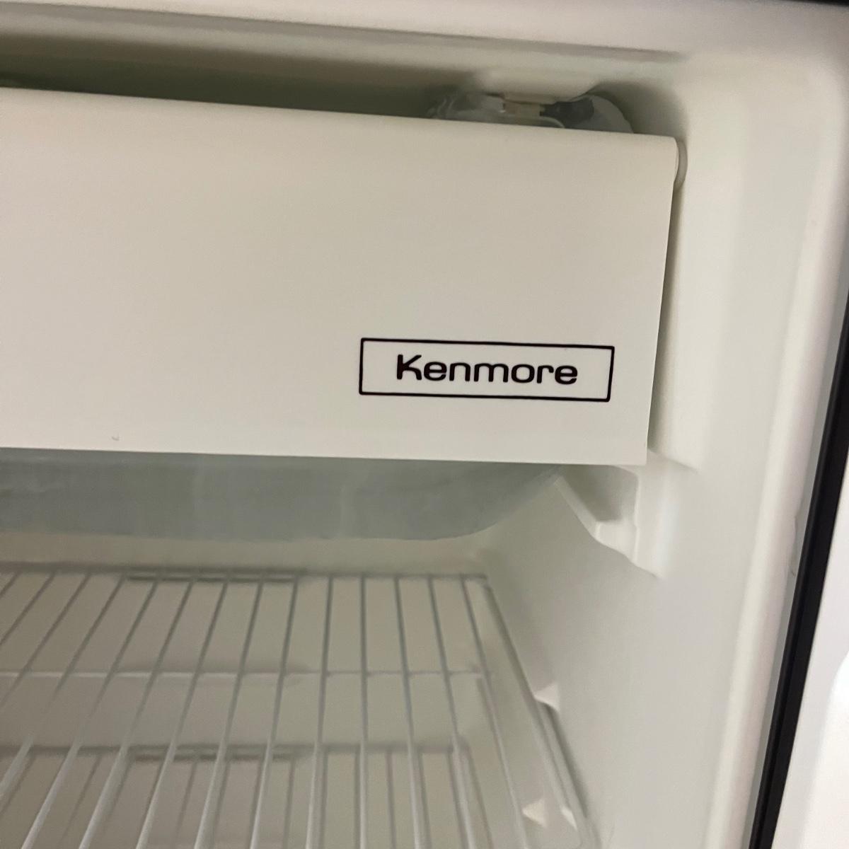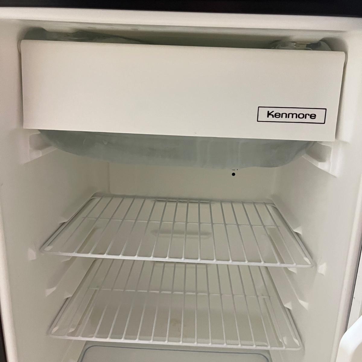 Lot includes a Magic Chef microwave that powered on when plugged in. Also includes a Kenmore mini refrigerator that powered on when plugged in. Freezer part of refrigerator has a build up of ice on bottom of freezer section, see pictures.