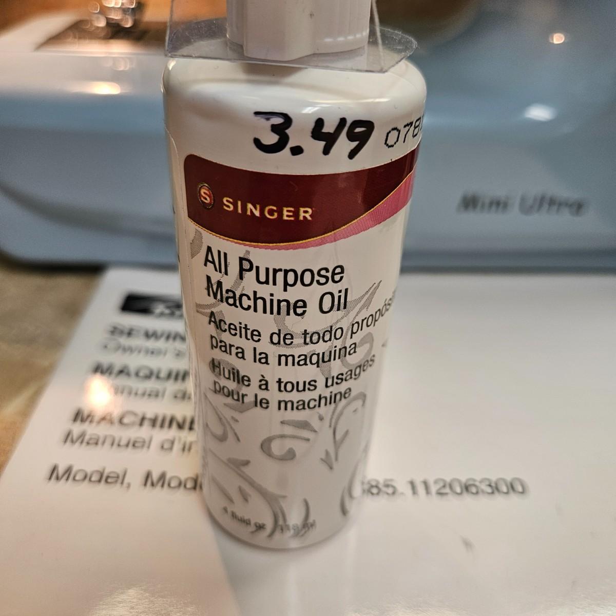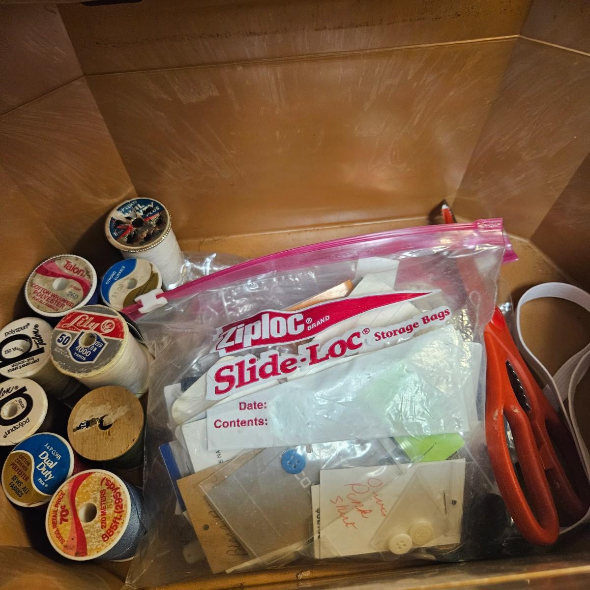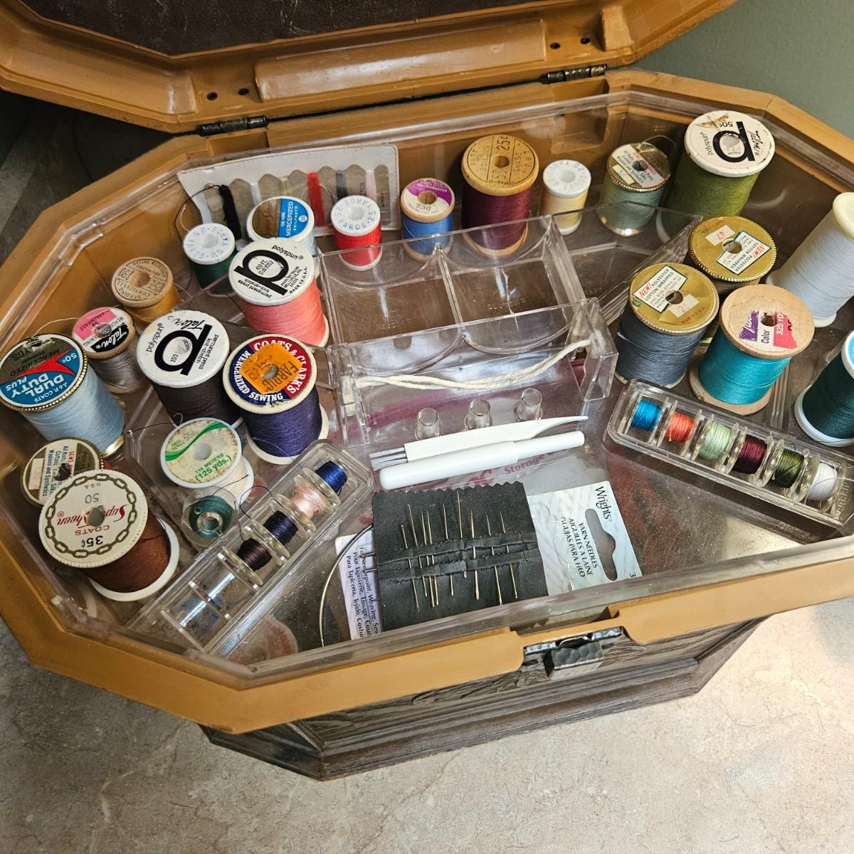 A Kenmore Mini Ultra sewing machine that powered on when plugged in. It measures approximately 13" x 5.5" x 10"H and includes a foot pedal, oil, and maintenance supplies. Also included is a plastic sewing box with thread, needles and more, as well as scrap fabric and edging, and a Stressless swing table. Shipping available