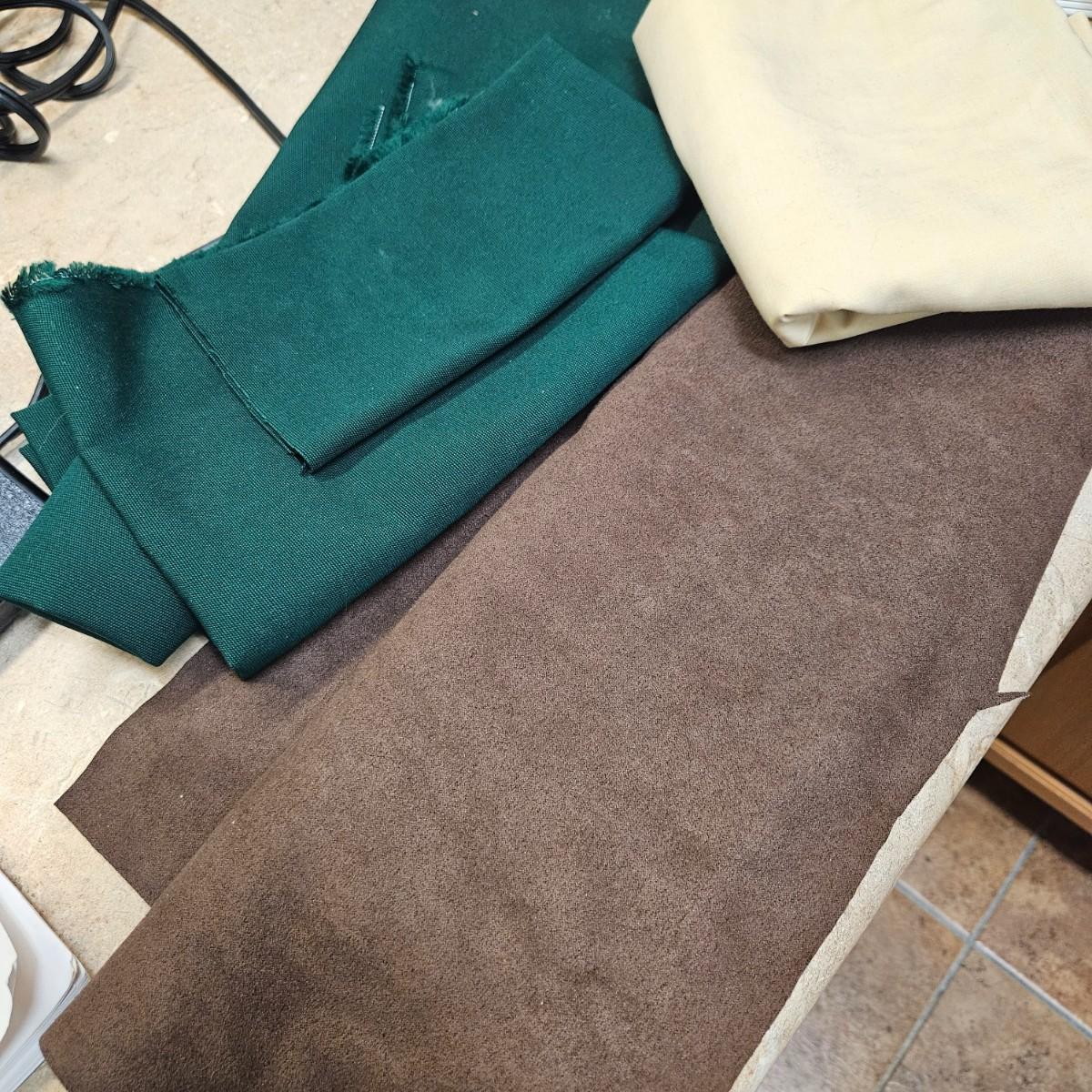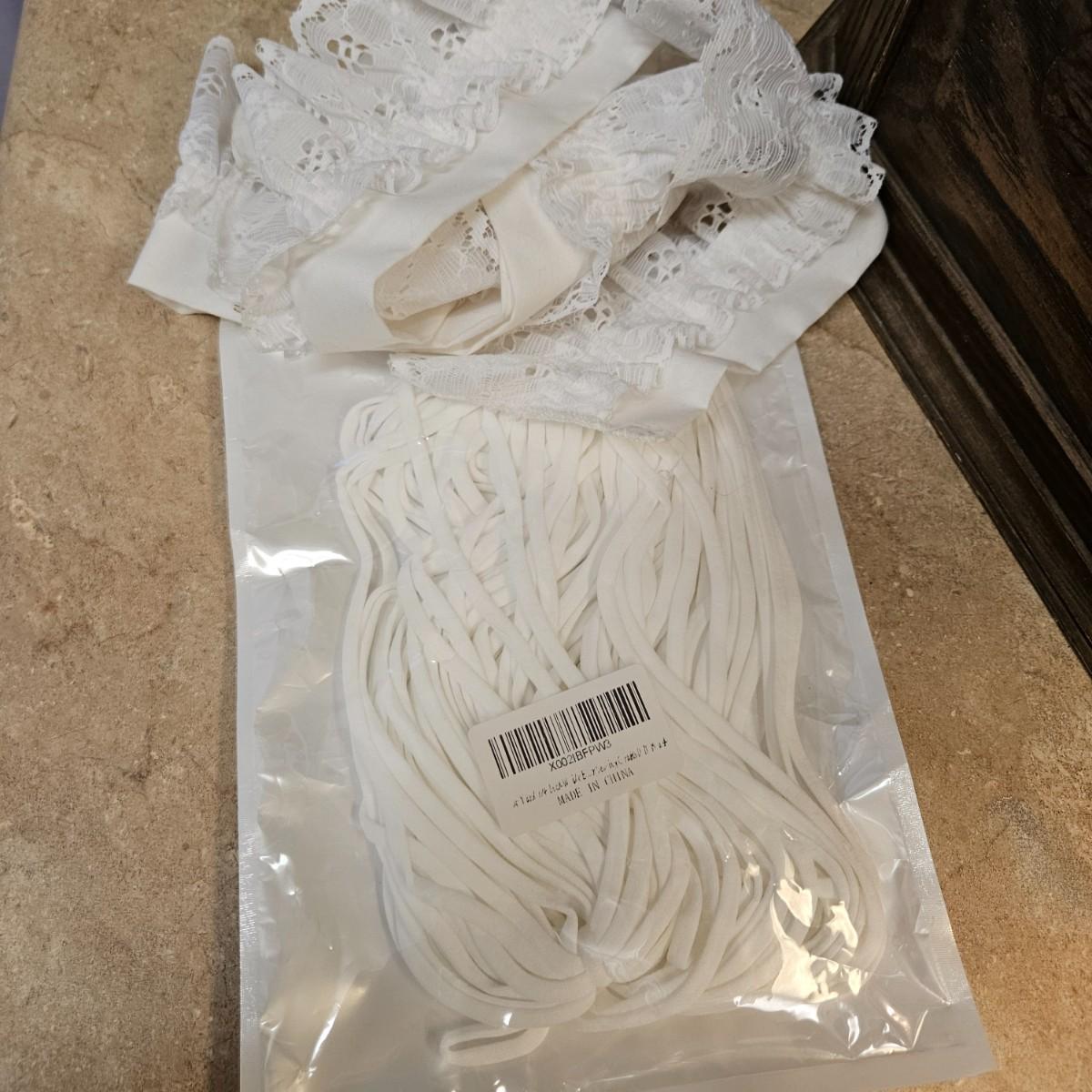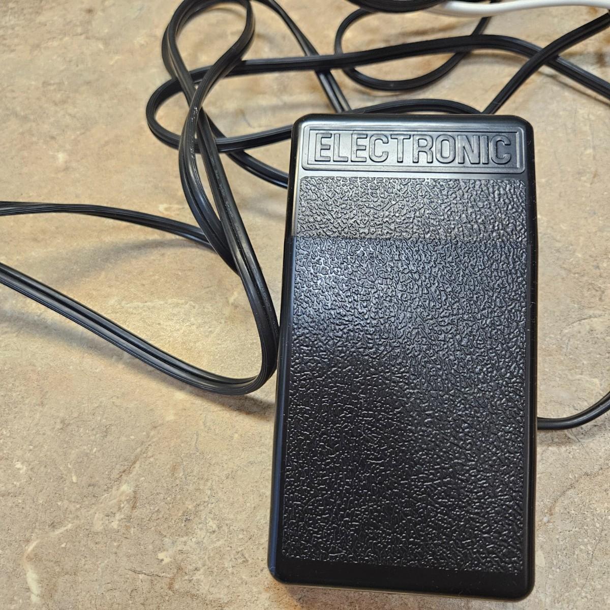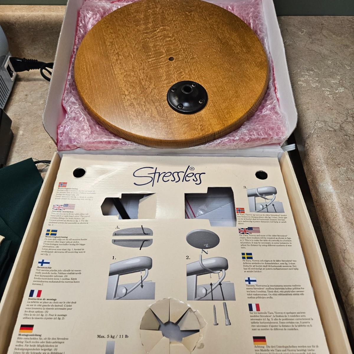 A Kenmore Mini Ultra sewing machine that powered on when plugged in. It measures approximately 13" x 5.5" x 10"H and includes a foot pedal, oil, and maintenance supplies. Also included is a plastic sewing box with thread, needles and more, as well as scrap fabric and edging, and a Stressless swing table. Shipping available
