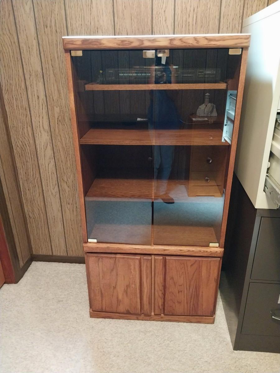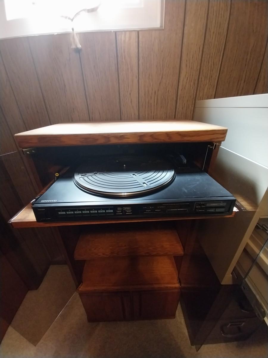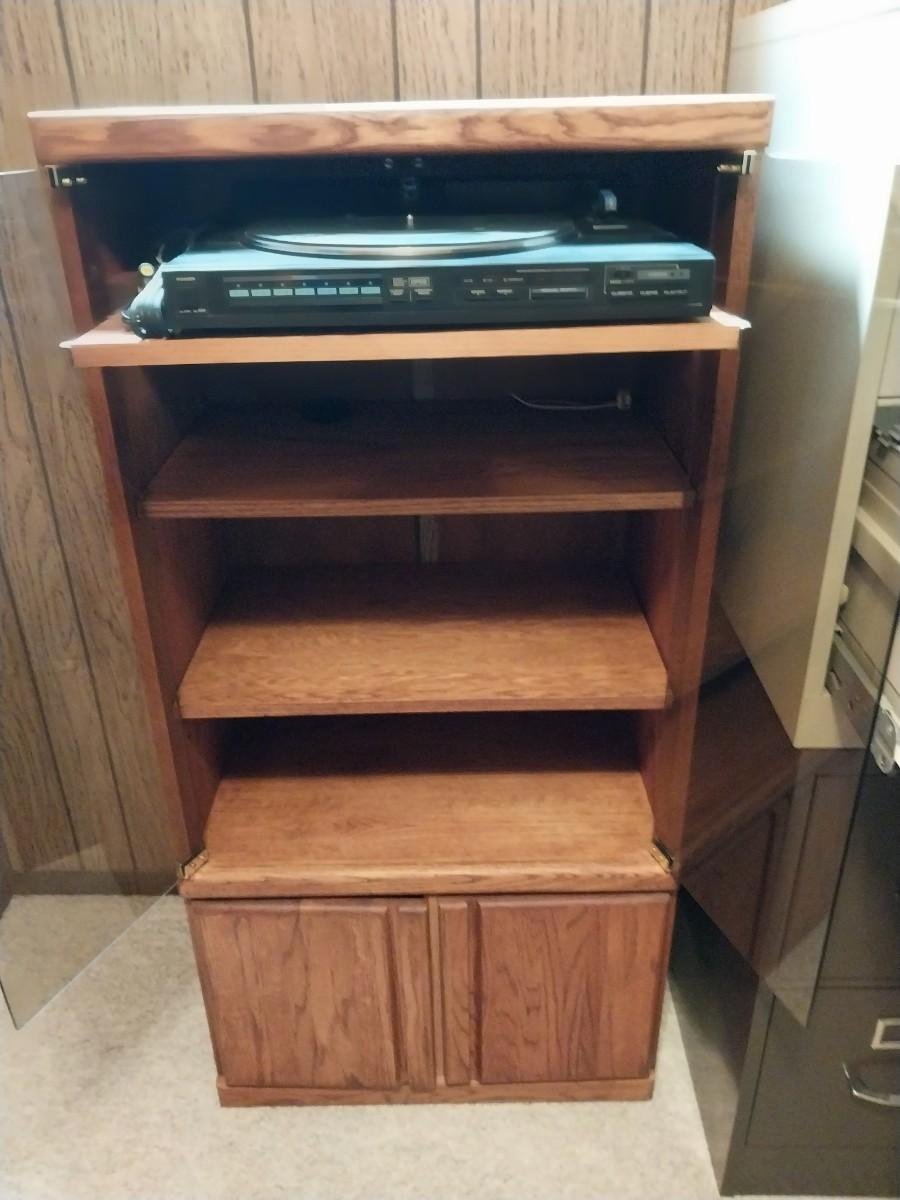 KENMORE RECORD PLAYER AND GLASS FRONT STEREO CABINET WITH STORAGE