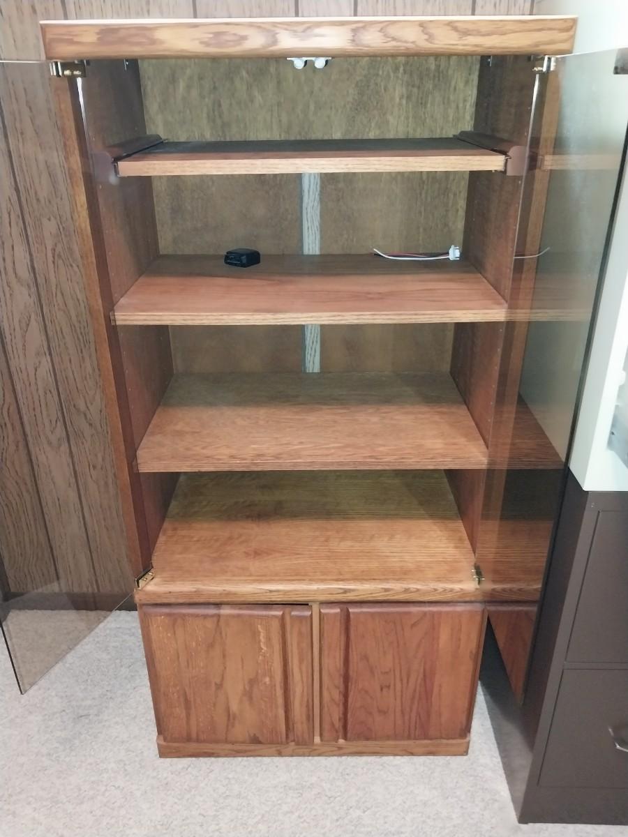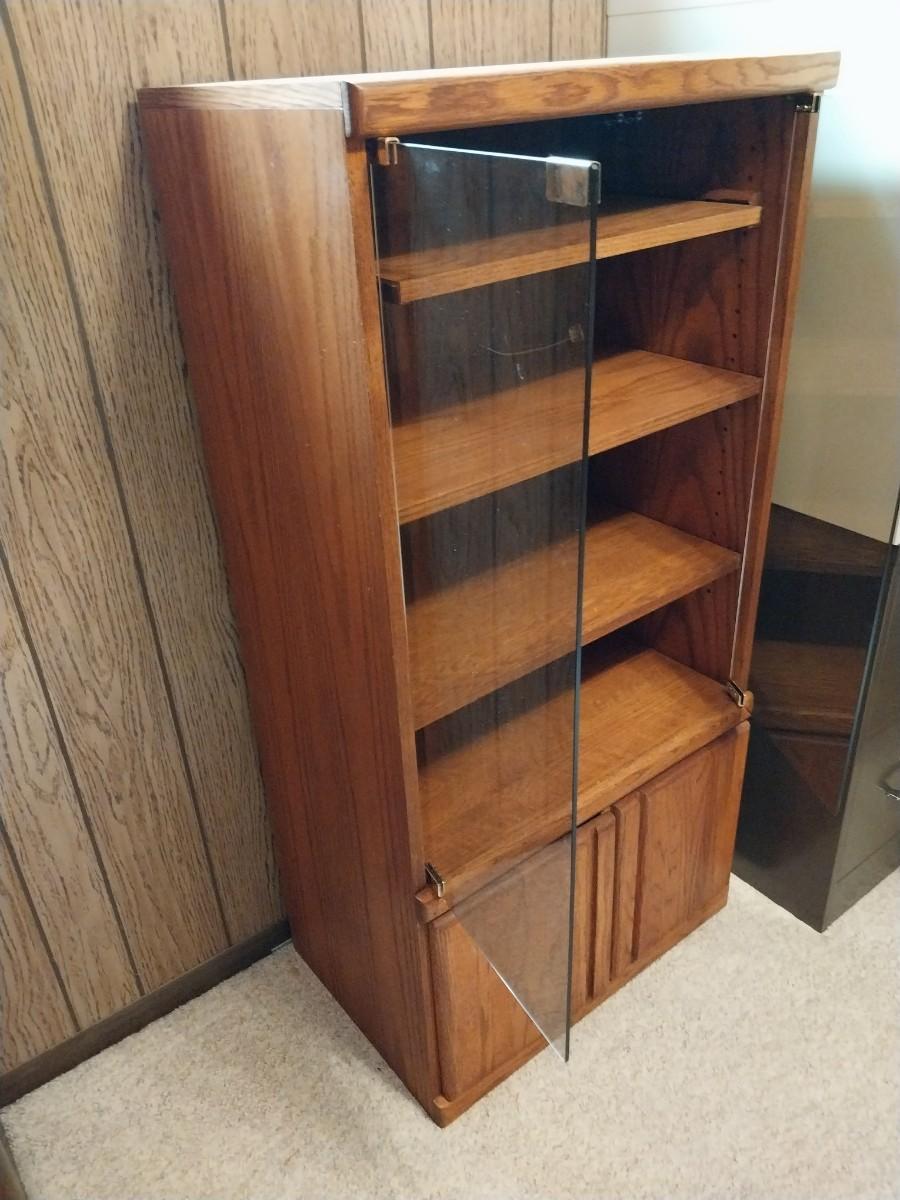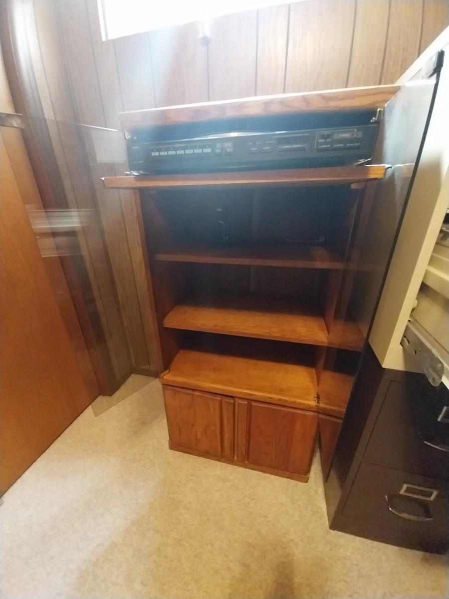 KENMORE RECORD PLAYER AND GLASS FRONT STEREO CABINET WITH STORAGE