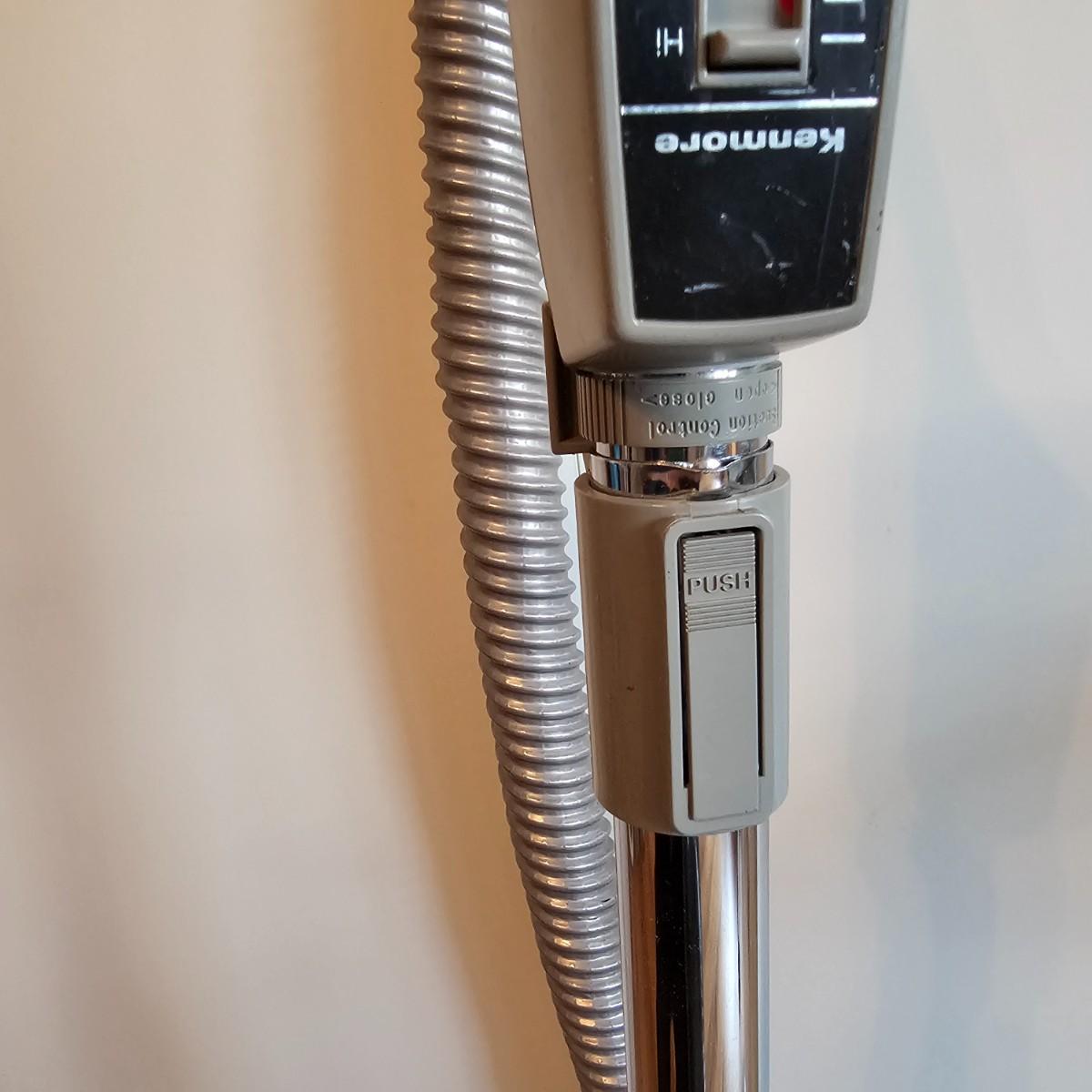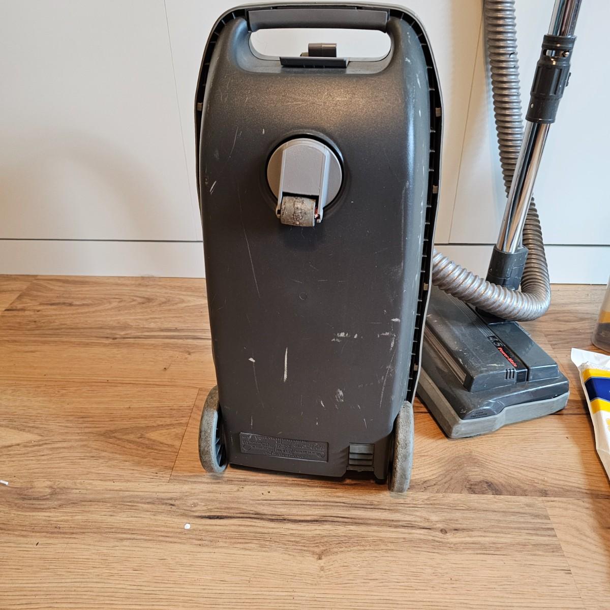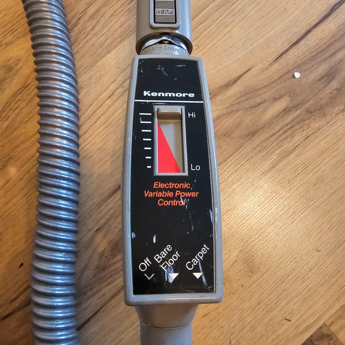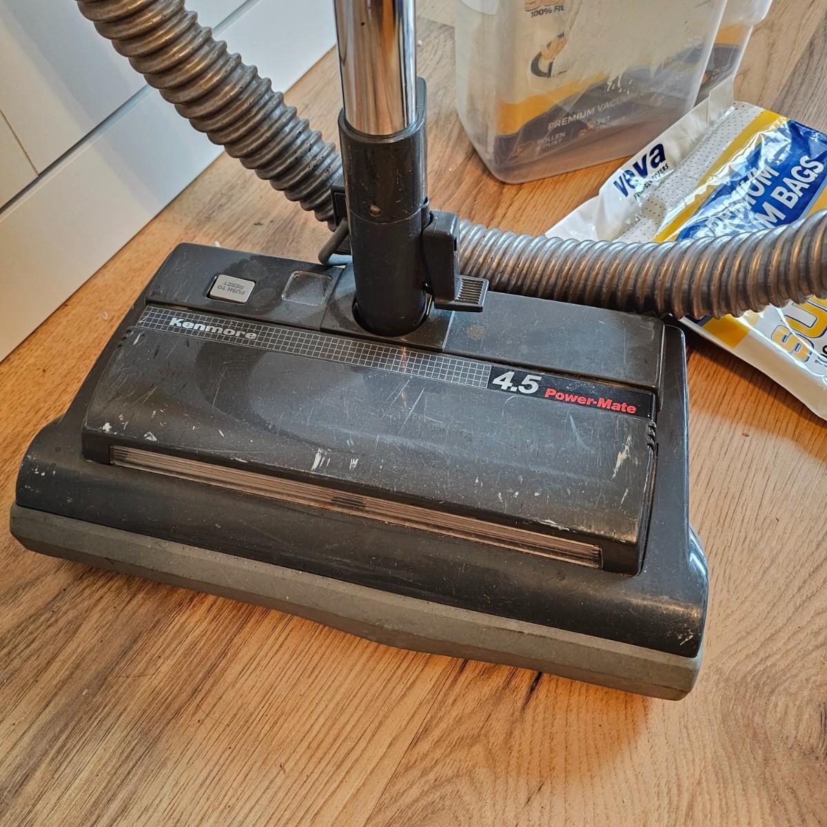 A Kenmore floor model vacuum with powerhead, extra bags and more. Unit rolls flat on wheels or can stand upright. Canister measures 9" x 10" x 22"H, comes with three packages of replacement bags. Unit powered on when plugged in. Some scratches on case and hose has been taped. See photos for details. Local pickup only.