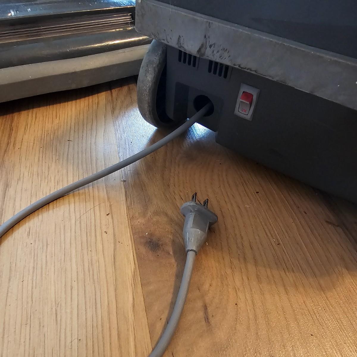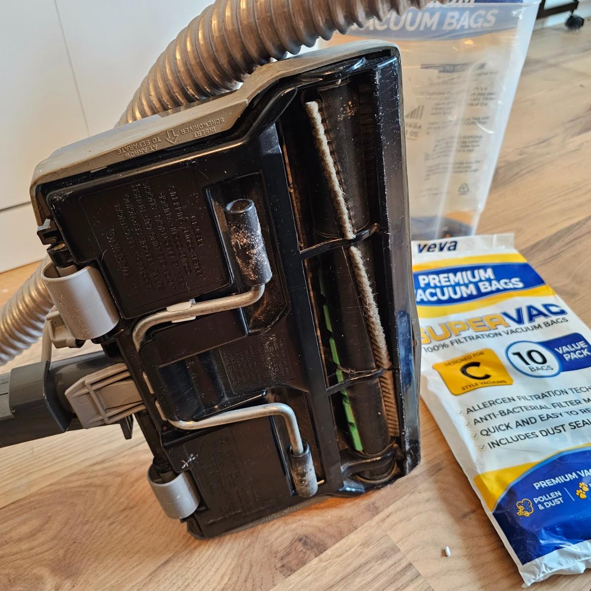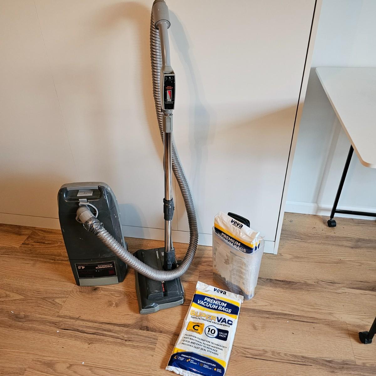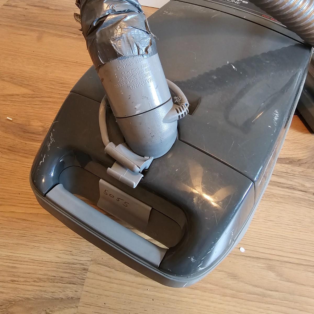 A Kenmore floor model vacuum with powerhead, extra bags and more. Unit rolls flat on wheels or can stand upright. Canister measures 9" x 10" x 22"H, comes with three packages of replacement bags. Unit powered on when plugged in. Some scratches on case and hose has been taped. See photos for details. Local pickup only.