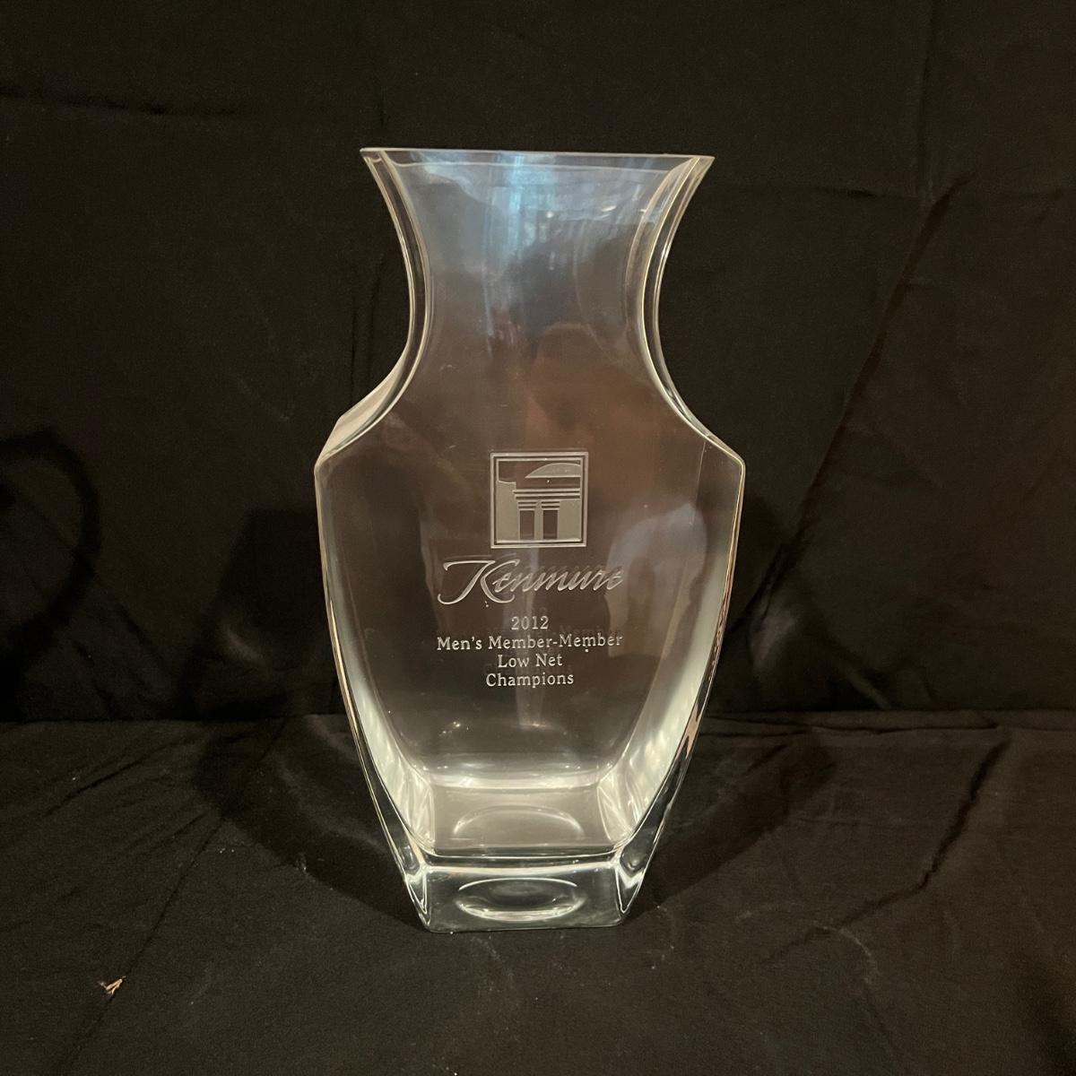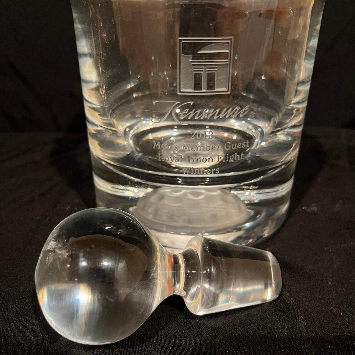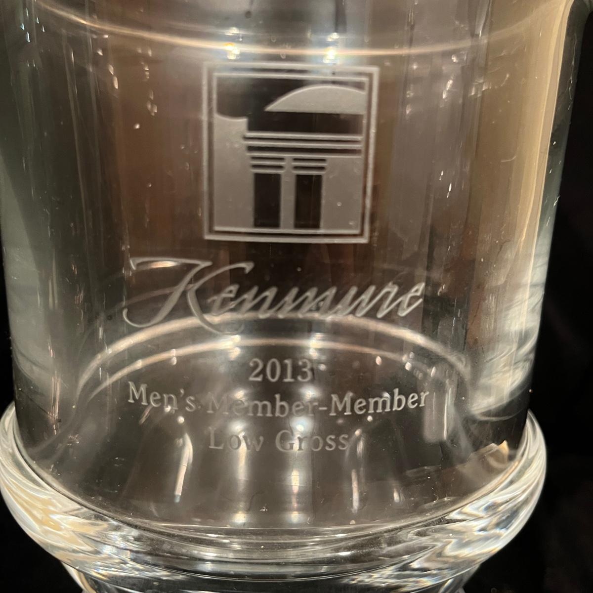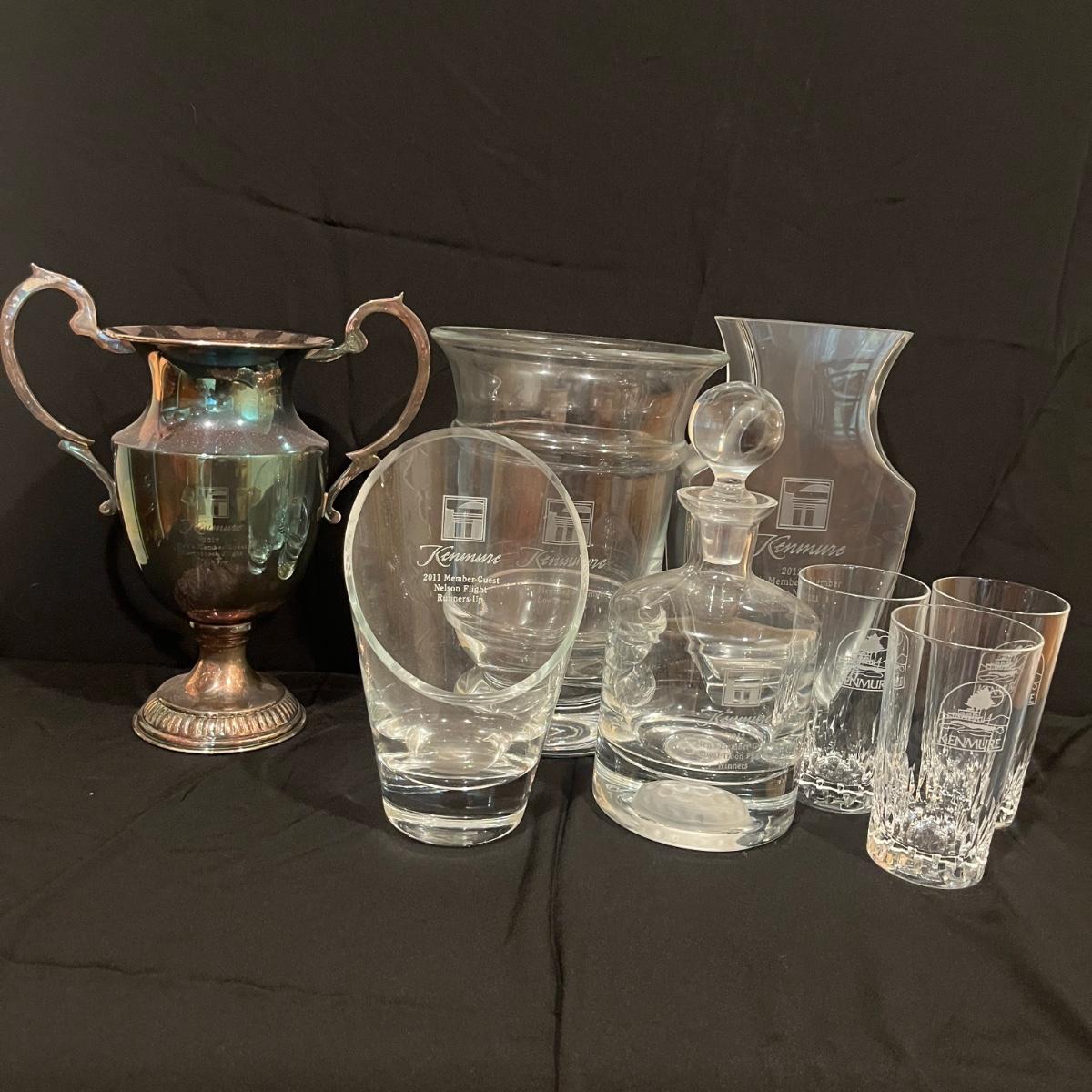 Lot contains Kenmure golf trophies that includes a glass vase, glass bottle with stopper, champagne holder, three JG Dunbar glasses and a silverplate urn. Vase measures 6” x 3” x 11.5”H.