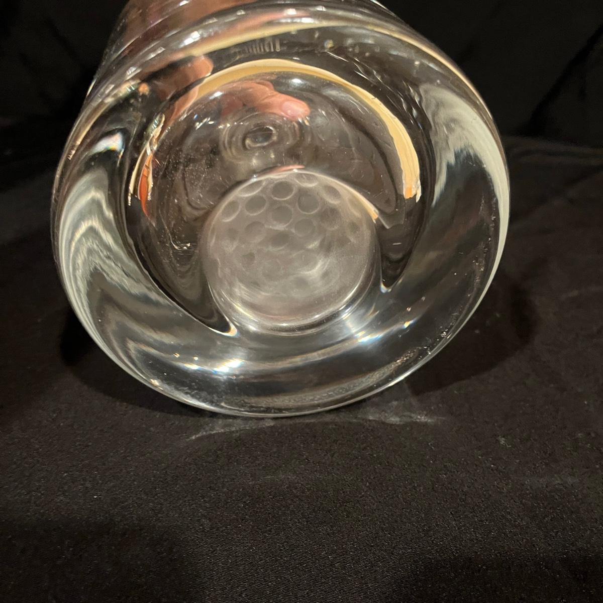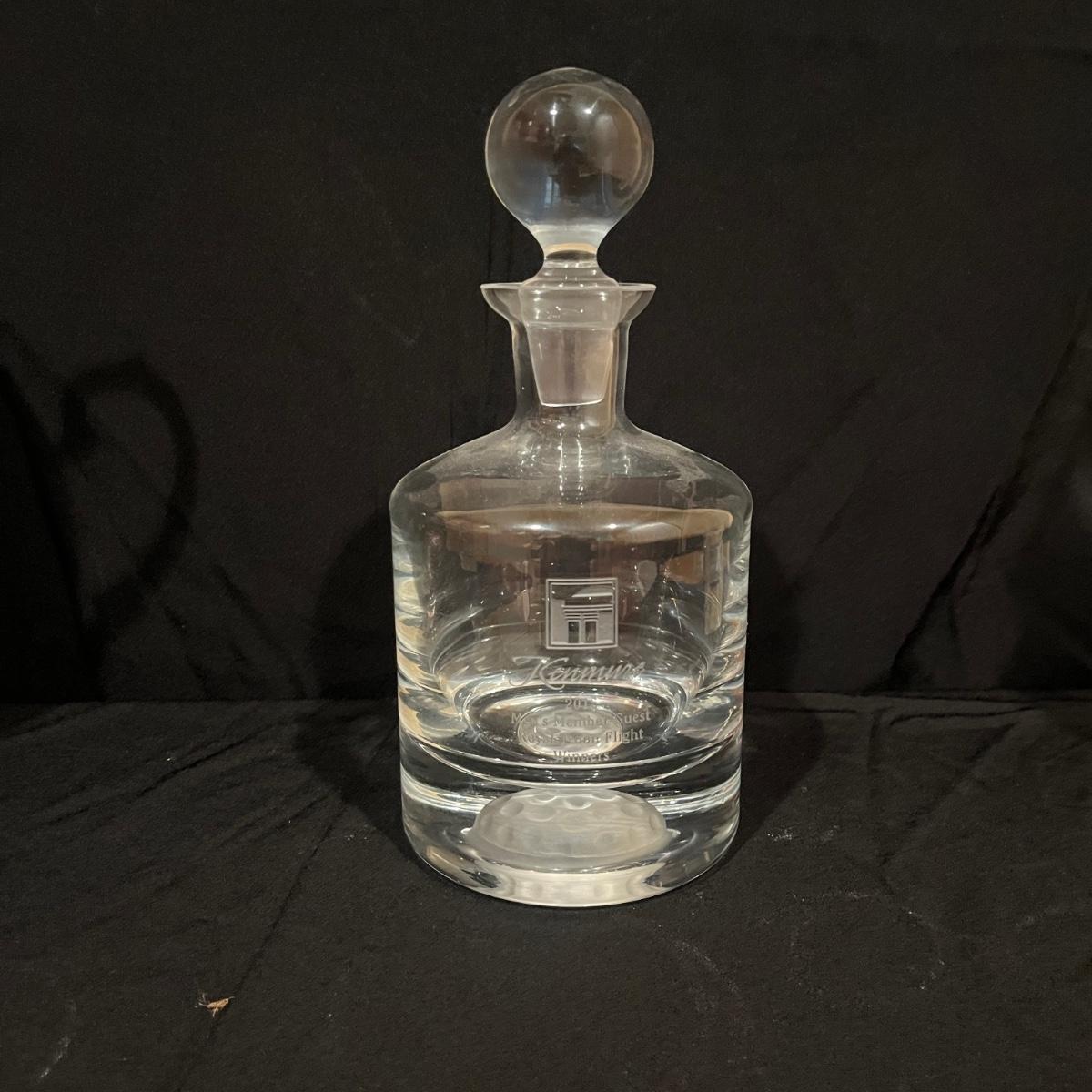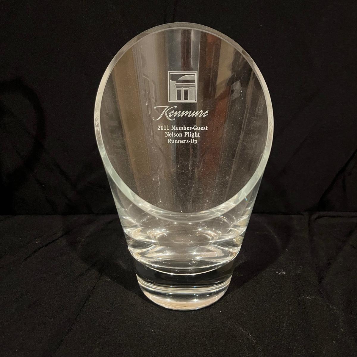 Lot contains Kenmure golf trophies that includes a glass vase, glass bottle with stopper, champagne holder, three JG Dunbar glasses and a silverplate urn. Vase measures 6” x 3” x 11.5”H.