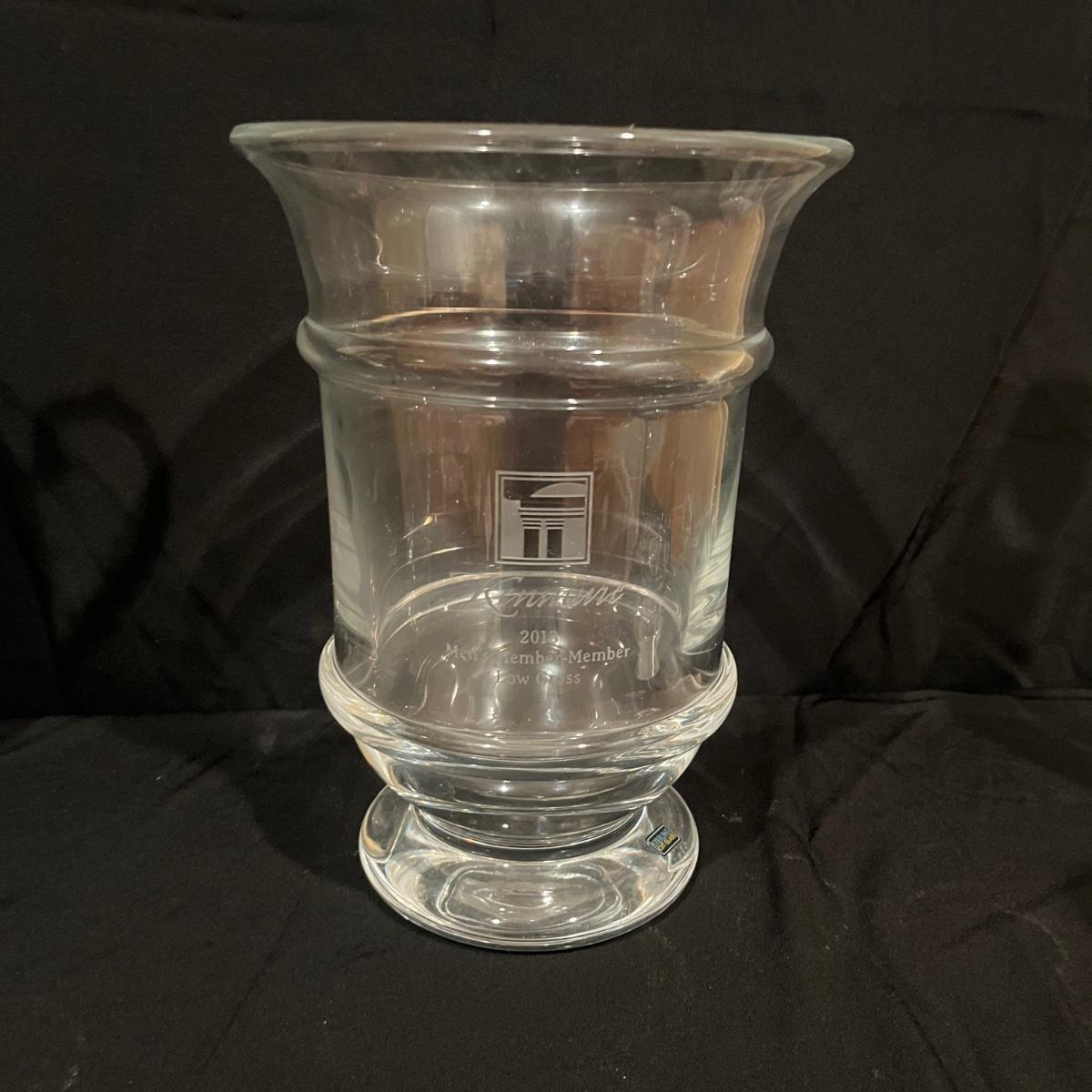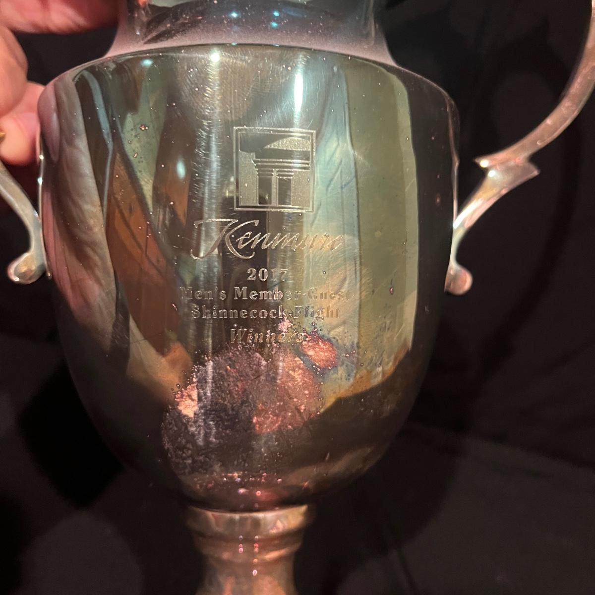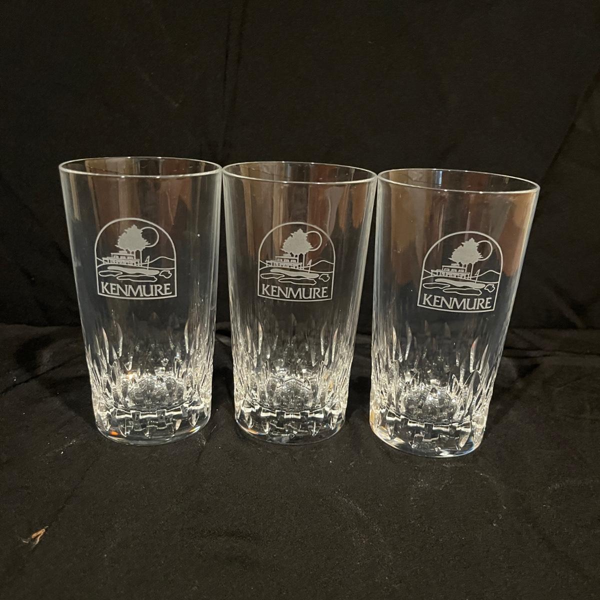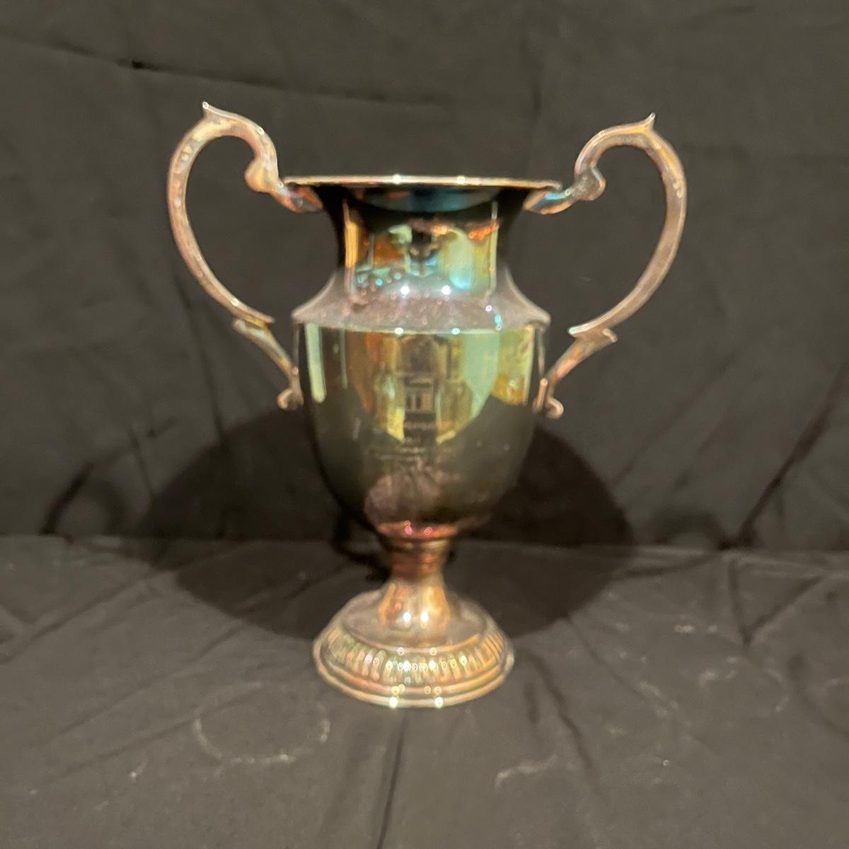 Lot contains Kenmure golf trophies that includes a glass vase, glass bottle with stopper, champagne holder, three JG Dunbar glasses and a silverplate urn. Vase measures 6” x 3” x 11.5”H.