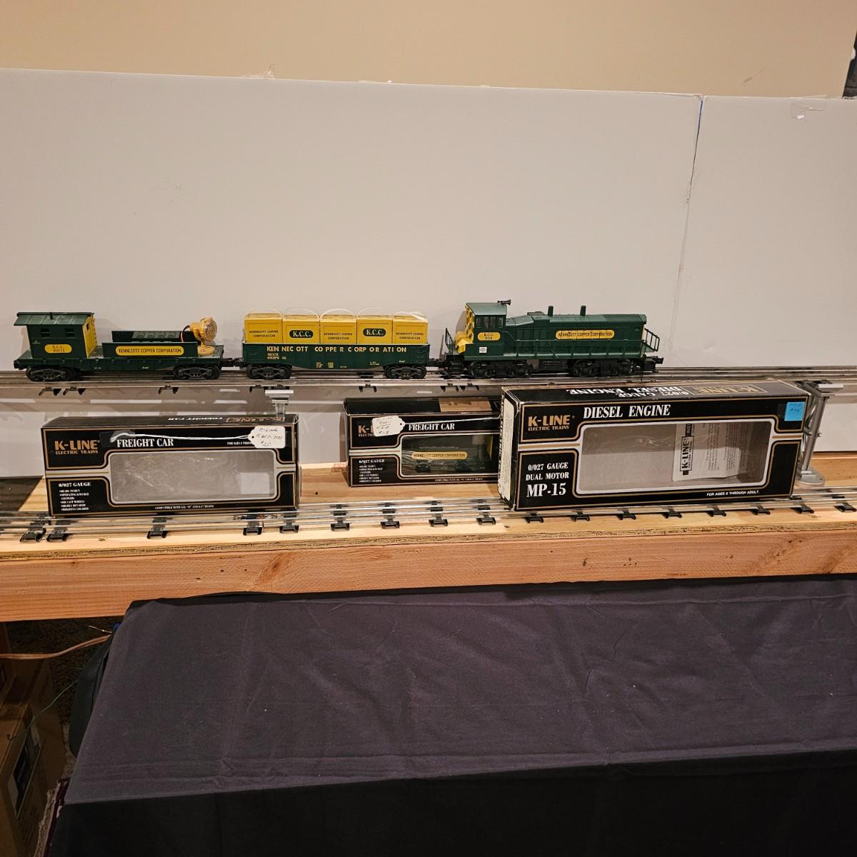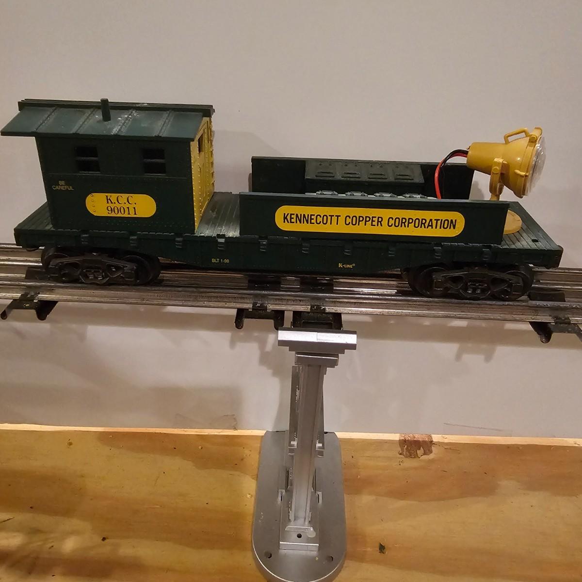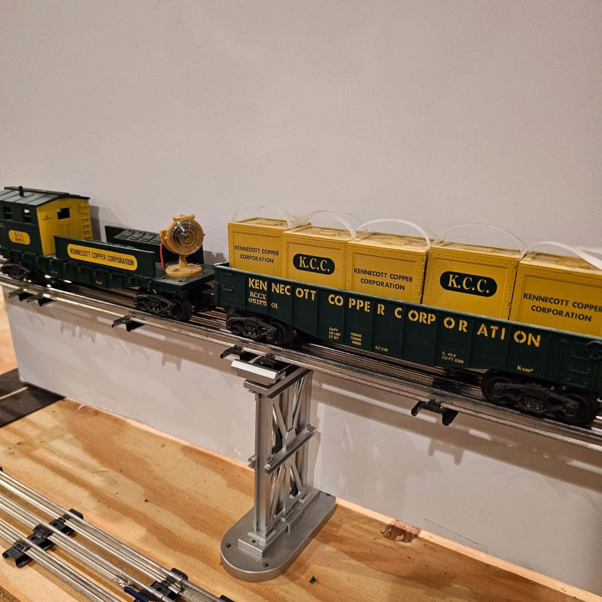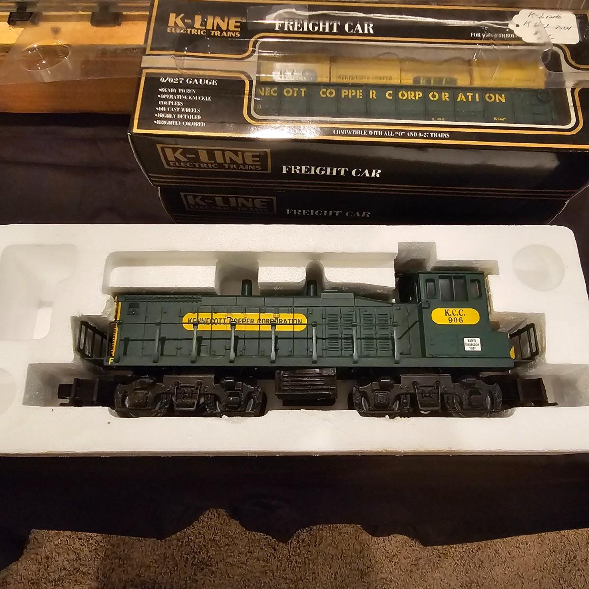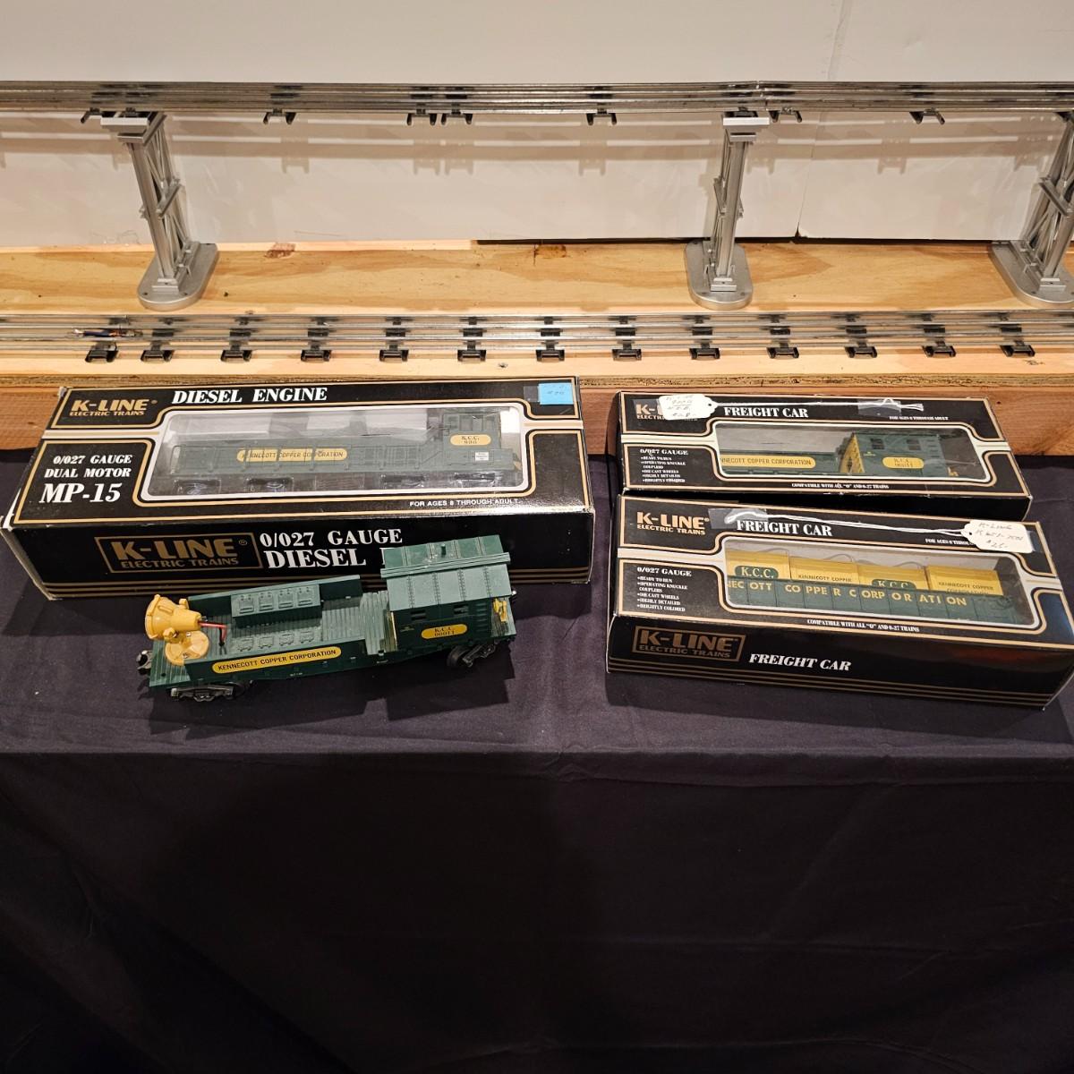 Four piece set by K-Line of the Kennecot Copper Corp. line. One MP 15 diesel switcher with dual motors and 8 wheel drive. One gondola with crates and lifting straps. Two MOW cars with searchlights. Engine measures 12" long. Items untested. Three in original boxes and one not. O gauge. See photos for details. Shipping available. Please note that any price tag seen on an item was not put there by Sterling Transitions and does not reflect the current value of the item.