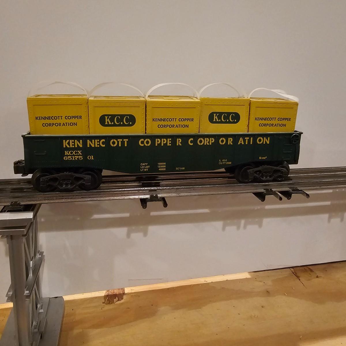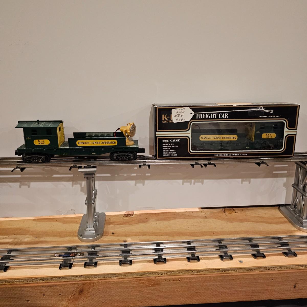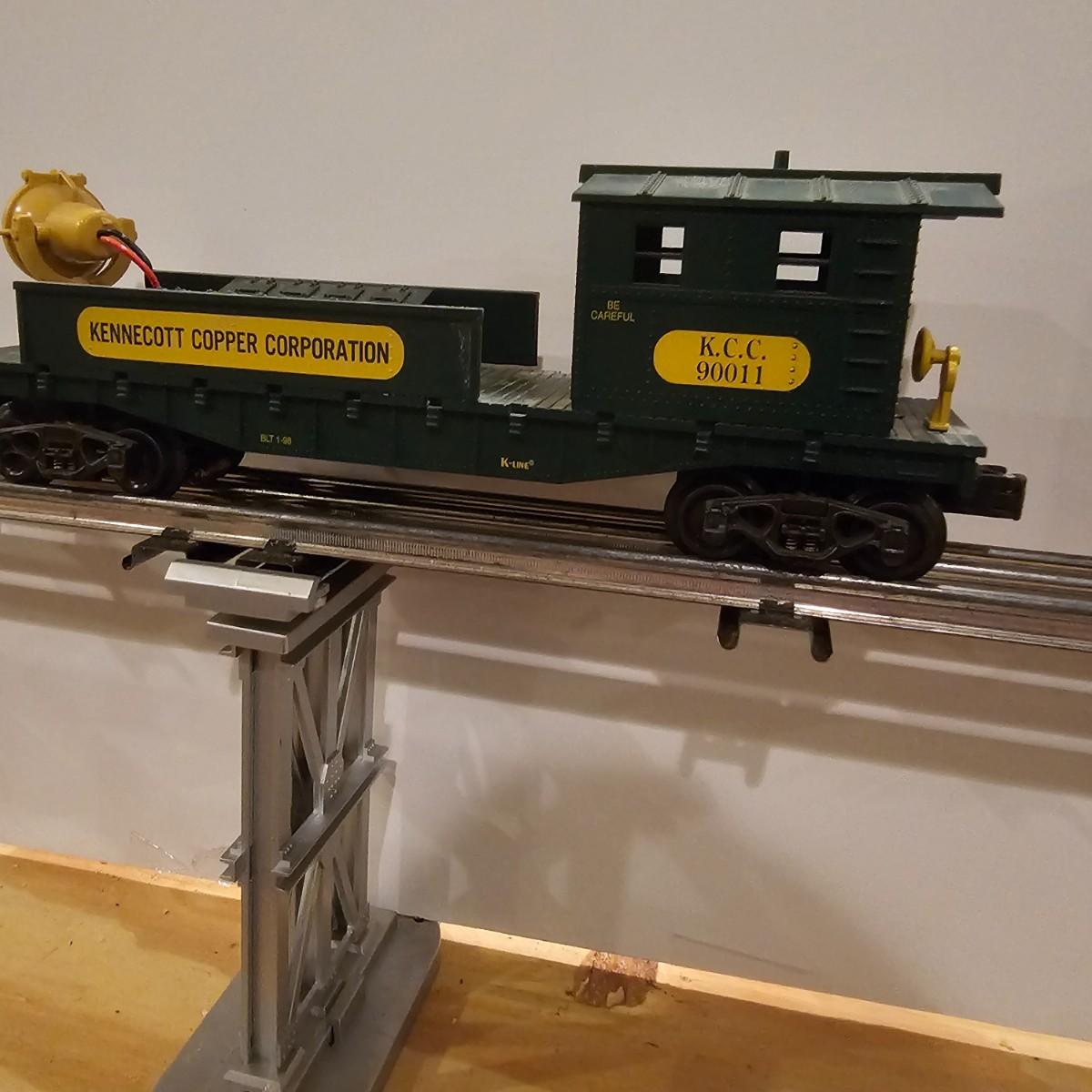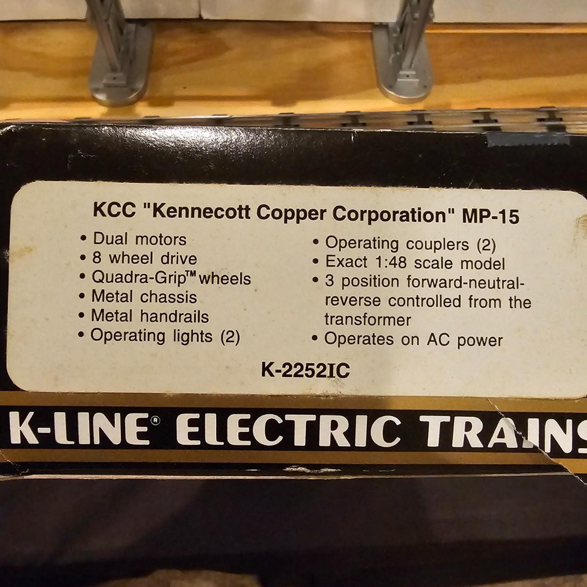 Four piece set by K-Line of the Kennecot Copper Corp. line. One MP 15 diesel switcher with dual motors and 8 wheel drive. One gondola with crates and lifting straps. Two MOW cars with searchlights. Engine measures 12" long. Items untested. Three in original boxes and one not. O gauge. See photos for details. Shipping available. Please note that any price tag seen on an item was not put there by Sterling Transitions and does not reflect the current value of the item.