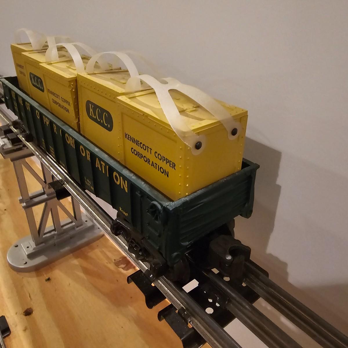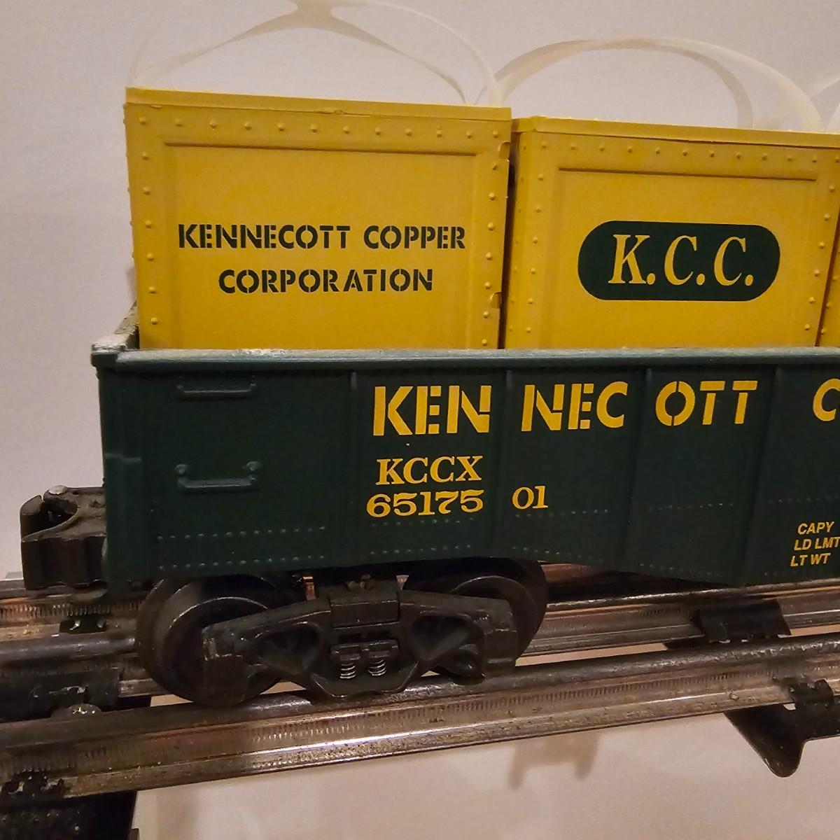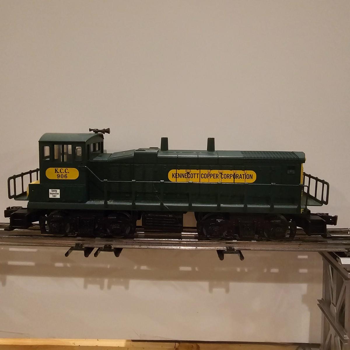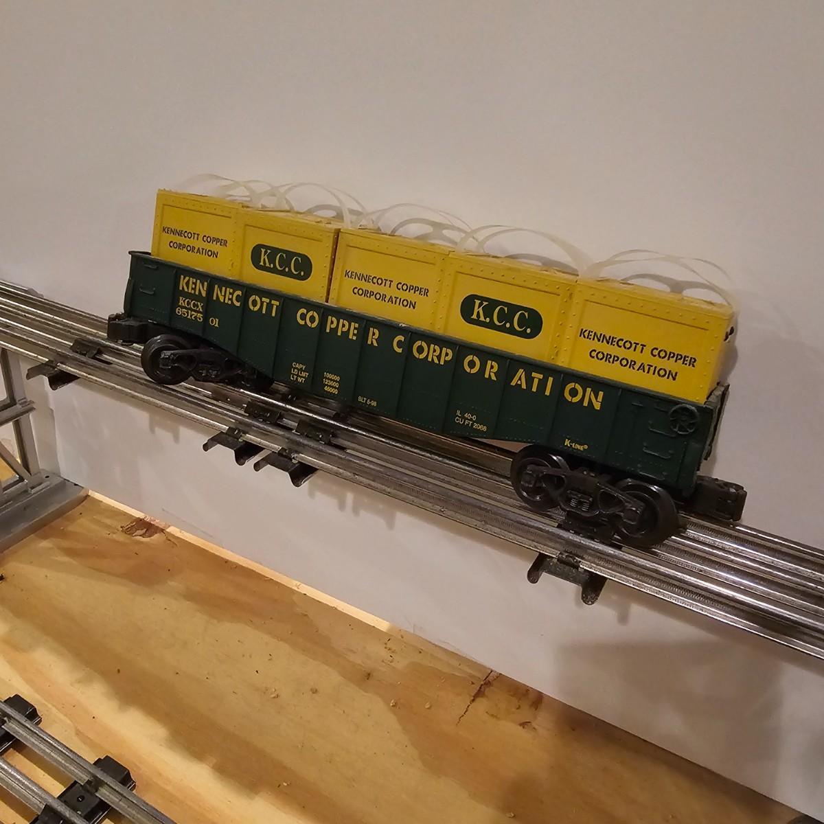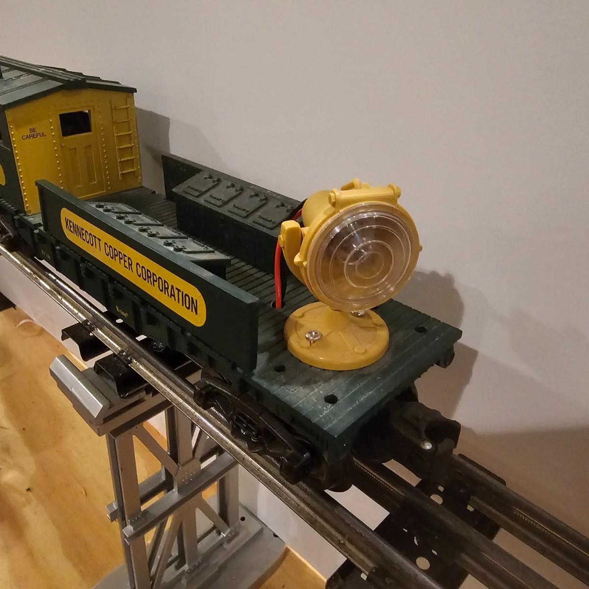 Four piece set by K-Line of the Kennecot Copper Corp. line. One MP 15 diesel switcher with dual motors and 8 wheel drive. One gondola with crates and lifting straps. Two MOW cars with searchlights. Engine measures 12" long. Items untested. Three in original boxes and one not. O gauge. See photos for details. Shipping available. Please note that any price tag seen on an item was not put there by Sterling Transitions and does not reflect the current value of the item.