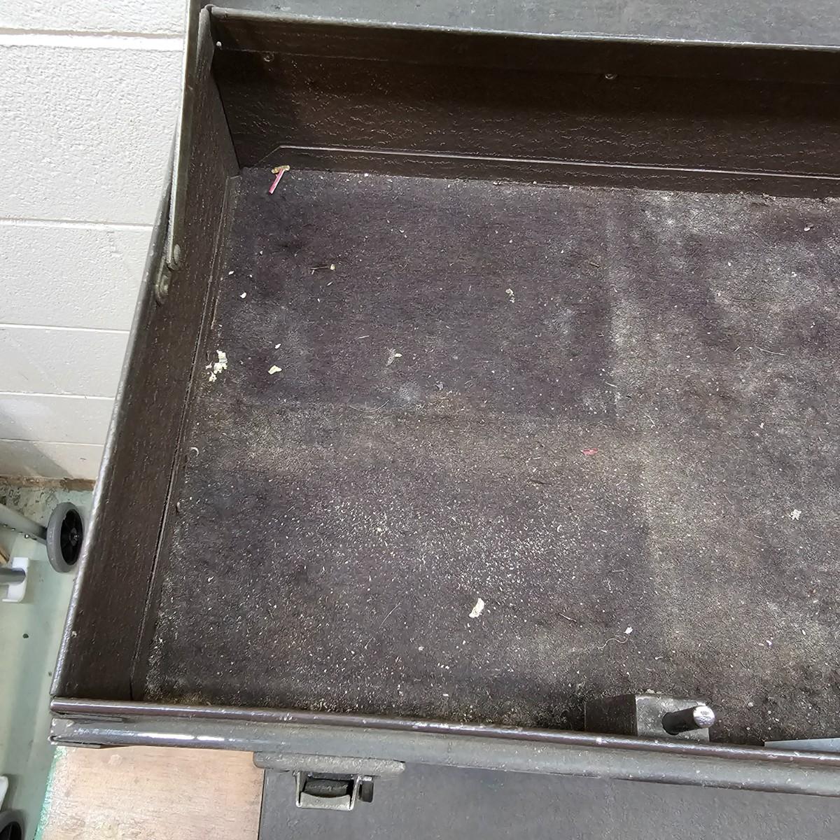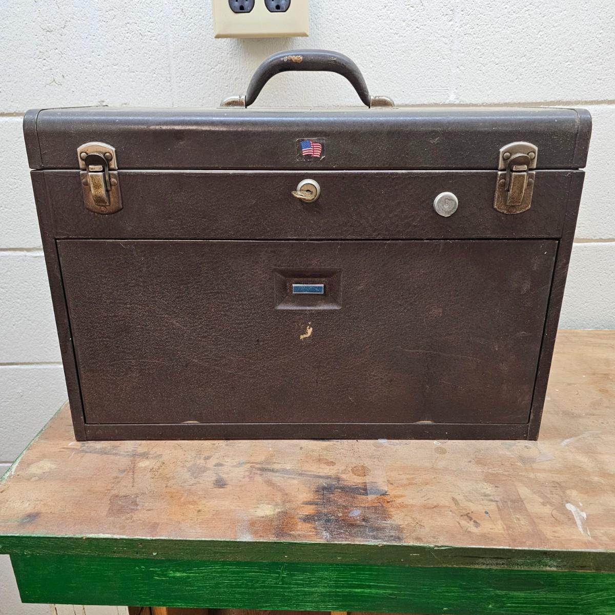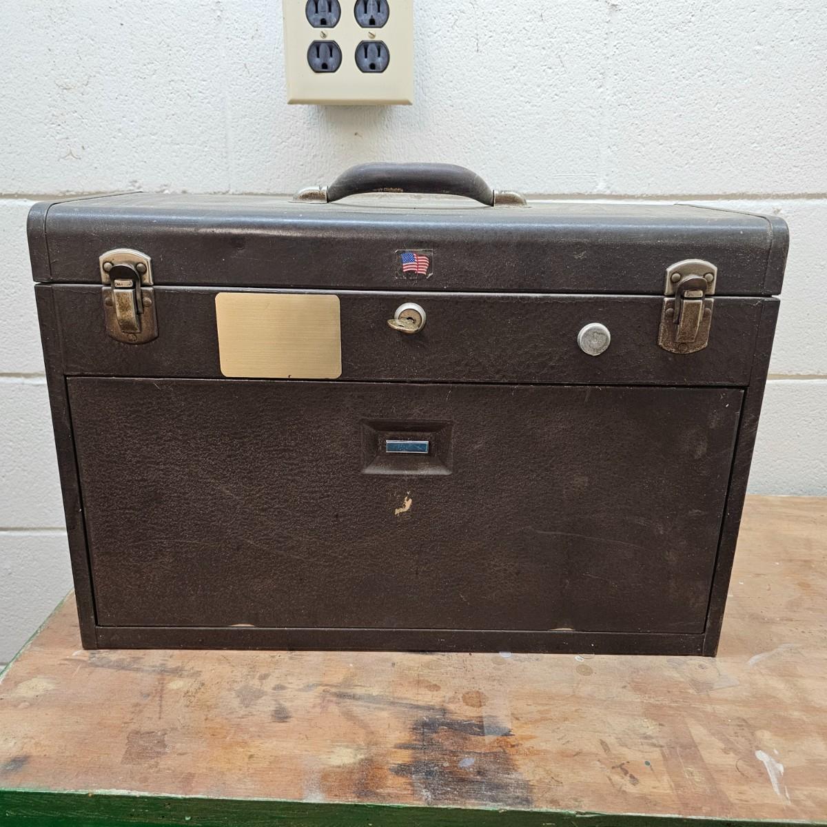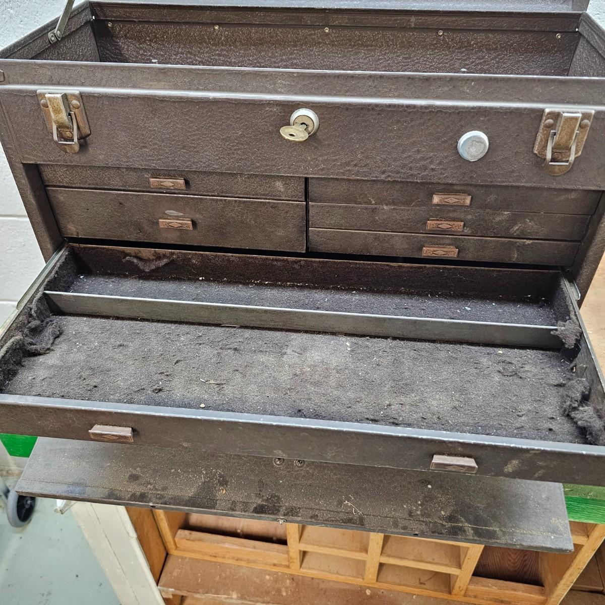 Kennedy Model 520 steel toolbox with padded drawers, ball bearing slides and more. Front of toolbox drops underneath to reveal two full length drawers and five half-width drawers. Some drawers have dividers in place. Soft lining material inside is in need of cleaning or replacement. Toolbox measures 20" x 8.5" x 14"H, has carry handle on lid and locking with key. Also includes some conversion charts and measurement data sheets. See photos for details. Local pickup only.