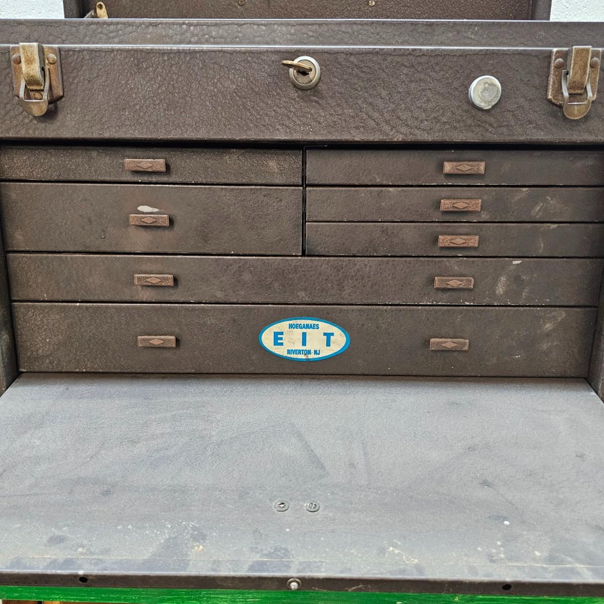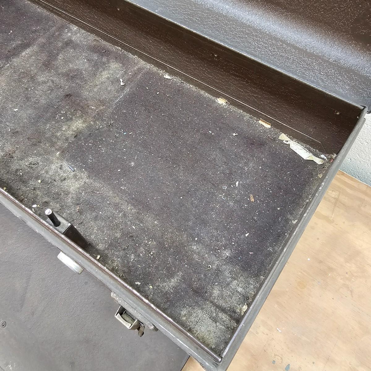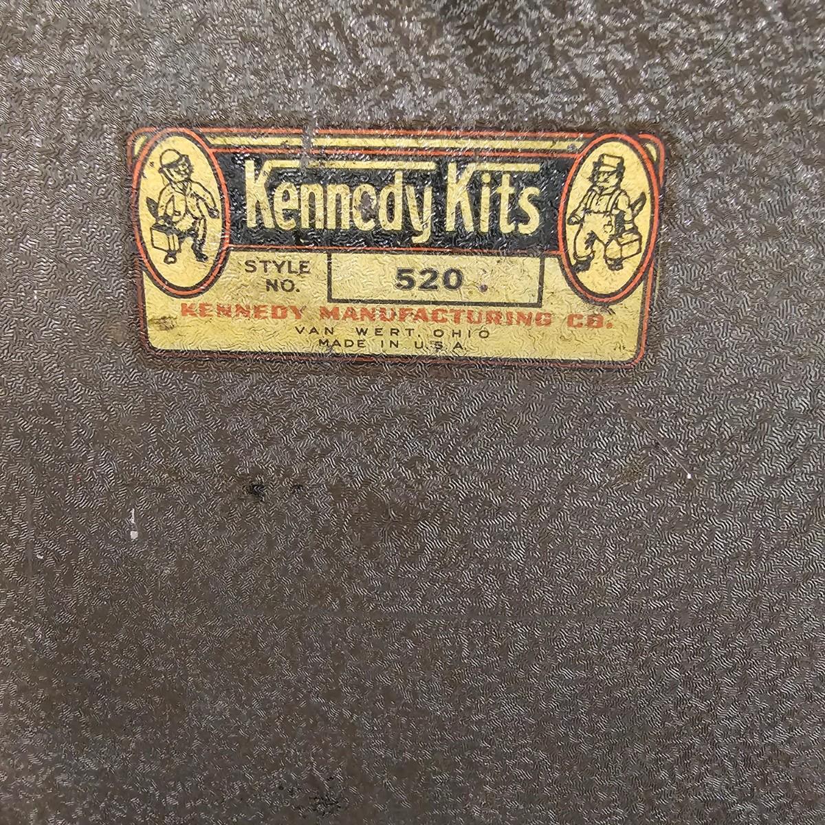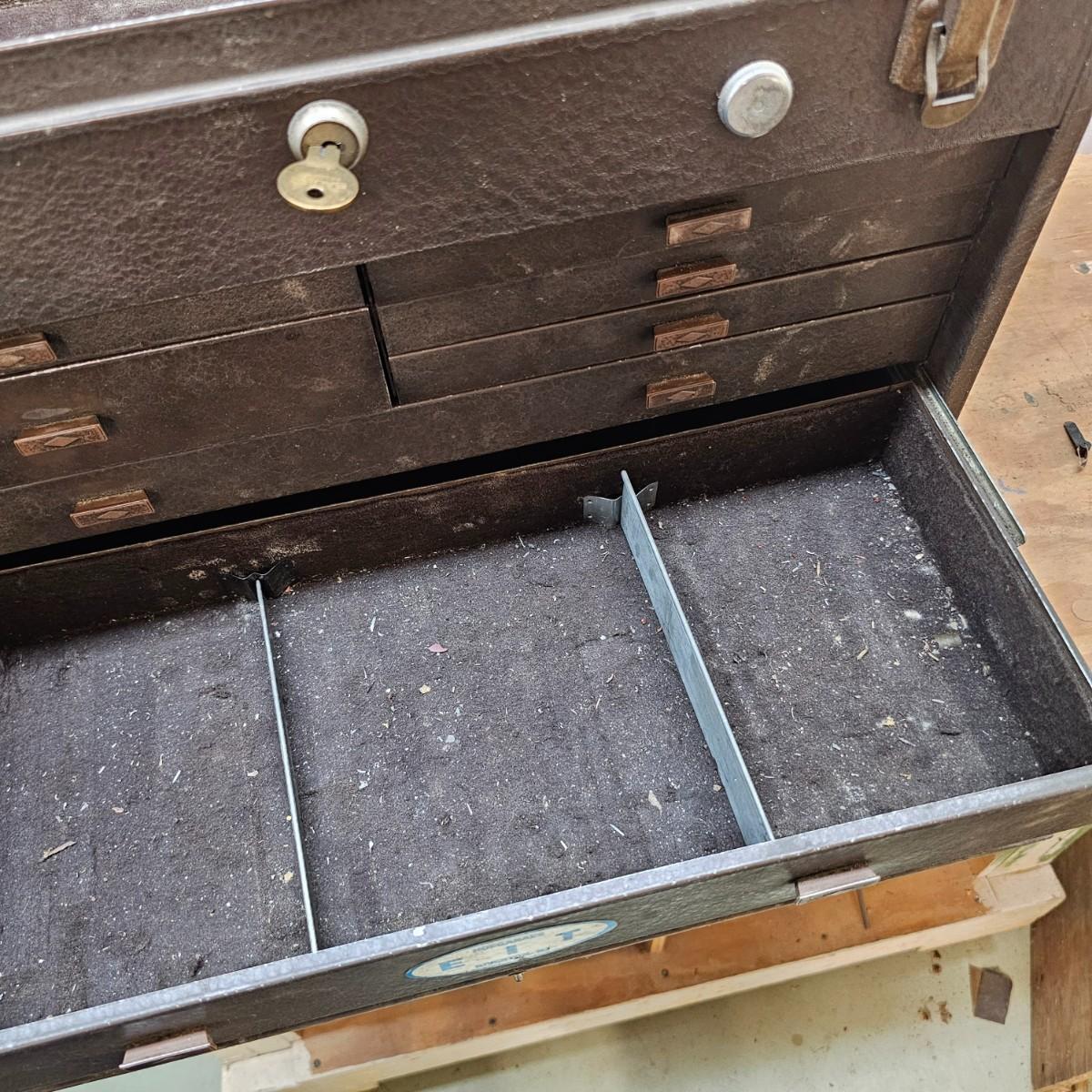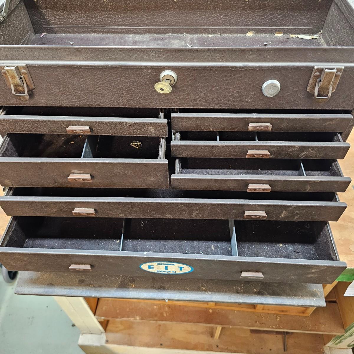 Kennedy Model 520 steel toolbox with padded drawers, ball bearing slides and more. Front of toolbox drops underneath to reveal two full length drawers and five half-width drawers. Some drawers have dividers in place. Soft lining material inside is in need of cleaning or replacement. Toolbox measures 20" x 8.5" x 14"H, has carry handle on lid and locking with key. Also includes some conversion charts and measurement data sheets. See photos for details. Local pickup only.