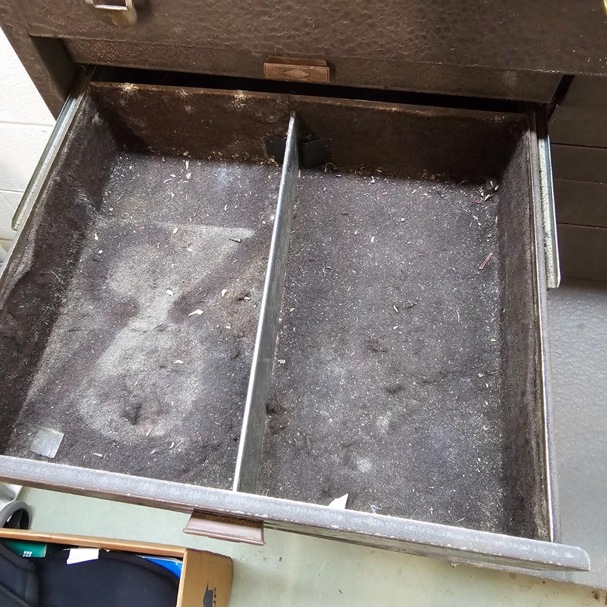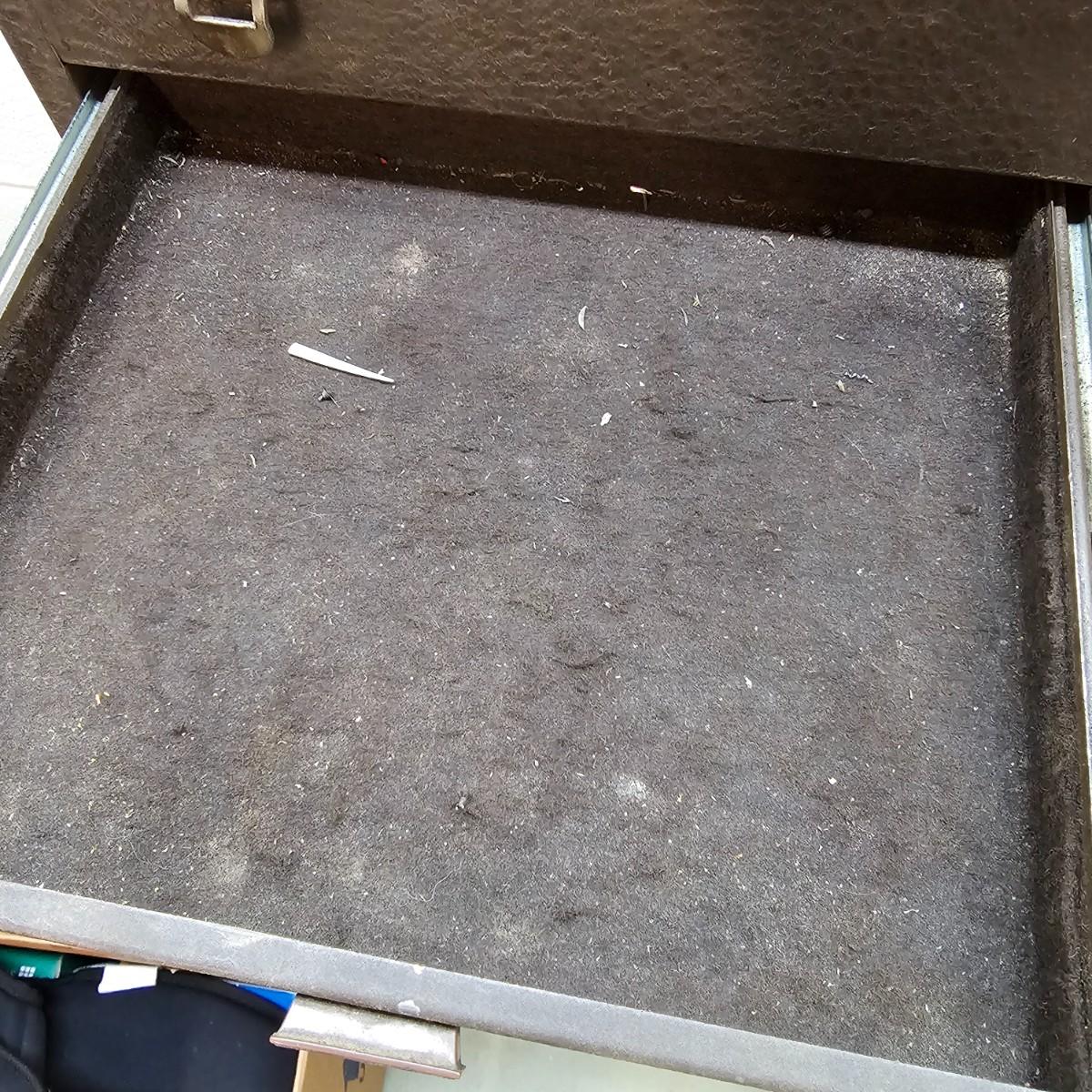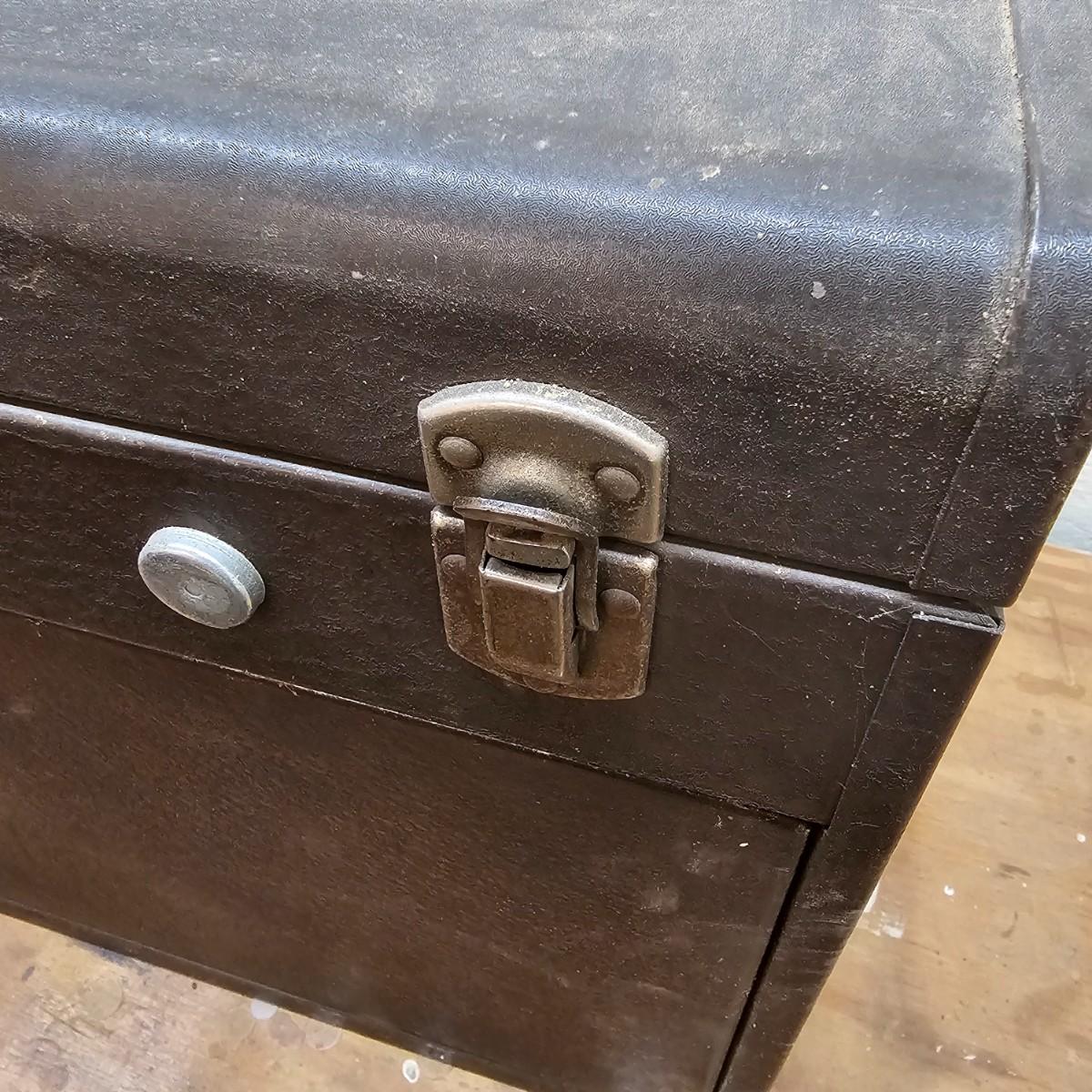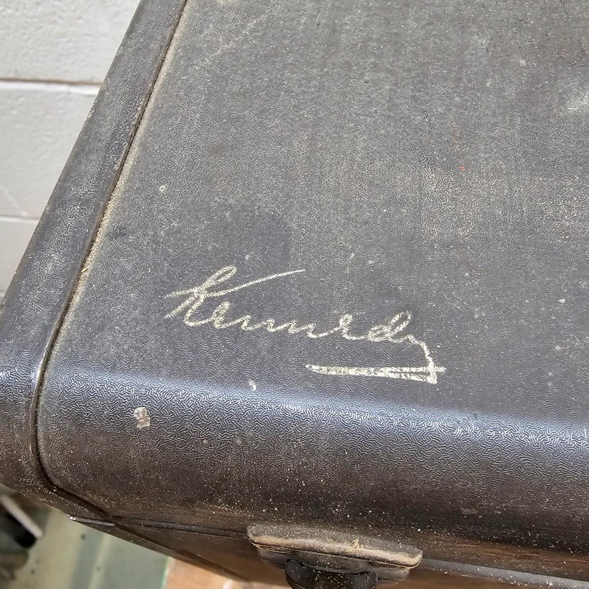 Kennedy Model 520 steel toolbox with padded drawers, ball bearing slides and more. Front of toolbox drops underneath to reveal two full length drawers and five half-width drawers. Some drawers have dividers in place. Soft lining material inside is in need of cleaning or replacement. Toolbox measures 20" x 8.5" x 14"H, has carry handle on lid and locking with key. Also includes some conversion charts and measurement data sheets. See photos for details. Local pickup only.