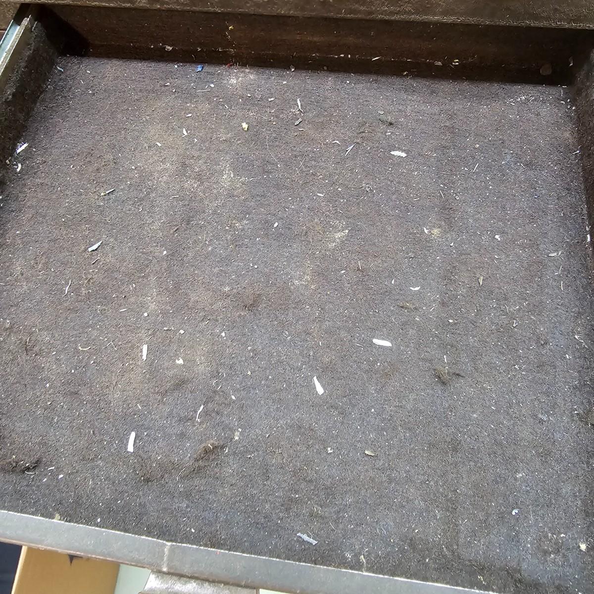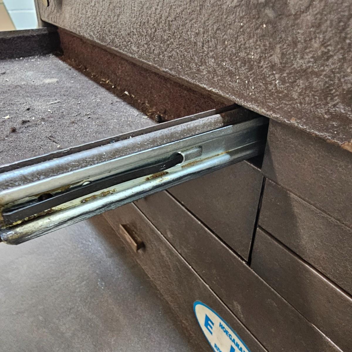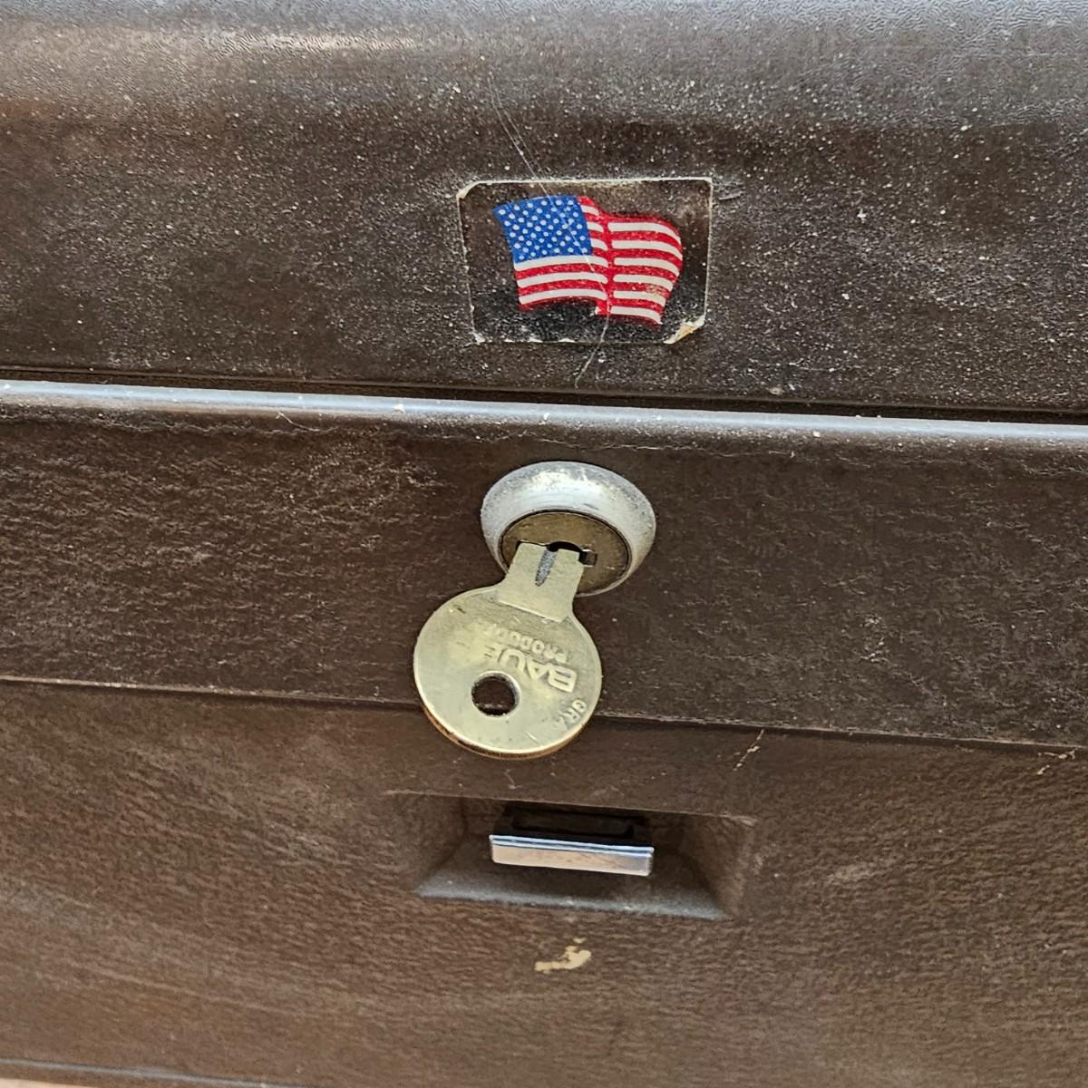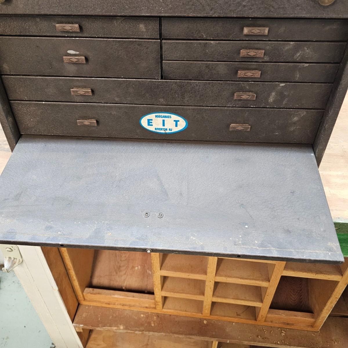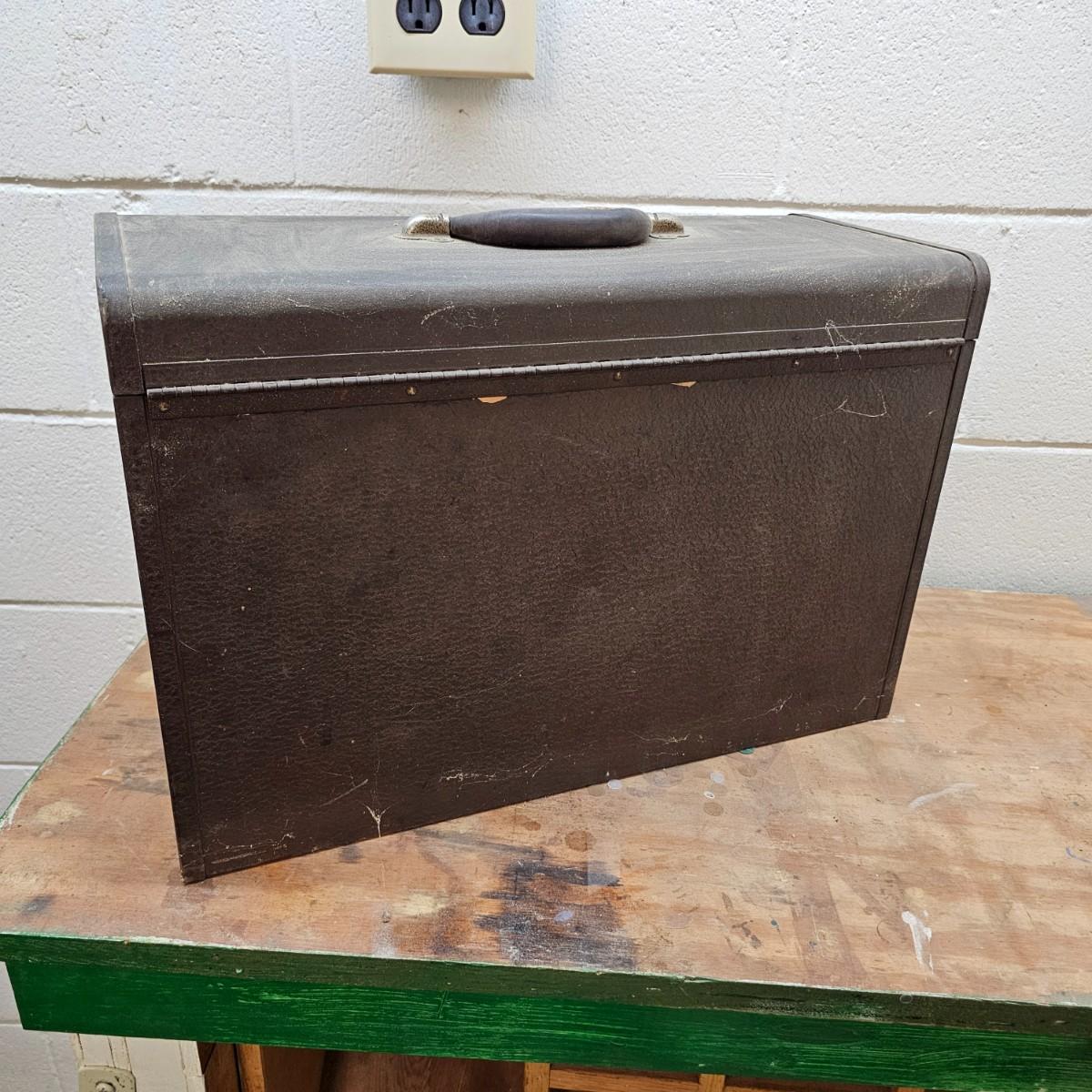 Kennedy Model 520 steel toolbox with padded drawers, ball bearing slides and more. Front of toolbox drops underneath to reveal two full length drawers and five half-width drawers. Some drawers have dividers in place. Soft lining material inside is in need of cleaning or replacement. Toolbox measures 20" x 8.5" x 14"H, has carry handle on lid and locking with key. Also includes some conversion charts and measurement data sheets. See photos for details. Local pickup only.