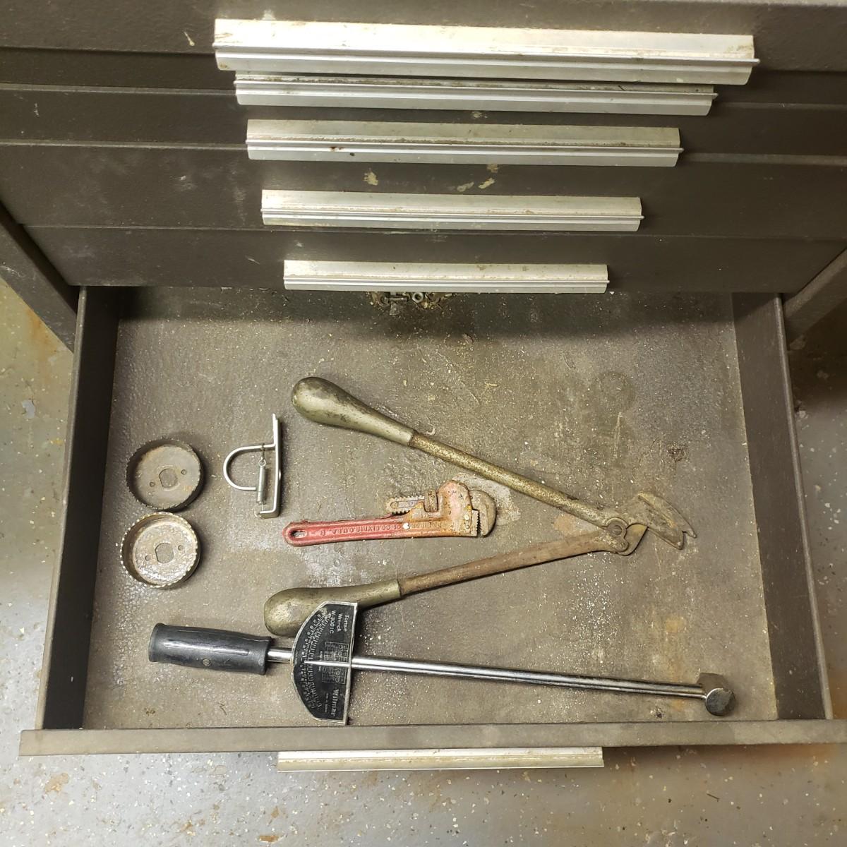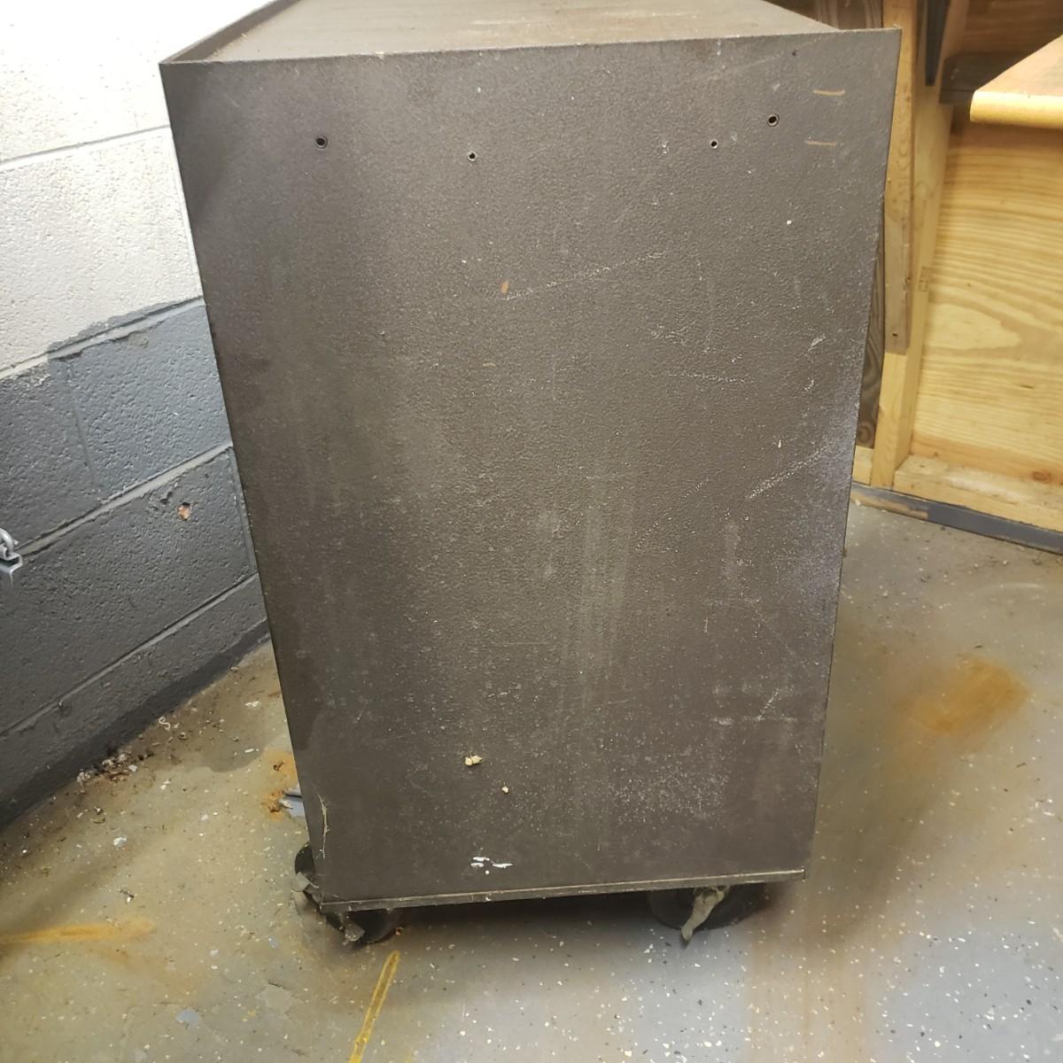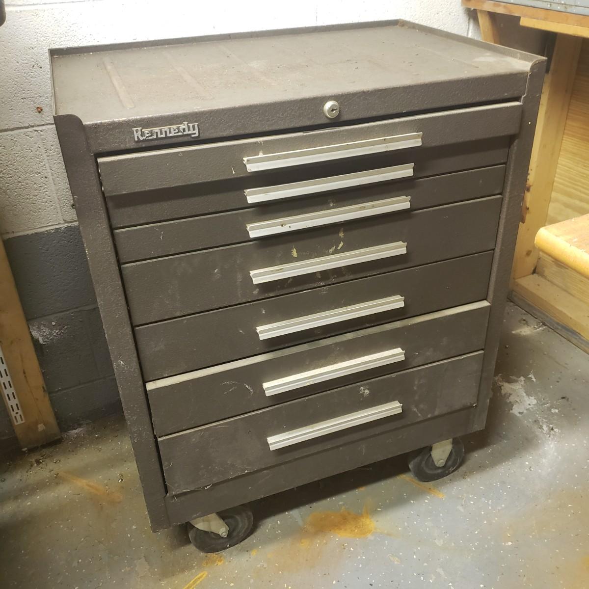 This is a seven drawer Kennedy tool cart on four caster wheels that lock. The lot comes with all contents in the drawers. The cart measures 27" x 18" x 35"H. The cart is made of heavy duty metal. It has been well loved. There is not a key to lock it up. The cart can be rolled out of the garage, no steps. The last drawer has something that looks like it melted on the bottom.