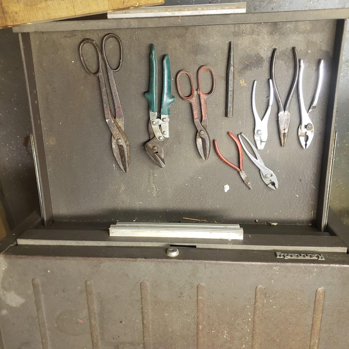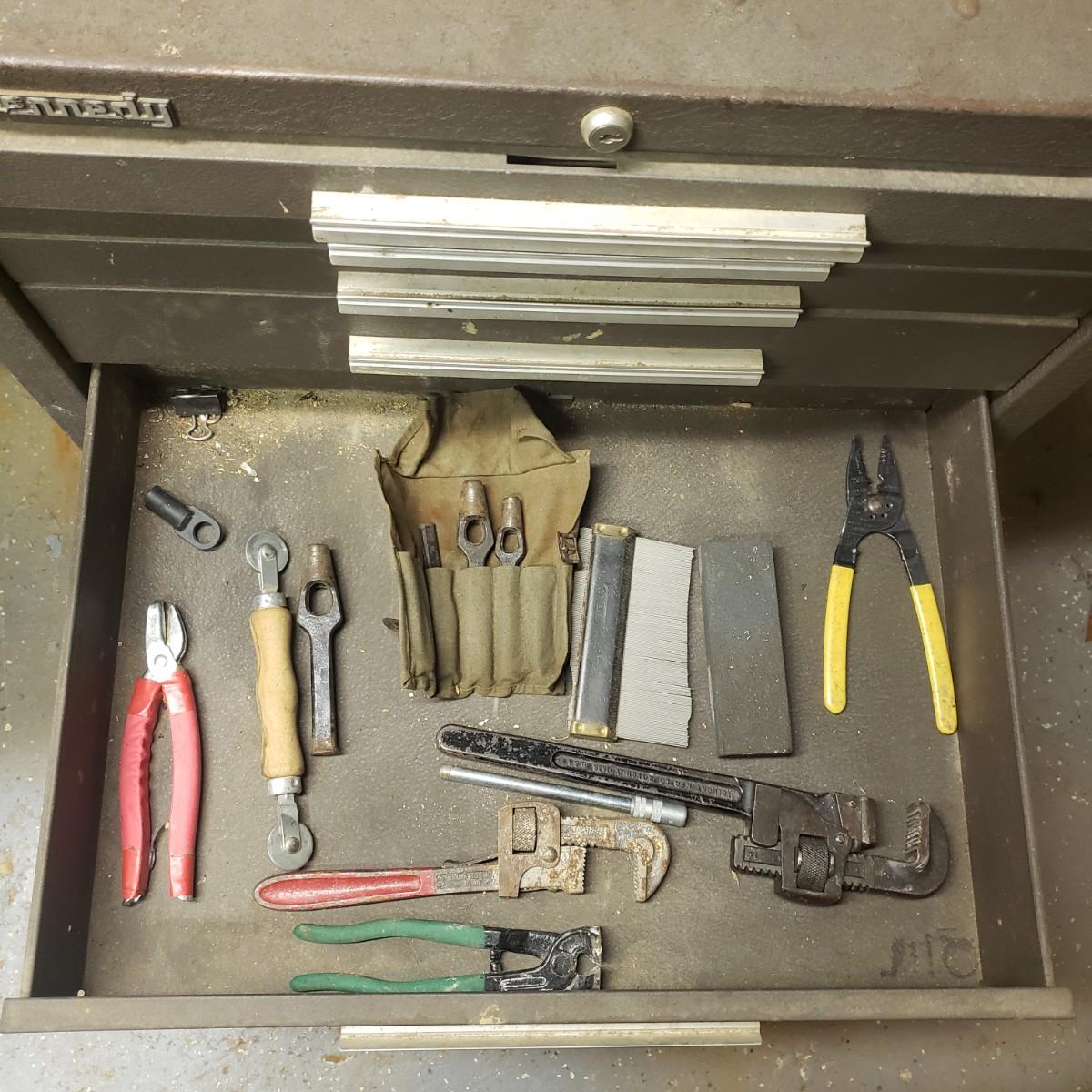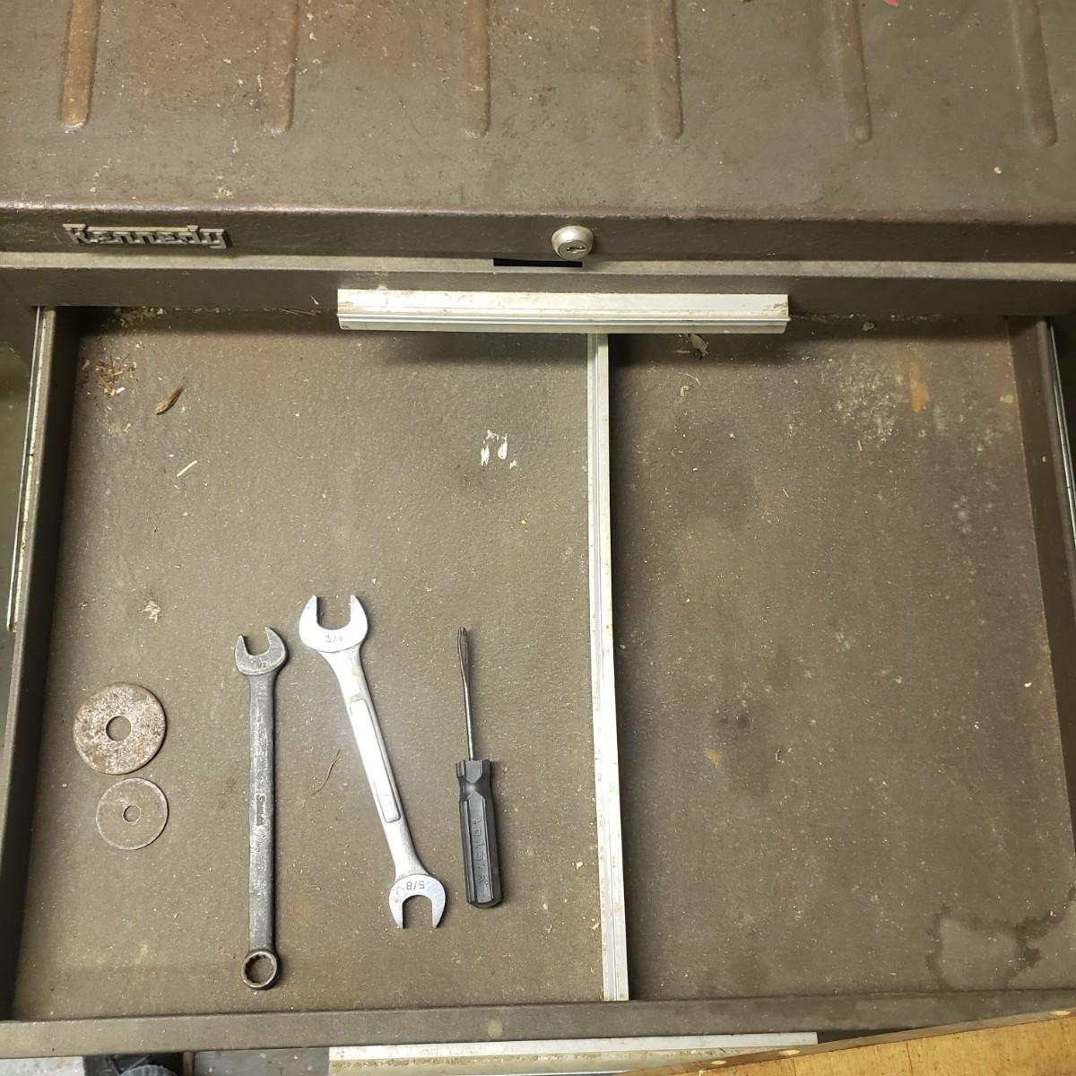 This is a seven drawer Kennedy tool cart on four caster wheels that lock. The lot comes with all contents in the drawers. The cart measures 27" x 18" x 35"H. The cart is made of heavy duty metal. It has been well loved. There is not a key to lock it up. The cart can be rolled out of the garage, no steps. The last drawer has something that looks like it melted on the bottom.