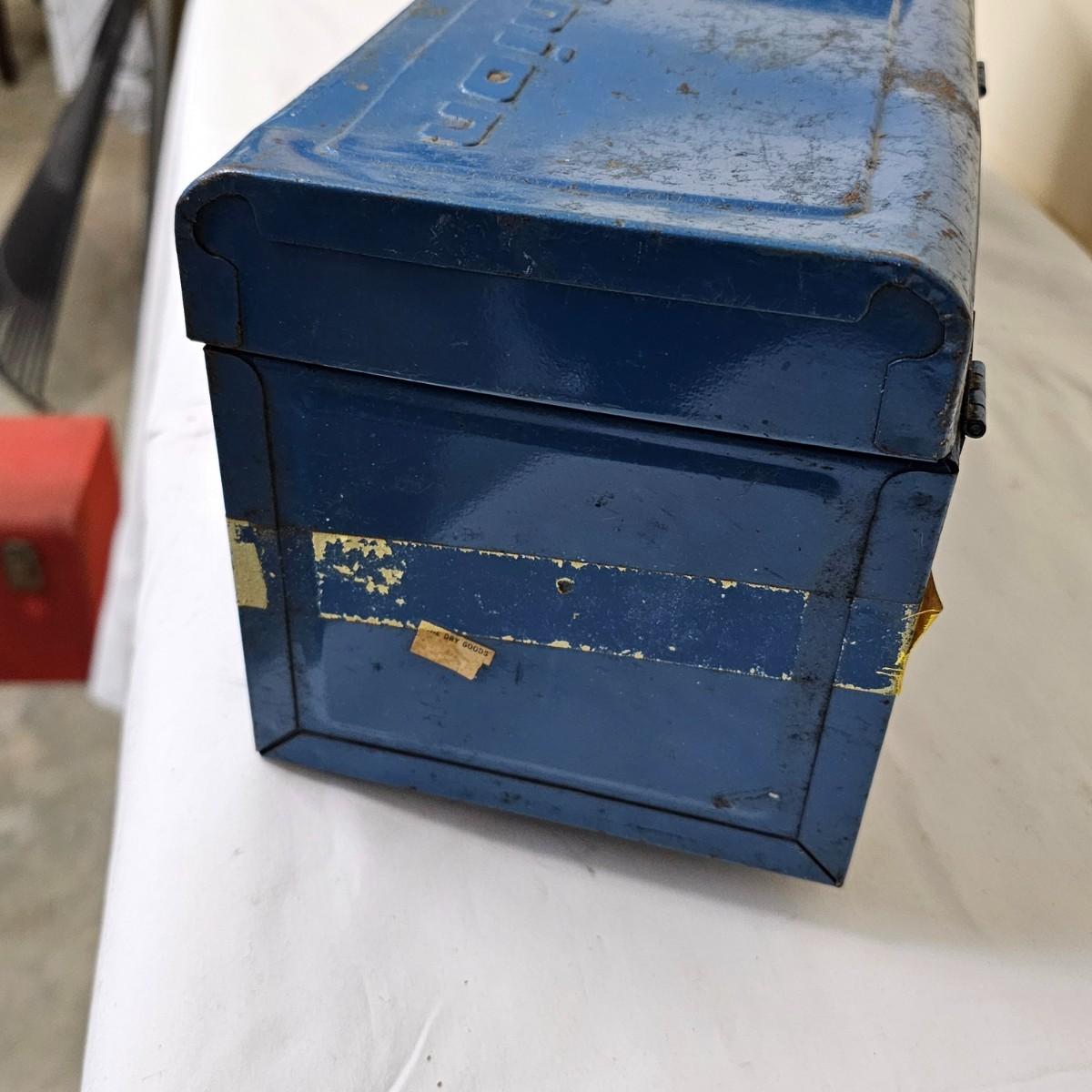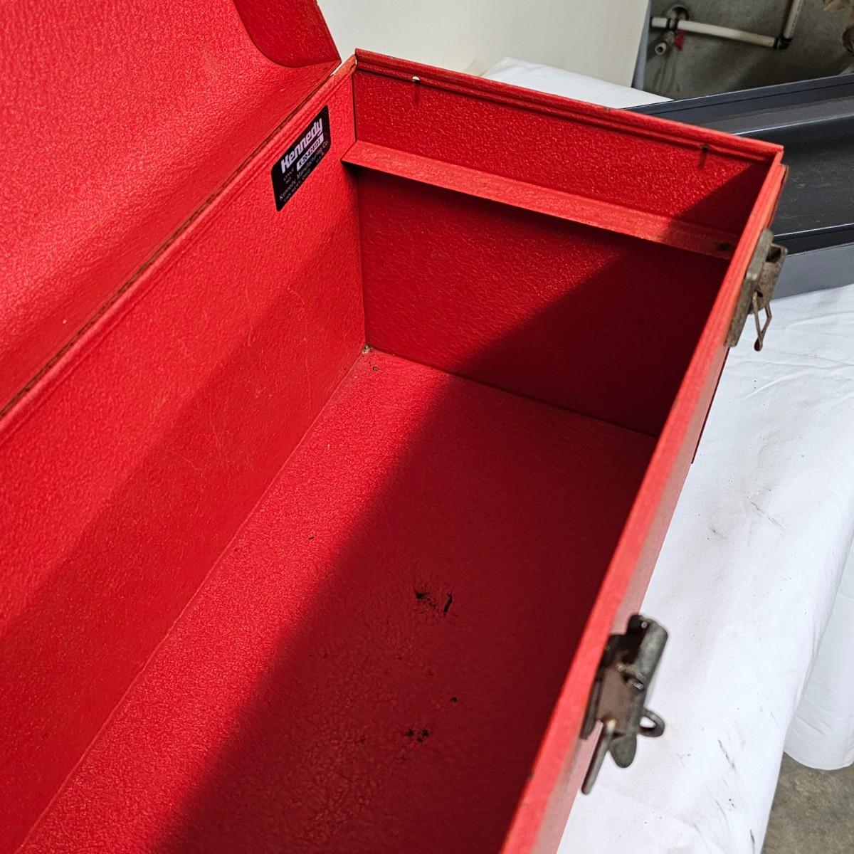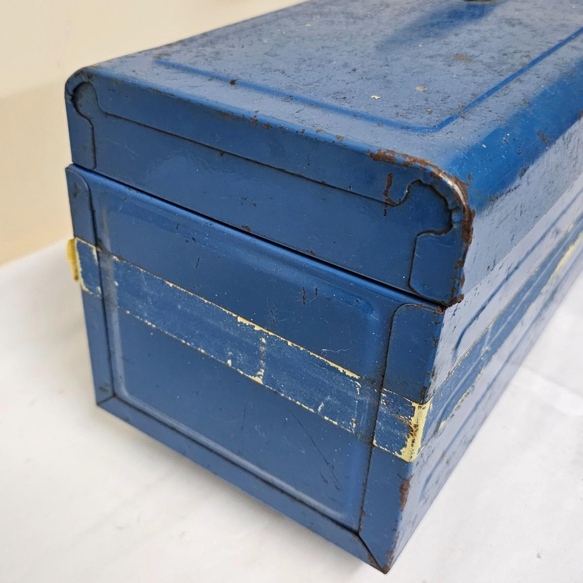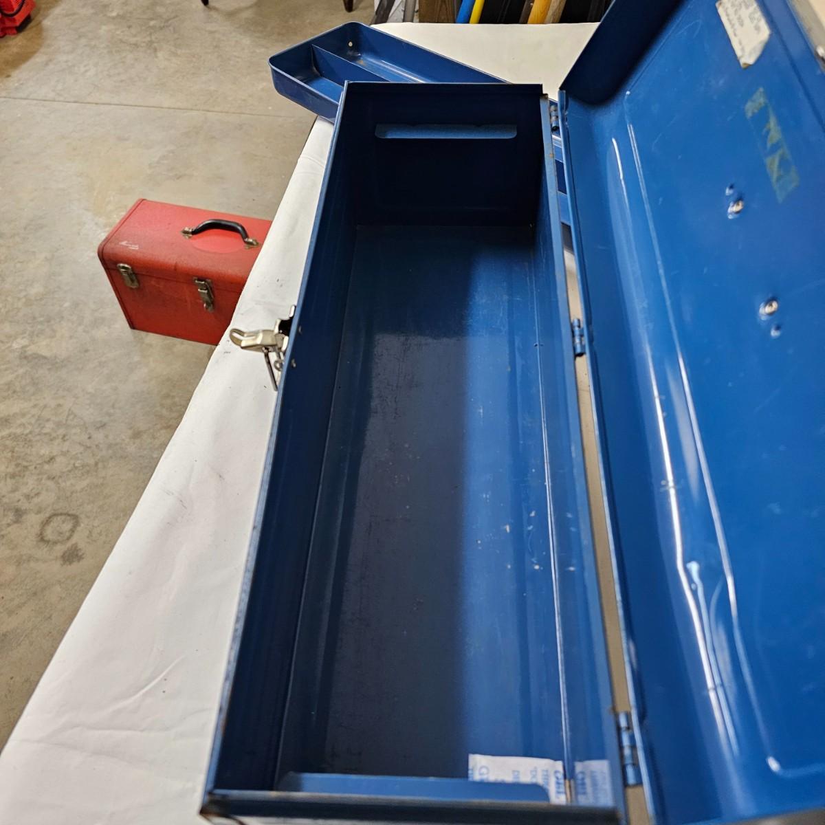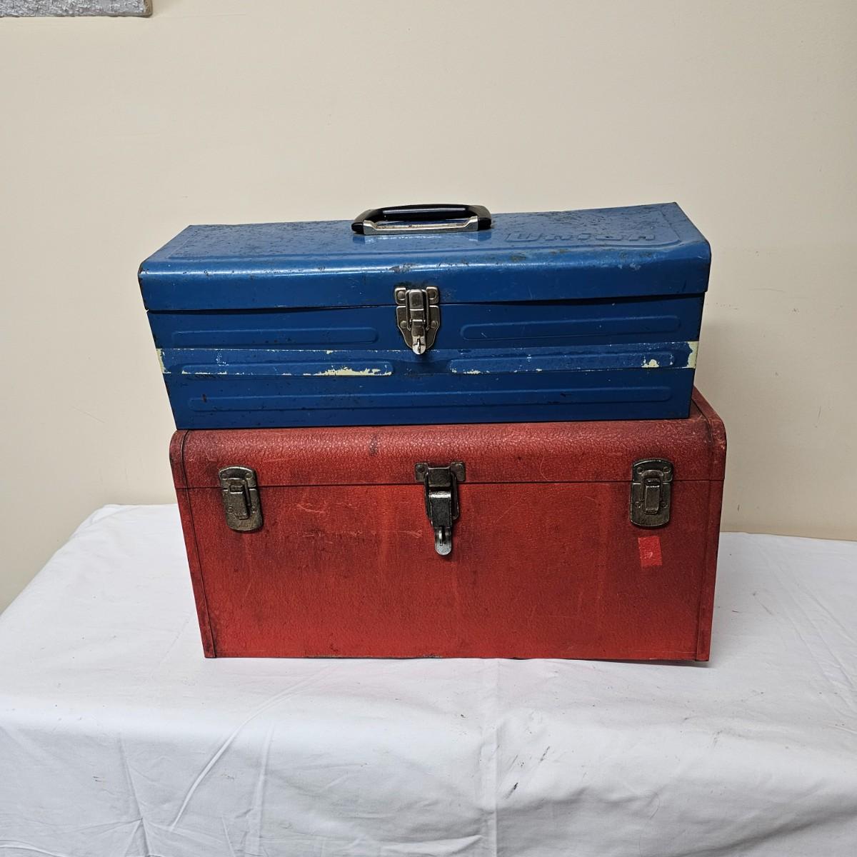 Red Kennedy and blue Union tool boxes, both all metal. Kennedy box measures 20" x 8.5" x 10"H. Discoloring on front top surfaces and across front and sides. One liftout tray. Blue Union box is 19" x 6" x 7"H, has liftout tray. Old tape line around all sides of the box and numerous scratches. See photos for details.
