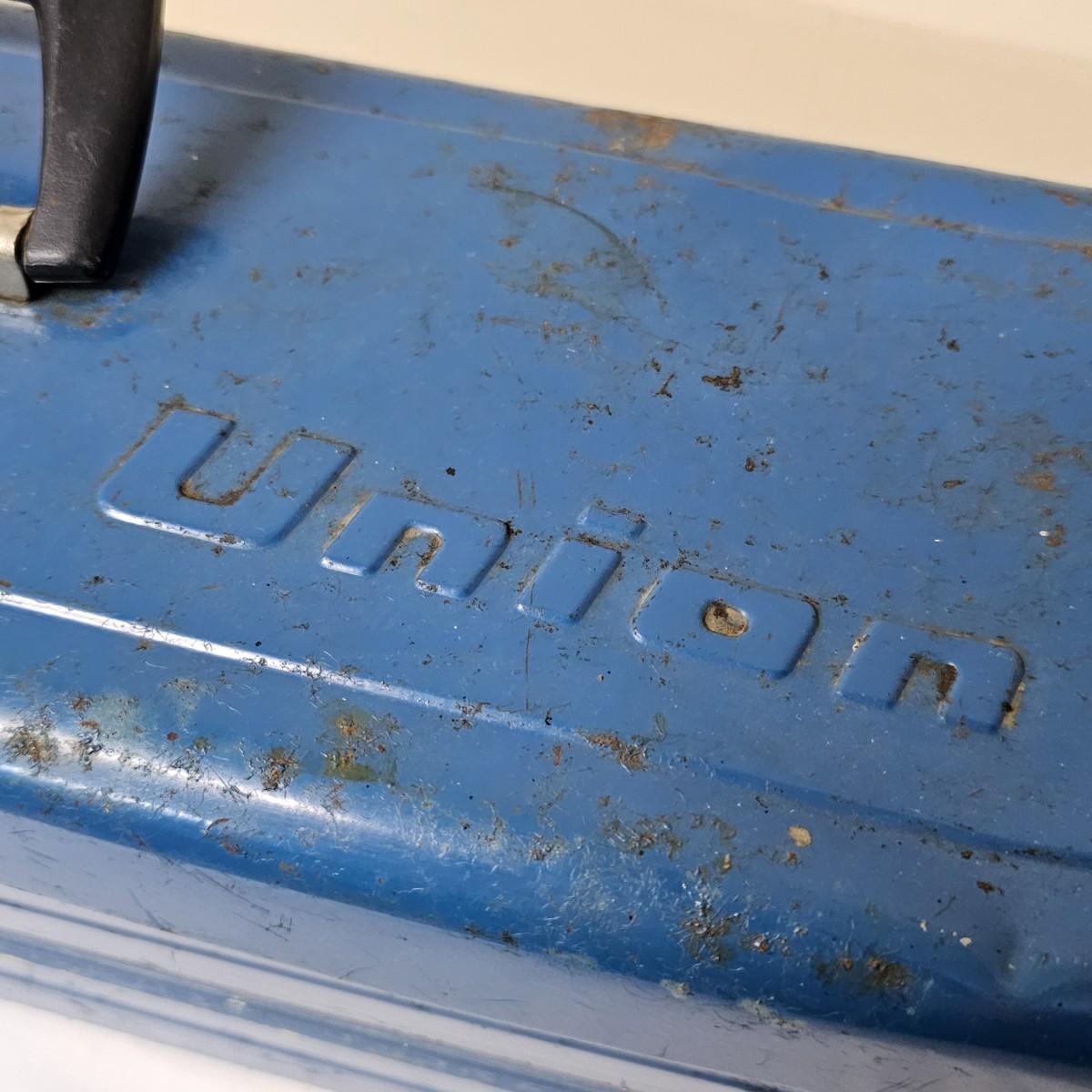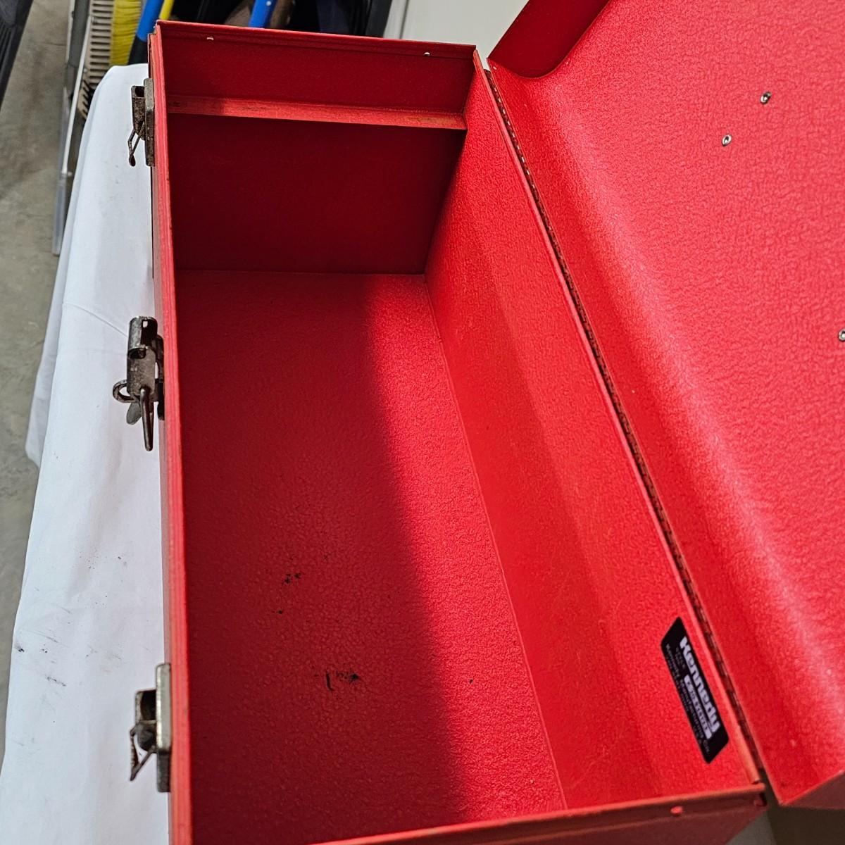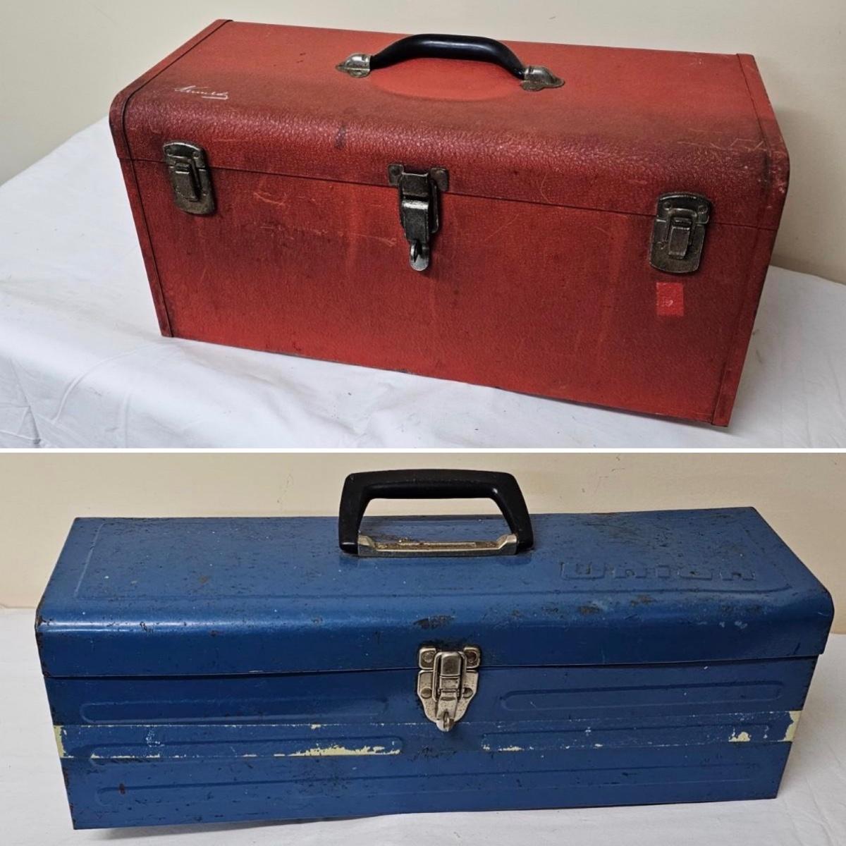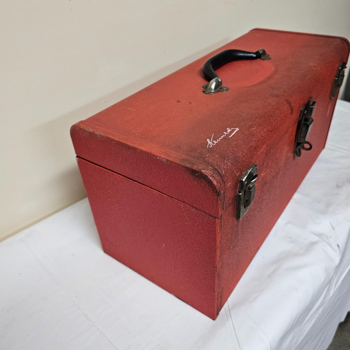 Red Kennedy and blue Union tool boxes, both all metal. Kennedy box measures 20" x 8.5" x 10"H. Discoloring on front top surfaces and across front and sides. One liftout tray. Blue Union box is 19" x 6" x 7"H, has liftout tray. Old tape line around all sides of the box and numerous scratches. See photos for details.