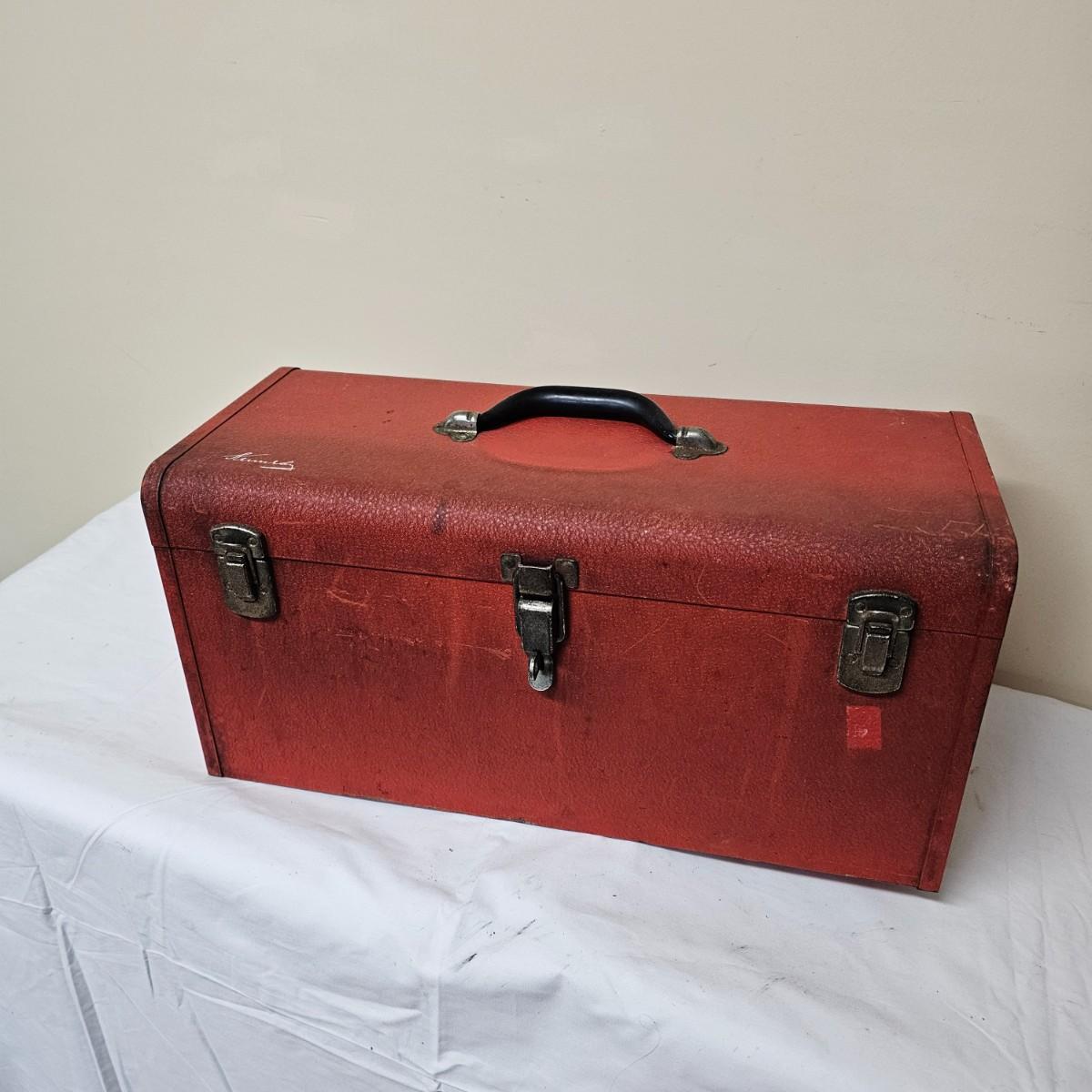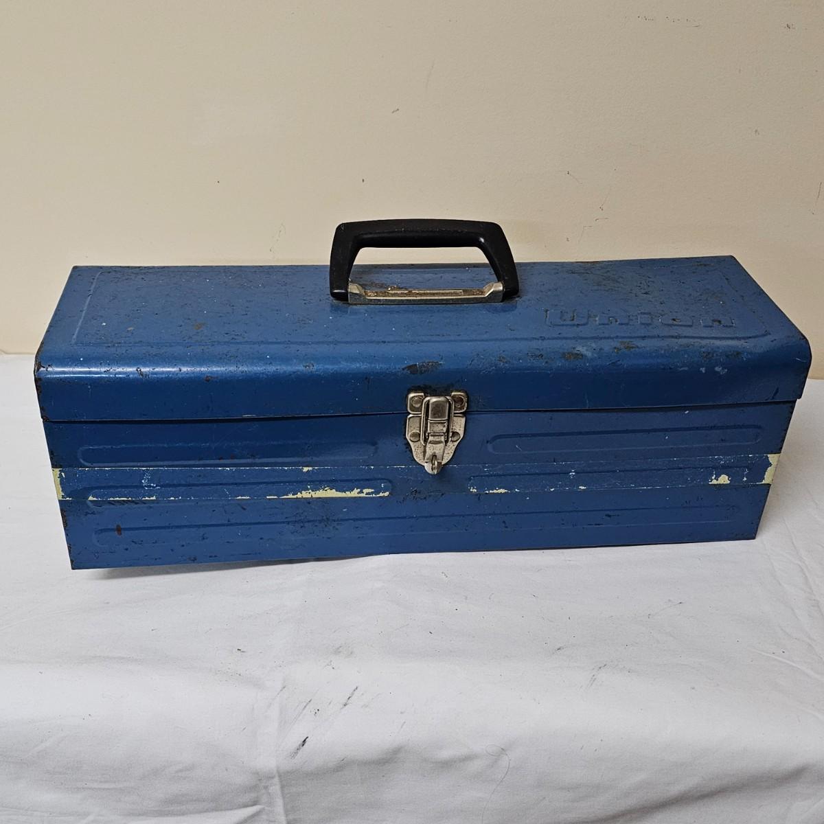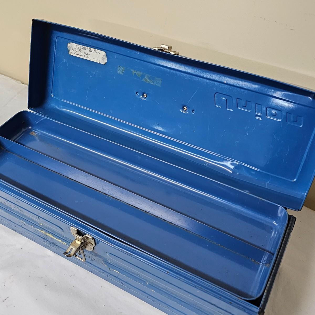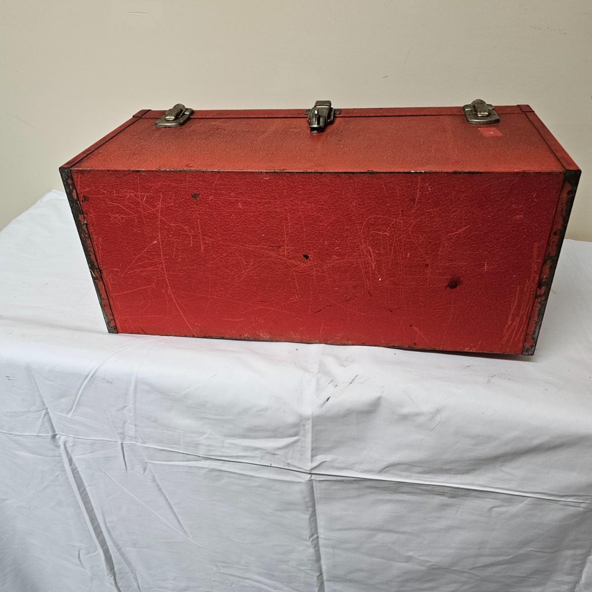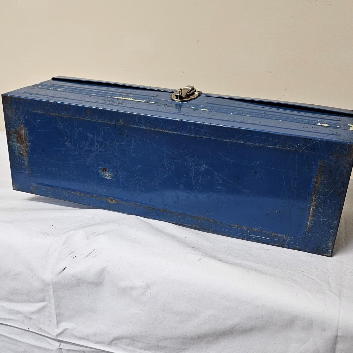 Red Kennedy and blue Union tool boxes, both all metal. Kennedy box measures 20" x 8.5" x 10"H. Discoloring on front top surfaces and across front and sides. One liftout tray. Blue Union box is 19" x 6" x 7"H, has liftout tray. Old tape line around all sides of the box and numerous scratches. See photos for details.