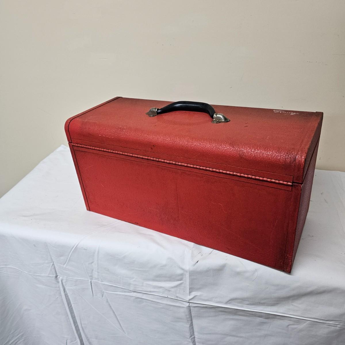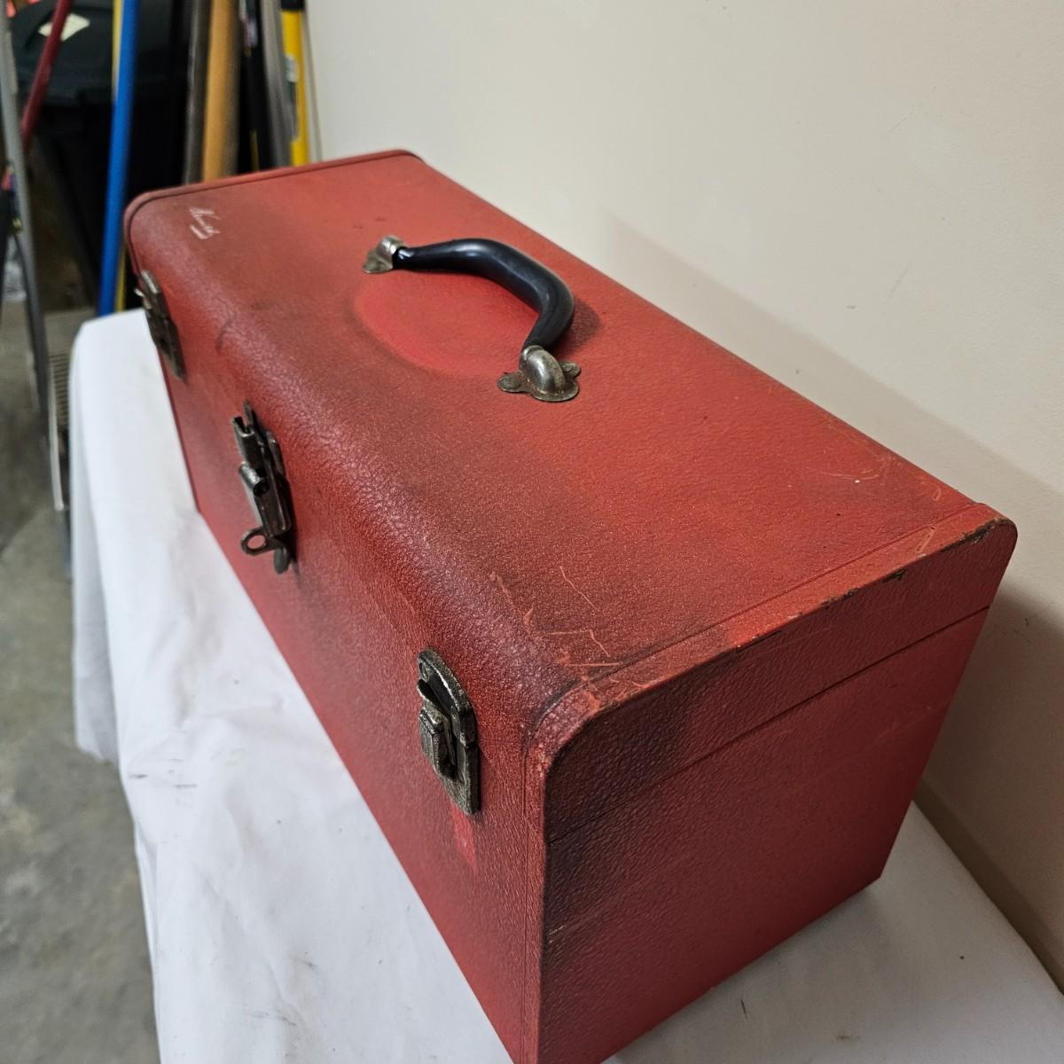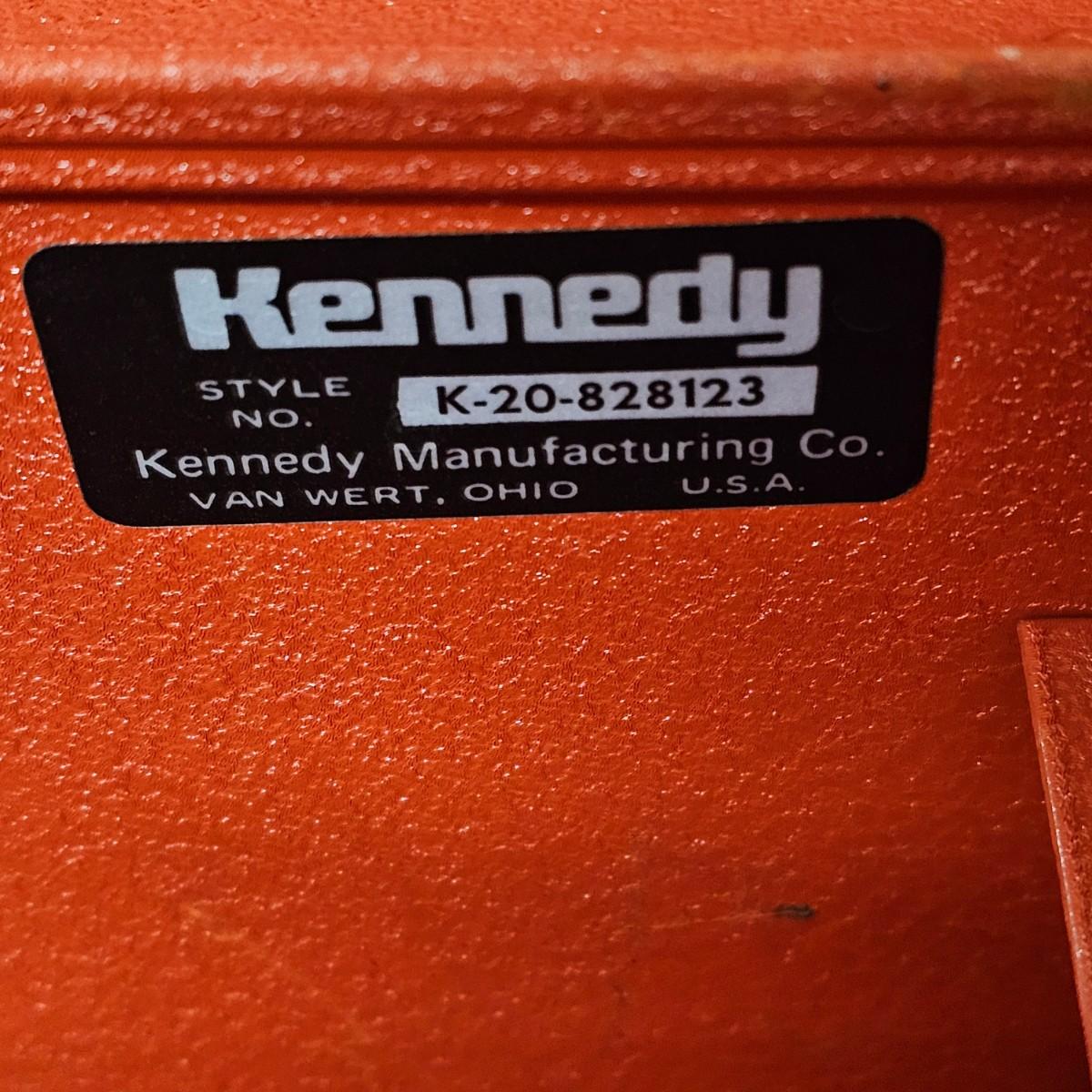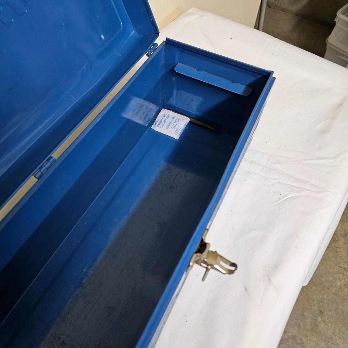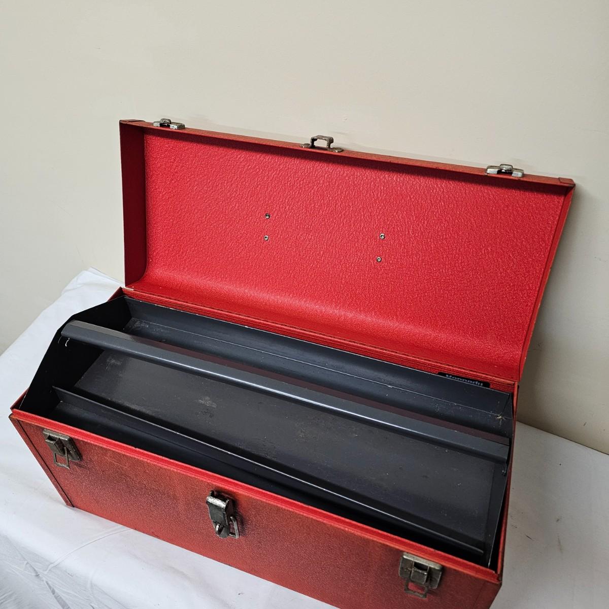 Red Kennedy and blue Union tool boxes, both all metal. Kennedy box measures 20" x 8.5" x 10"H. Discoloring on front top surfaces and across front and sides. One liftout tray. Blue Union box is 19" x 6" x 7"H, has liftout tray. Old tape line around all sides of the box and numerous scratches. See photos for details.