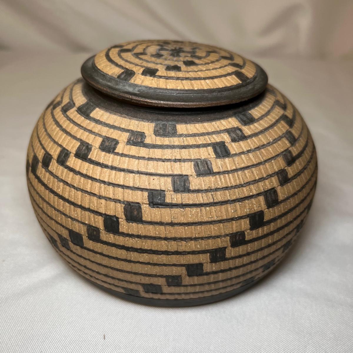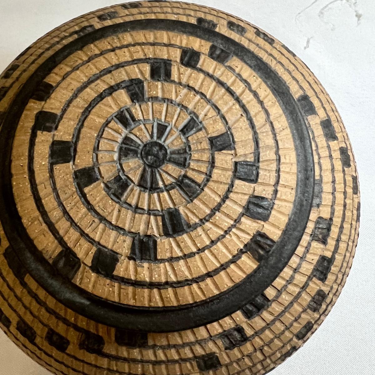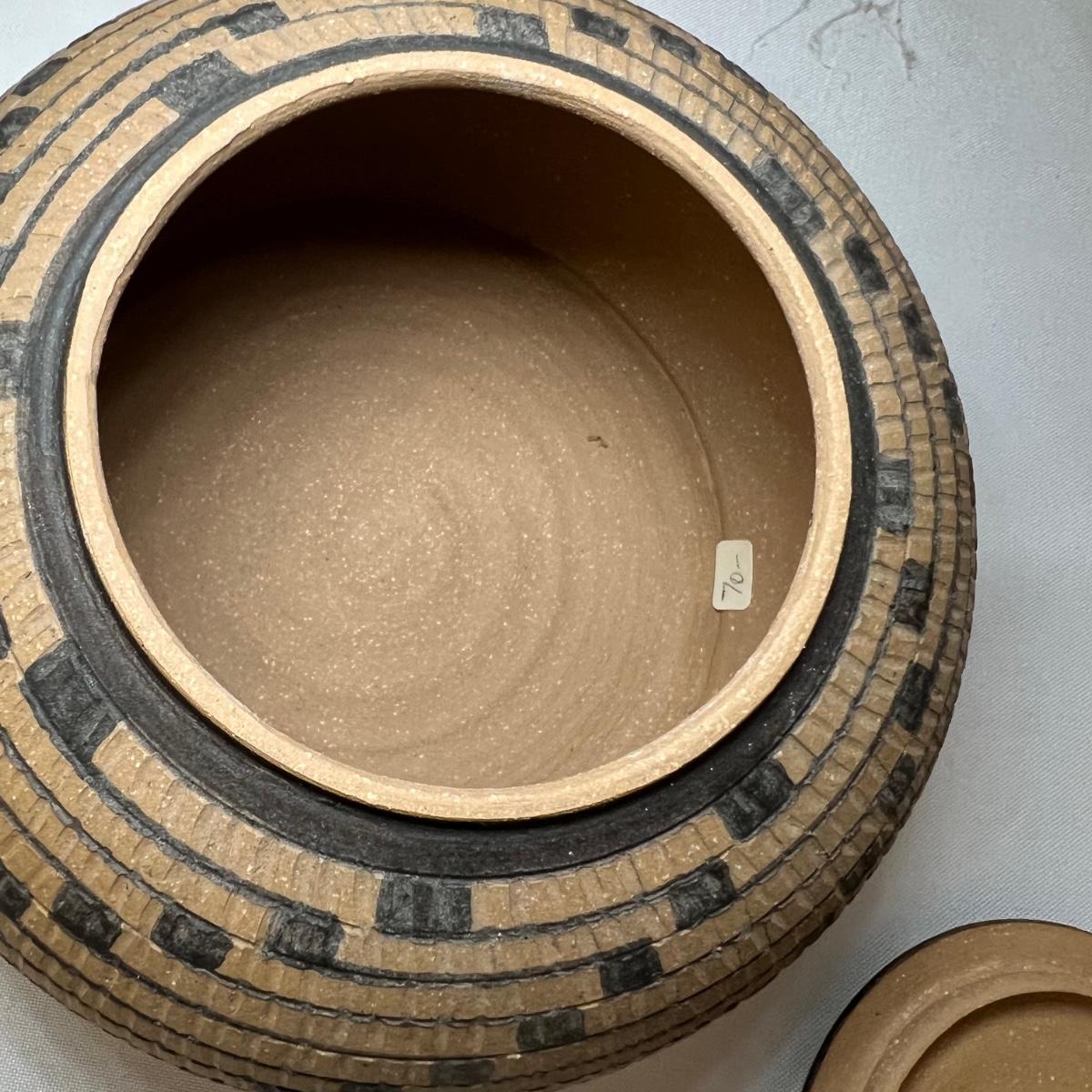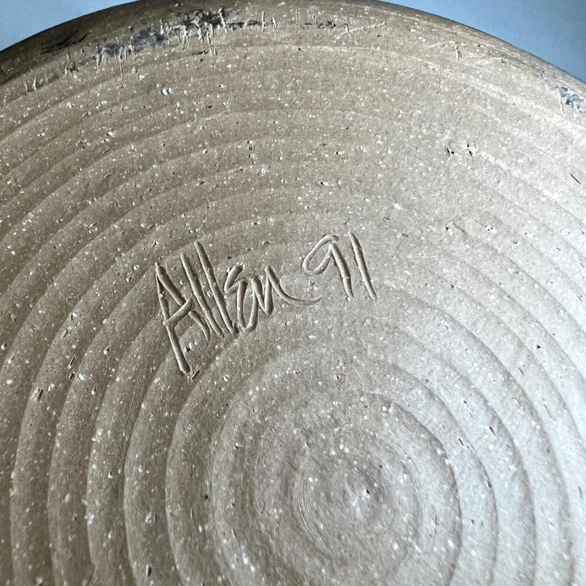 This small lidded jar is unglazed, textured with black accents. Measures 7”D x 4”H. It is signed "Allen" indicating the potter Kenneth Allen.