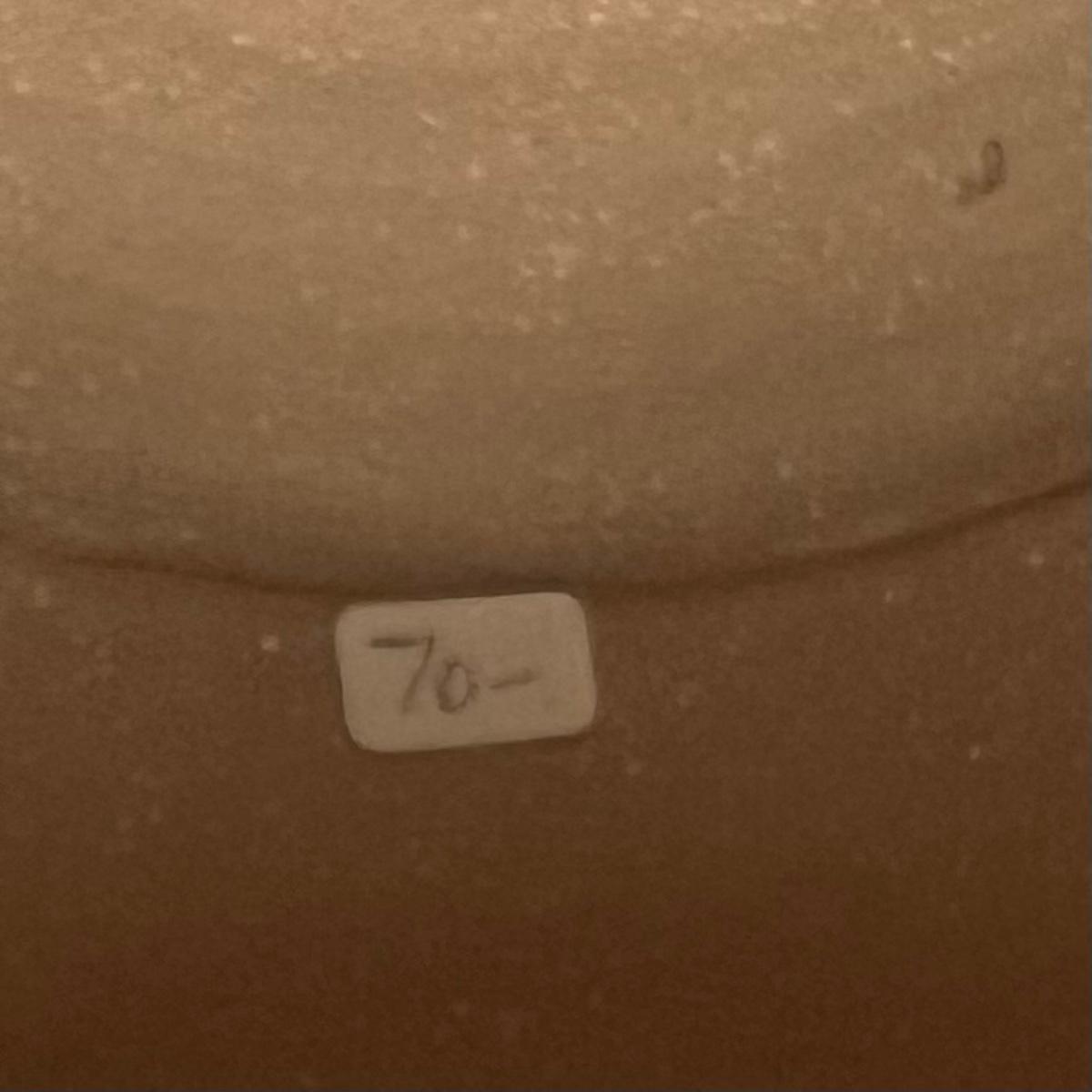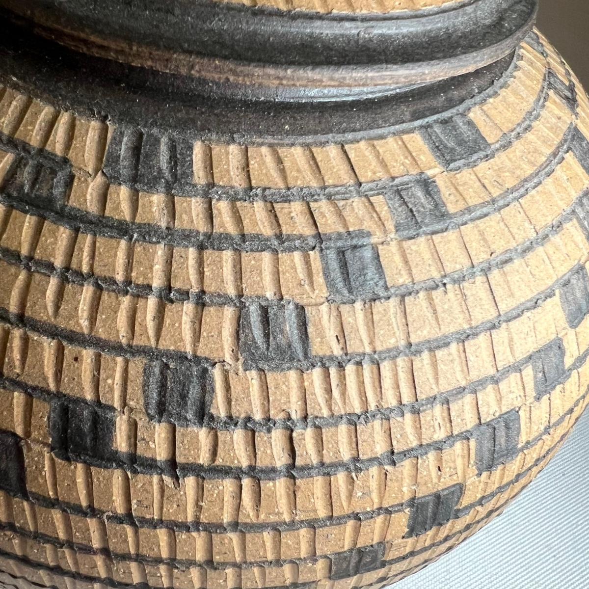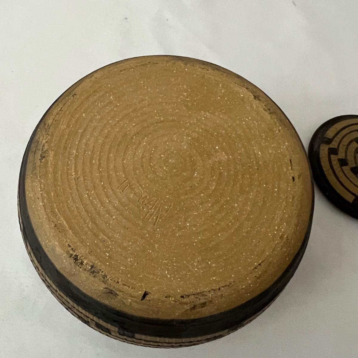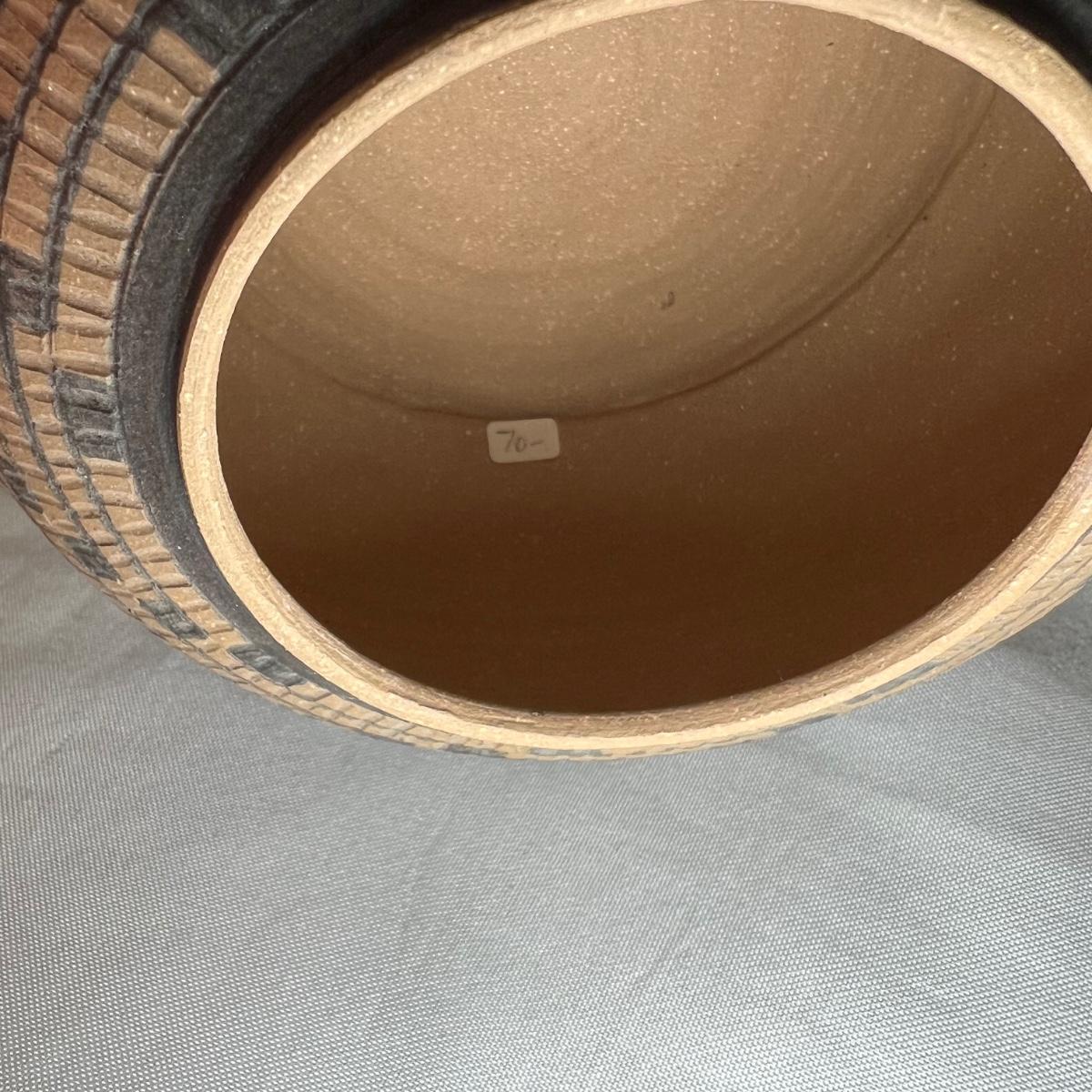 This small lidded jar is unglazed, textured with black accents. Measures 7”D x 4”H. It is signed "Allen" indicating the potter Kenneth Allen.
