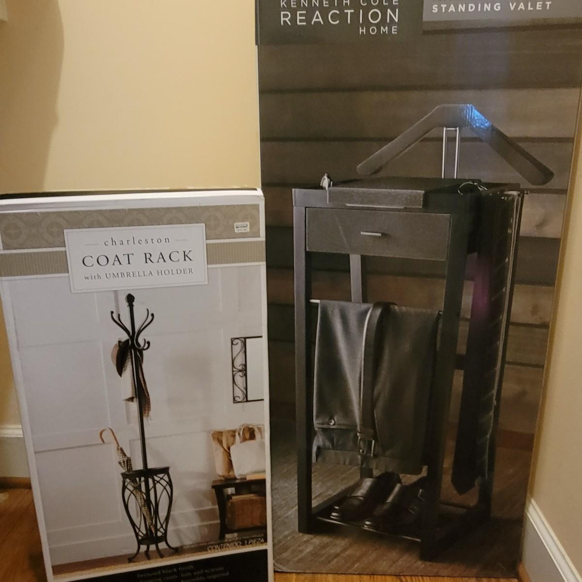 Kenneth Cole Reaction Home Standing valet that is new and in its original packaging. Charleston coat rack with 8 hooks and an umbrella holder, also new and its original packaging. Local Pickup Only