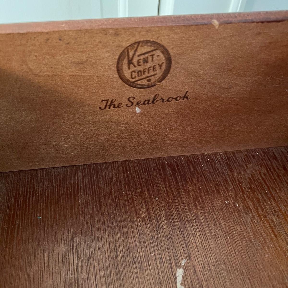 Large Kent Coffey “The Seabrook” six drawer dresser measures 58” x 22” x 34”H.. The hardware on the dresser appears to be brass.