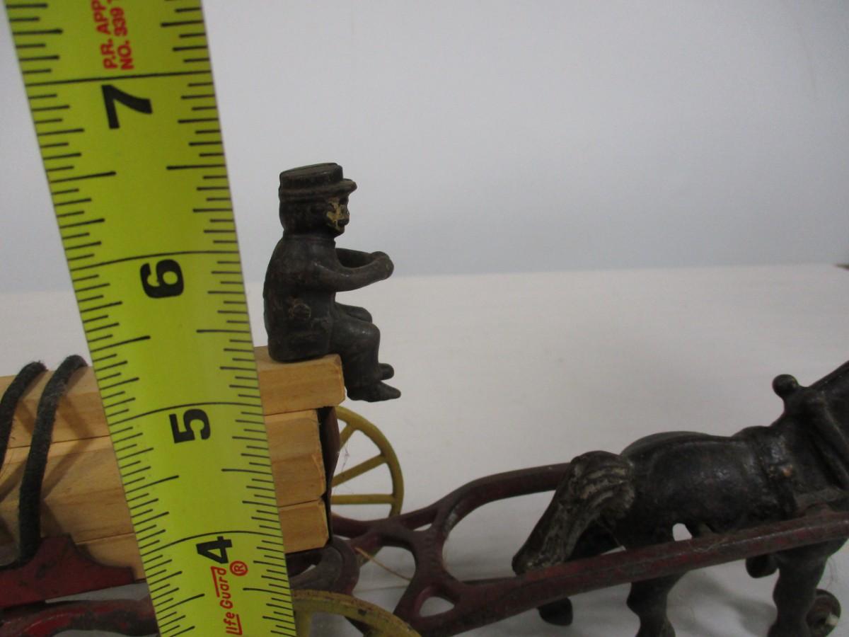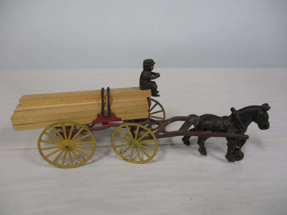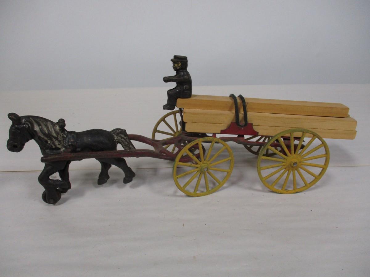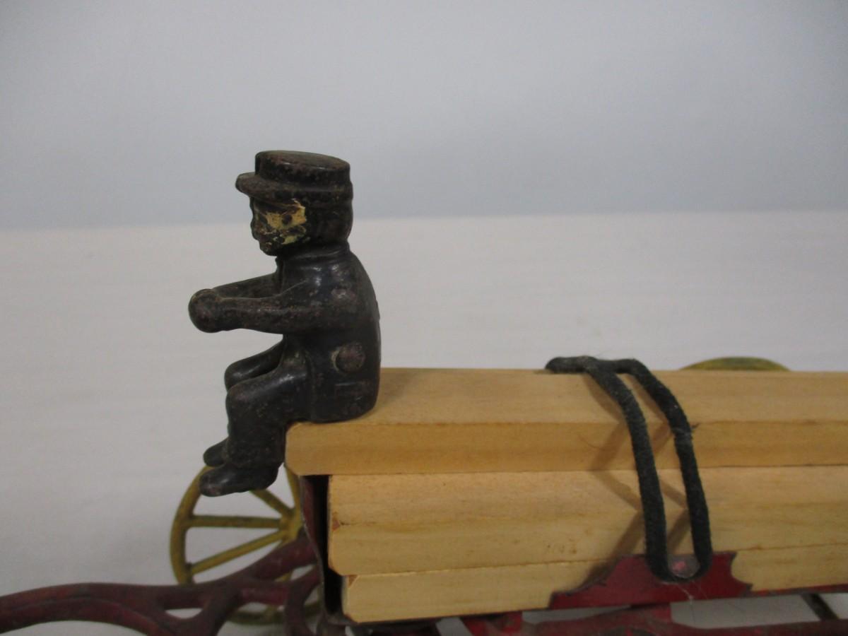 Vintage Kenton Cast Iron Dray Wagon with Driver & Wood Blocks with Driver