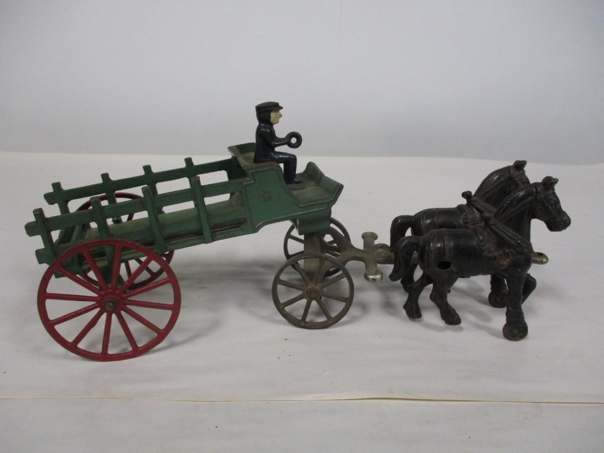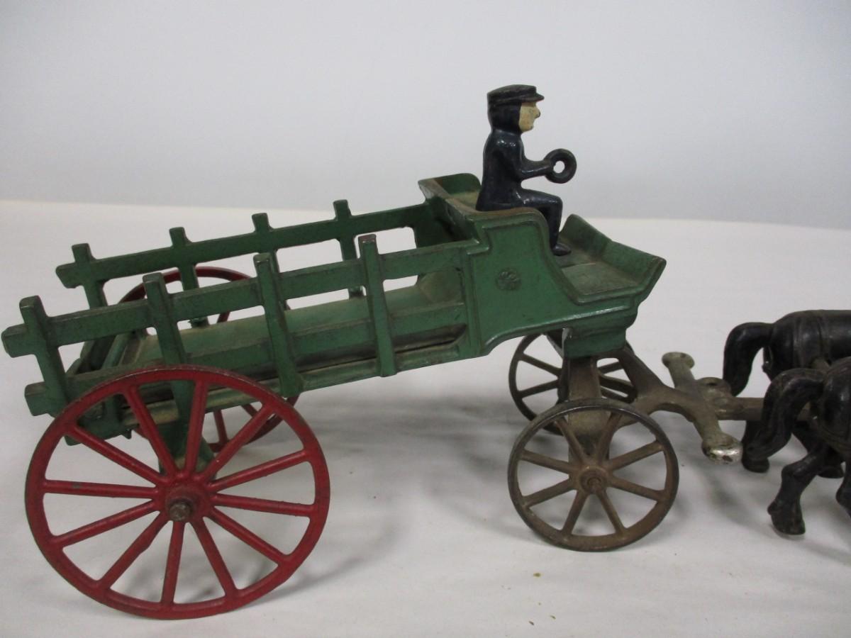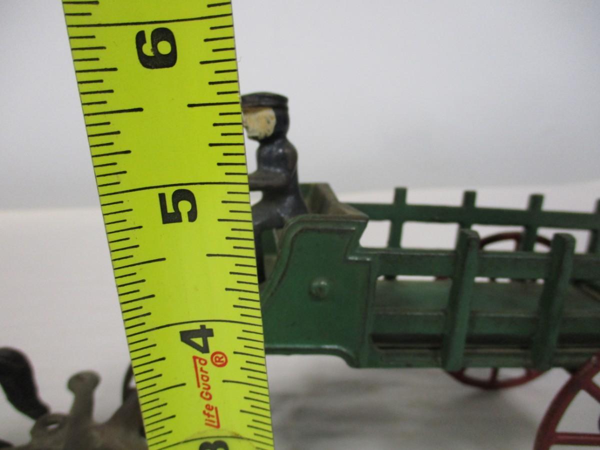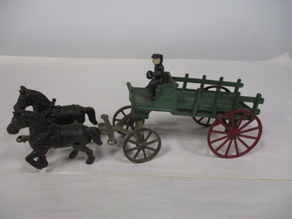 Vintage Kenton Cast Iron Double Horse Team Horse Drawn Dray Wagon with Driver