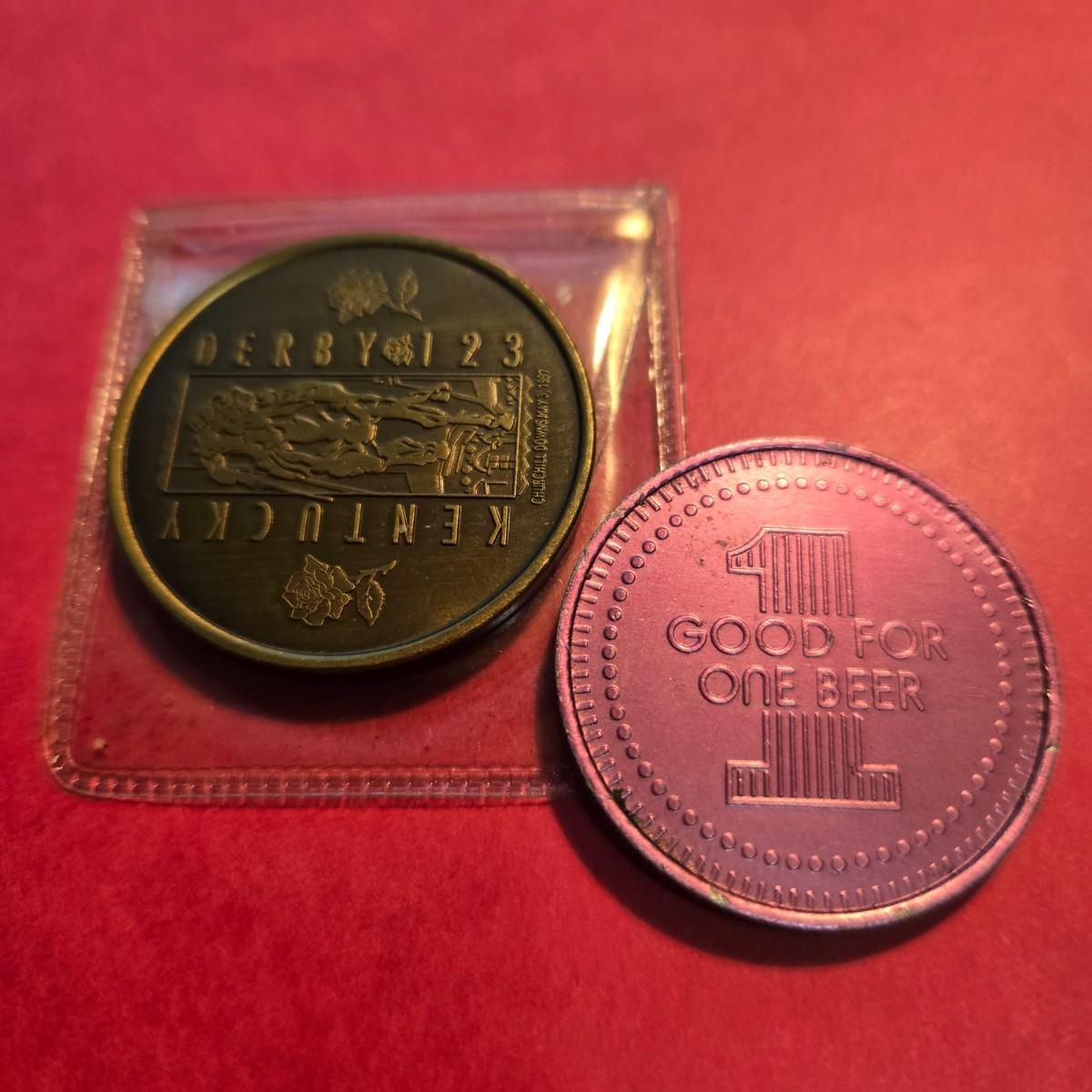This auction lot is for a grouping of Kentucky Derby Coins. This a pair of Kentucky Derby Coins. The bronze colored coin is commemorating the 1997 Running of the Roses and come with its own plastic envelope. The purple coin is a 1986 beer token. It feels like aluminum. These are a great addition for most any Kentucky Derby collector.