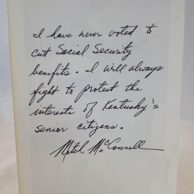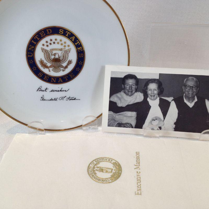This lot is for a fun, small collection of political memorabilia. First is a United States Senate plate honoring Wendel Ford, then 2 unused printed napkins from our State's Executive Mansion and an old post card of a young Mitch McConnell with the verso signed by him with a promise to never cut Social Security benefits and a pledge to protect the interest of Kentucky's Senior Citizens. The signature is printed and not an original signature.