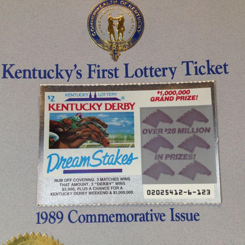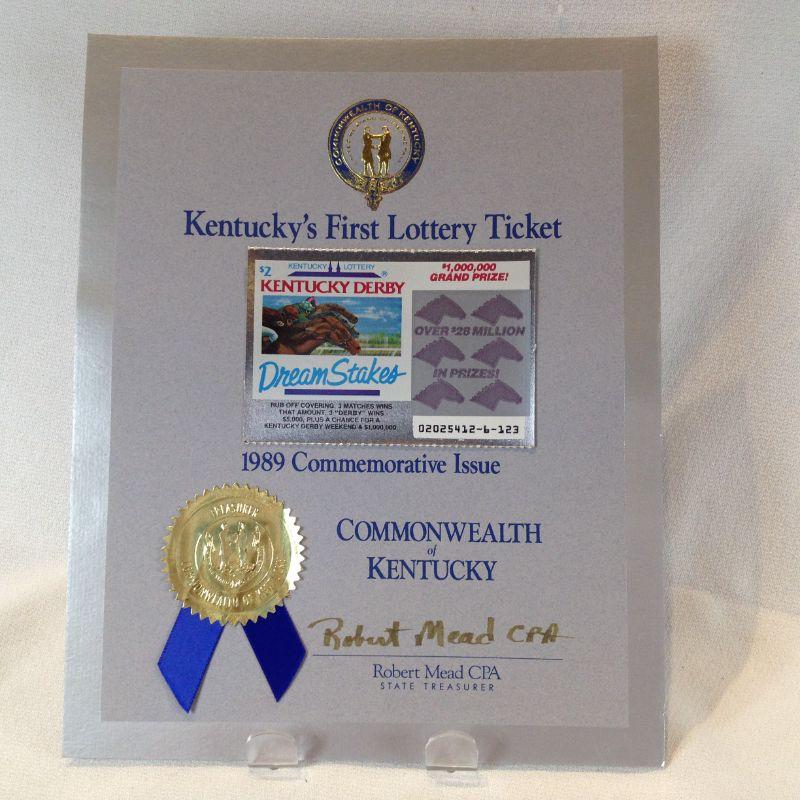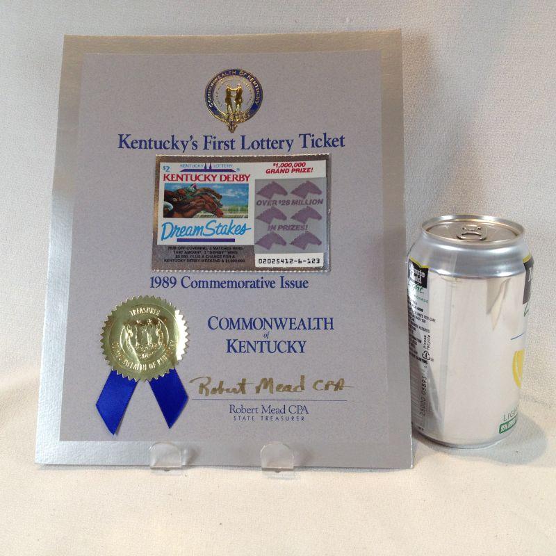 This is a commemorative issue of the 1989 First Lottery Ticket issued from Kentucky. Ready to frame. This is a very cool collectible. It is in very good condition. Don't scratch this item off your bidding list.