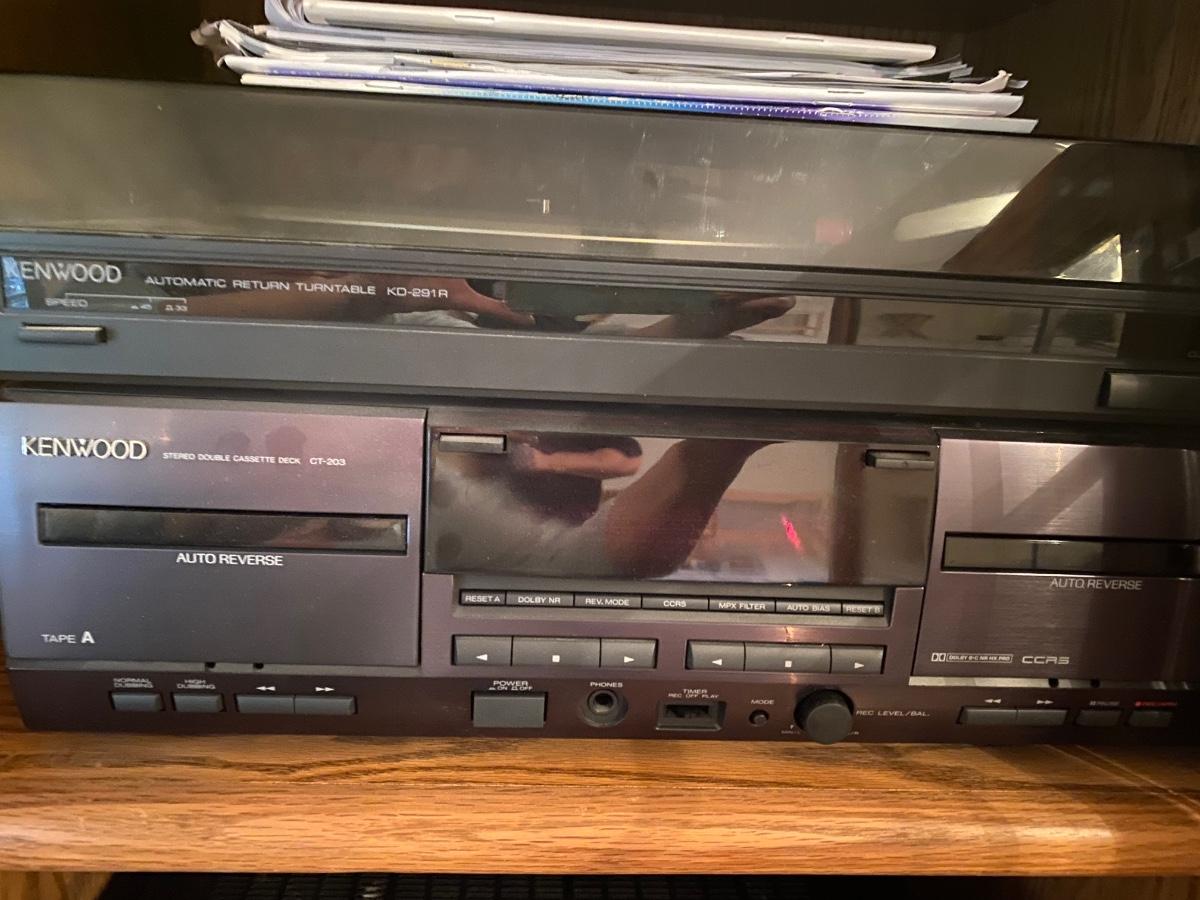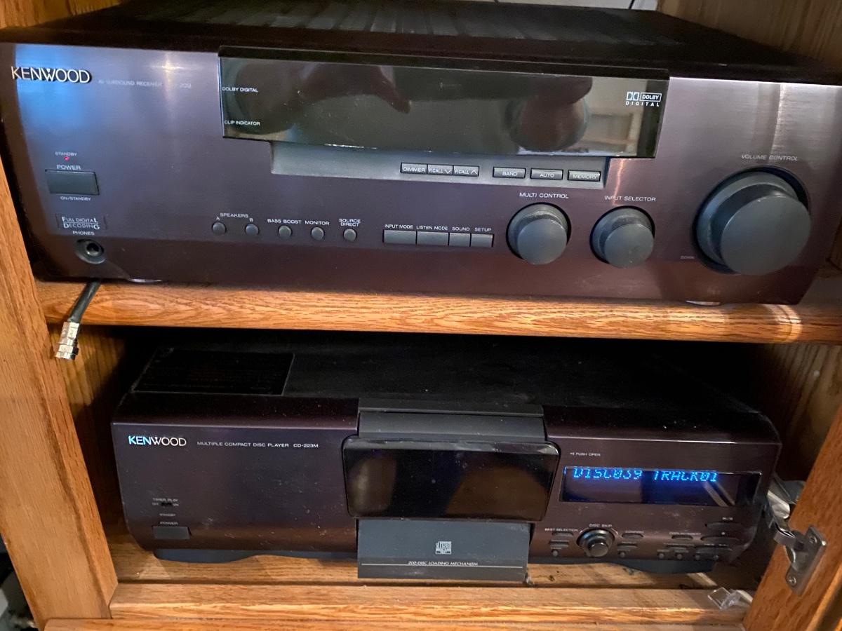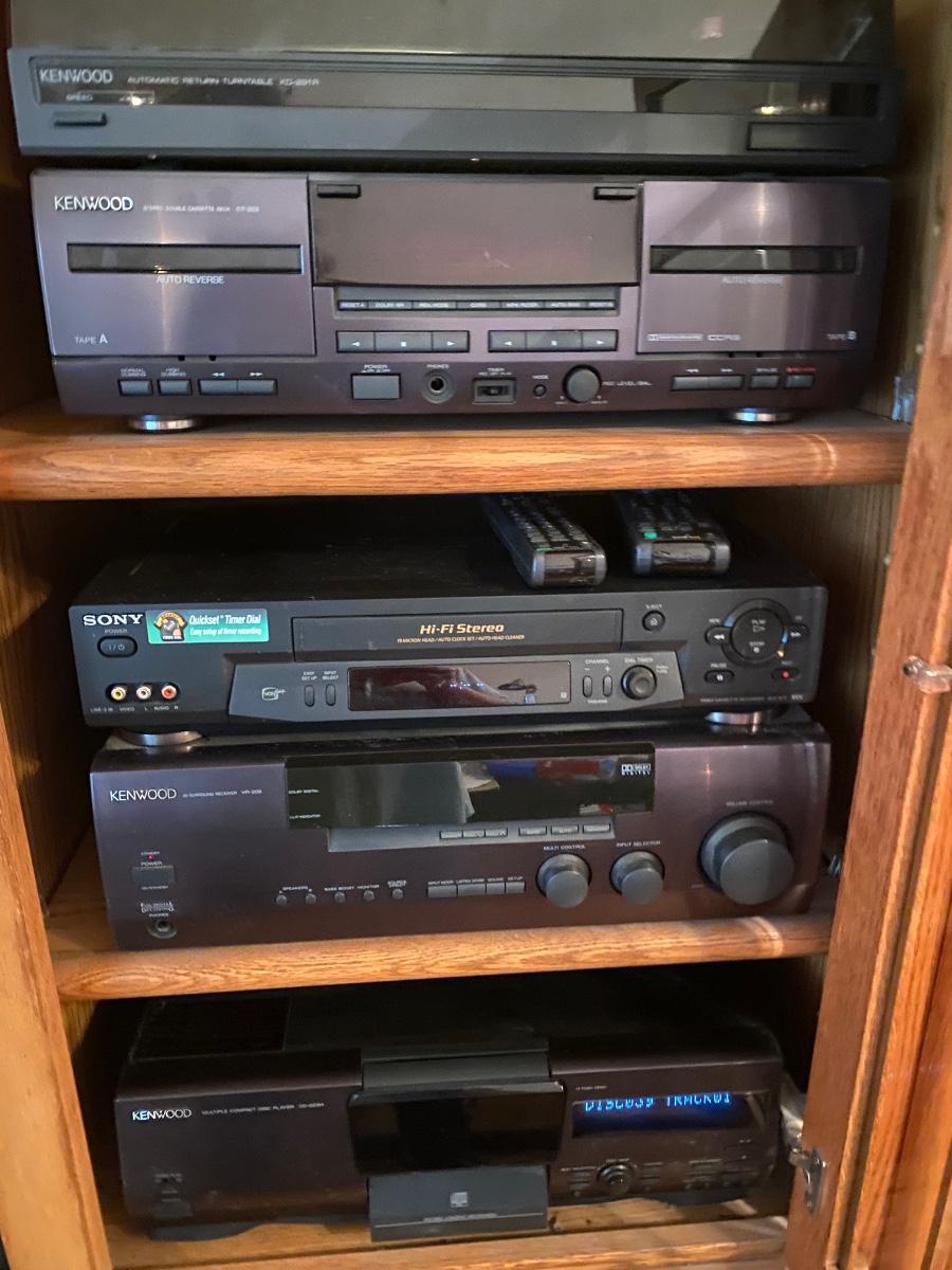 Kenwood digital stereo component system with record player: receiver, turn table, multiple CD player, dual cassette player, 2 speakers and a sub woofer. Everything works, in good condition. Cabinet is on another auction. VHS player sold separately.