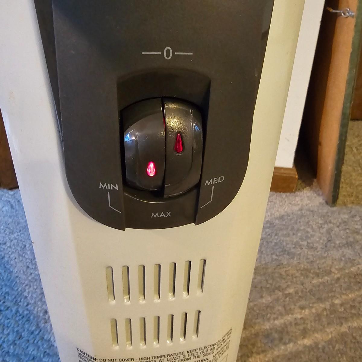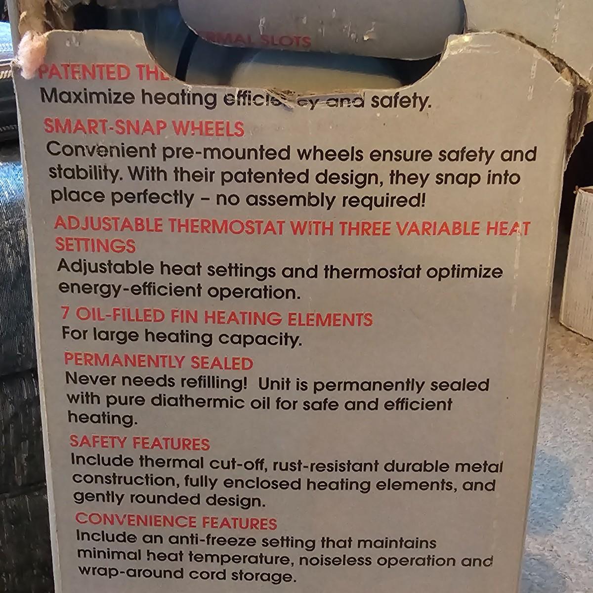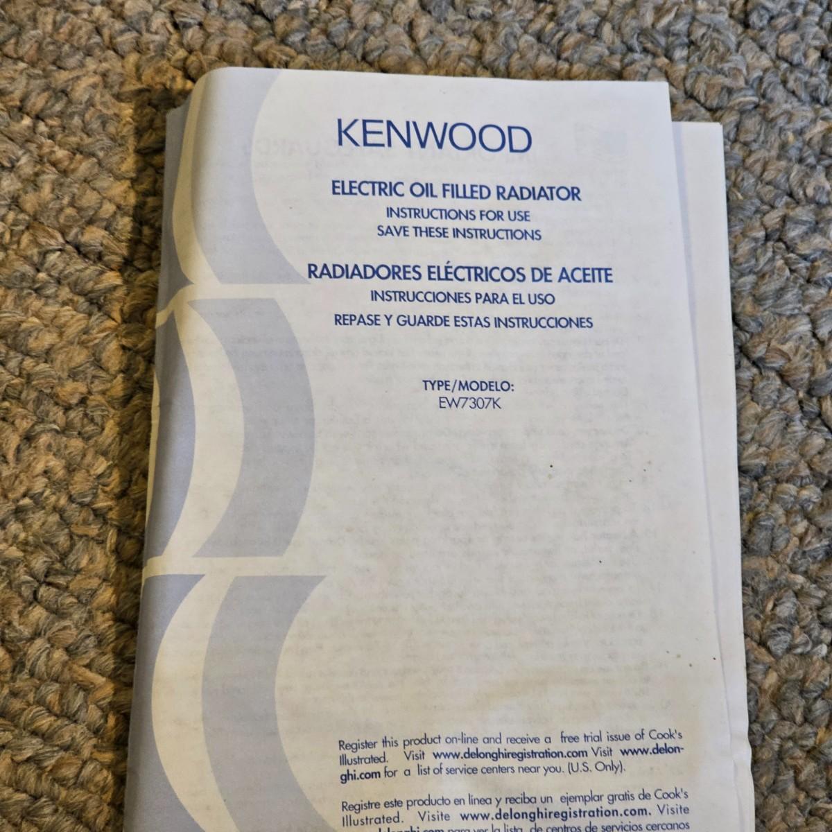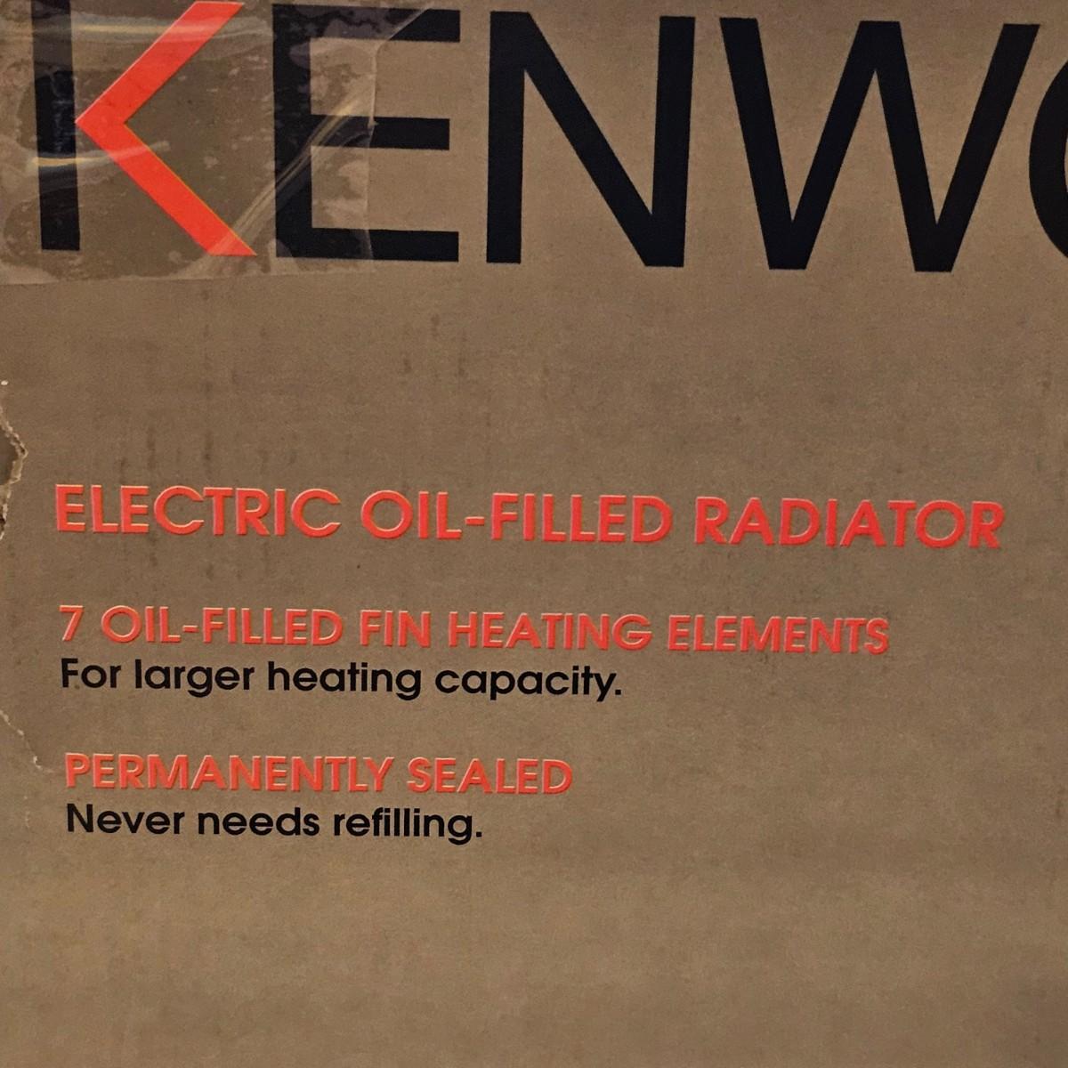 Portable room size electric heater by Kenwood. Oil filled technology, two heat settings and more. Measures 13" x 6" x 25"H, in original box with instructions. Unit powered on when plugged in. See photos for details. Local pickup only.