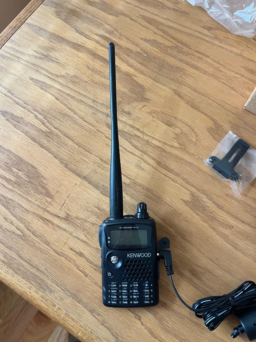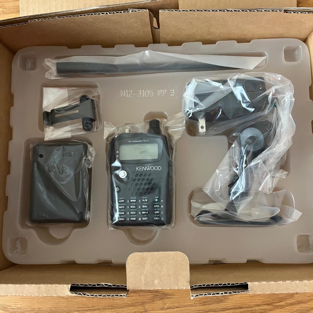Kenwood Tribander is in its original box. All items are still in their original wrapping. Included is an instructional manual. Hand unit is 2.5” x 1.25” x 4”H. Antenna is 7.5”H. Carrying strap and clip are included.