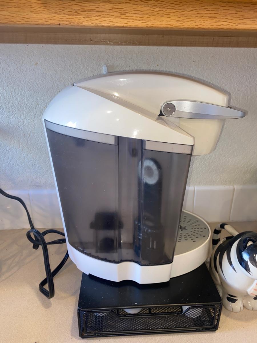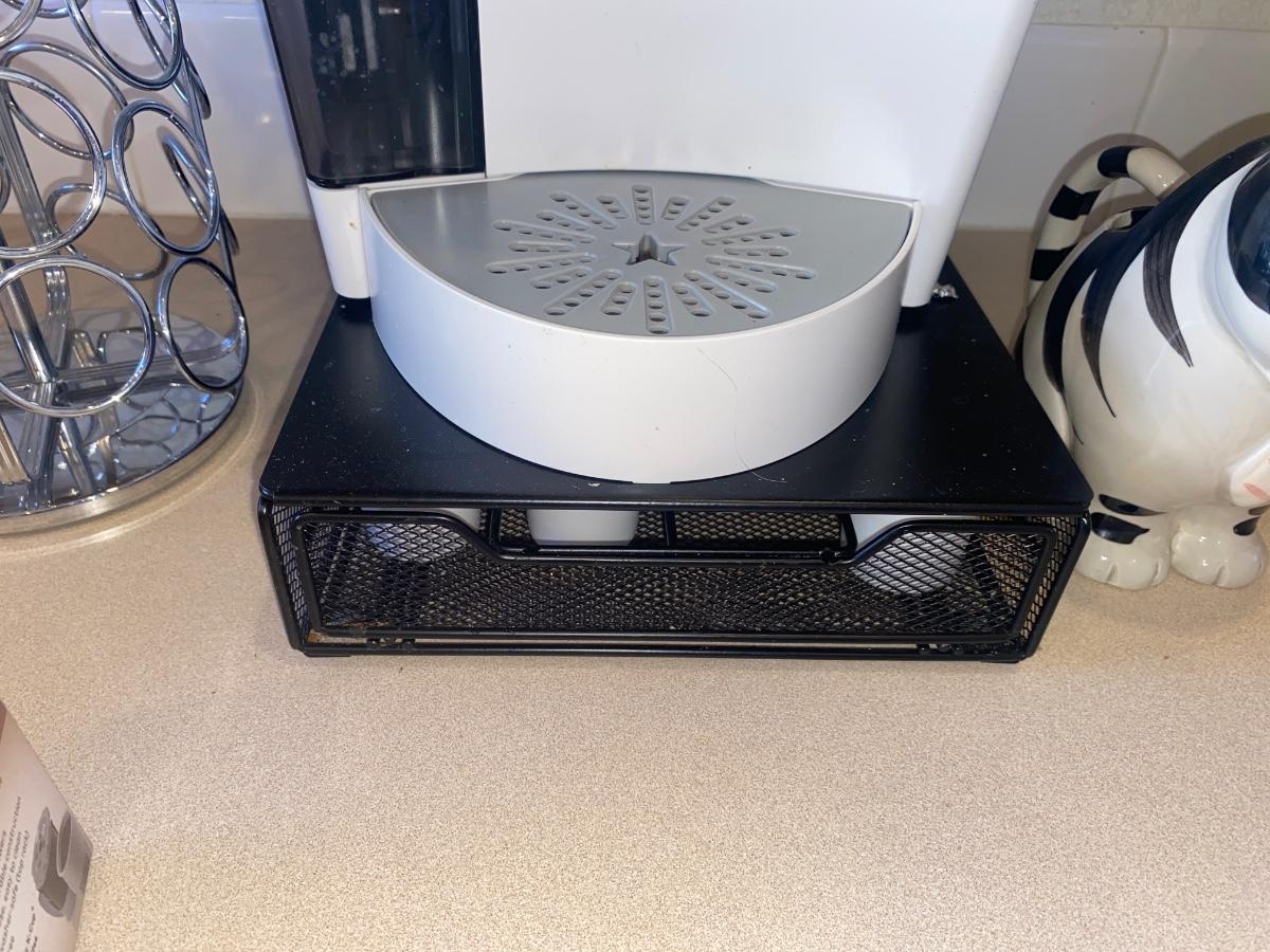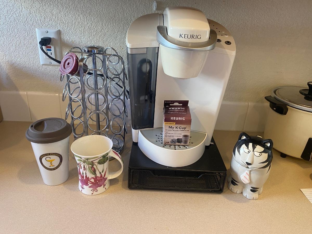 KEURIG COFFEE MAKER, KITTY CREAMER, AND TWO DIFFERENT COFFEE POD HOLDERS