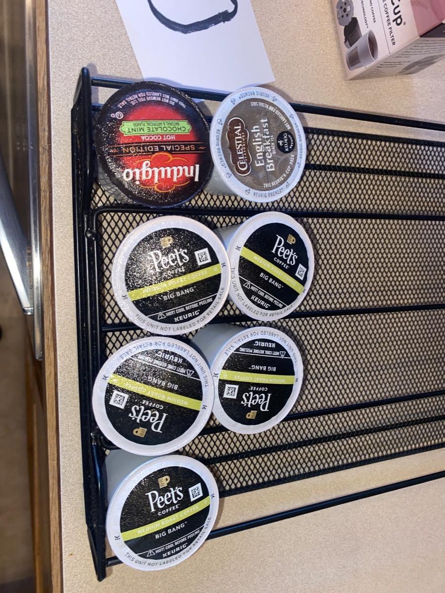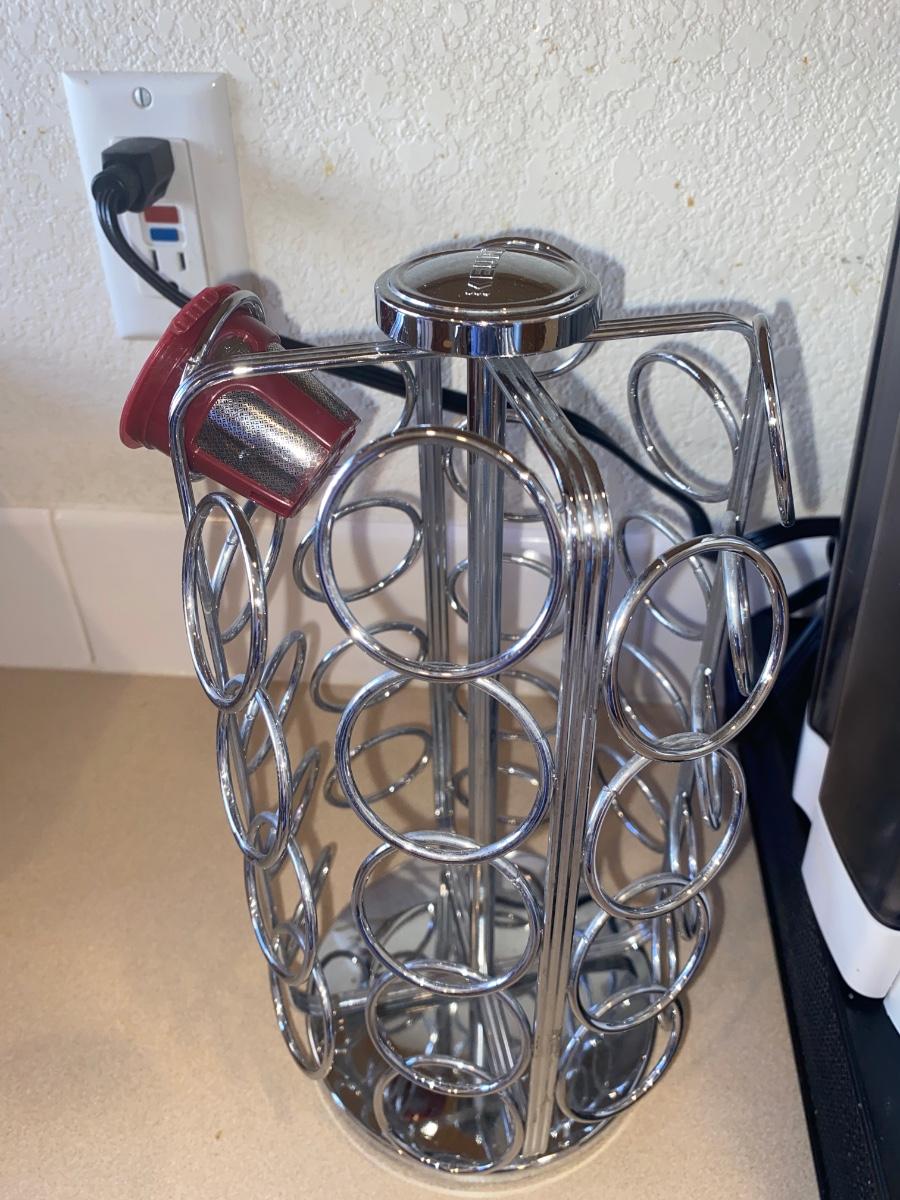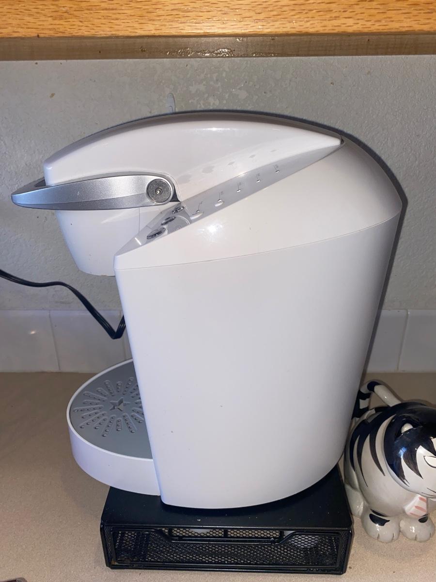 KEURIG COFFEE MAKER, KITTY CREAMER, AND TWO DIFFERENT COFFEE POD HOLDERS