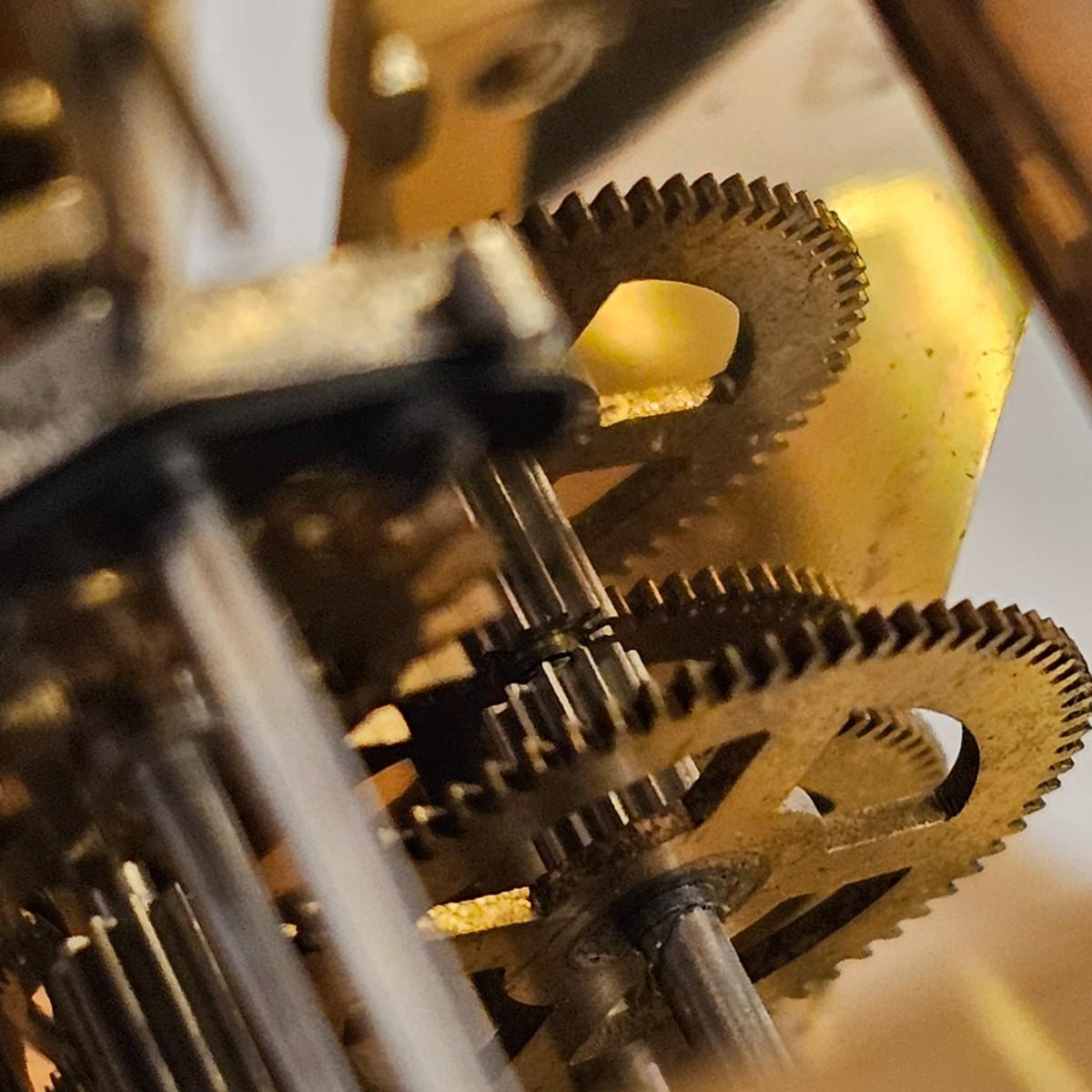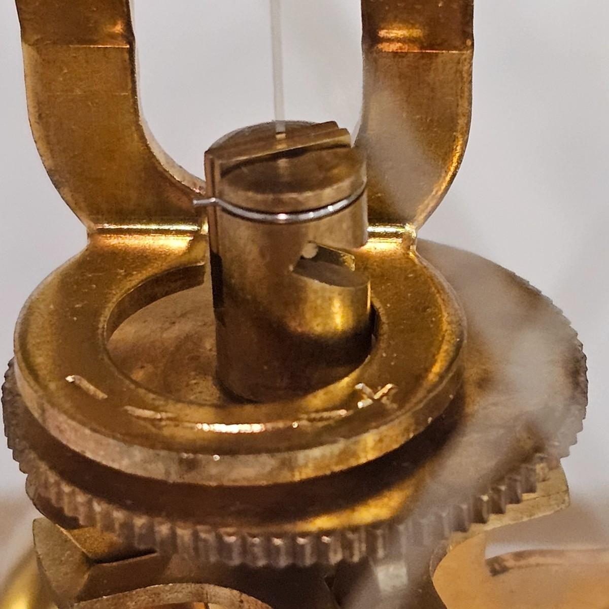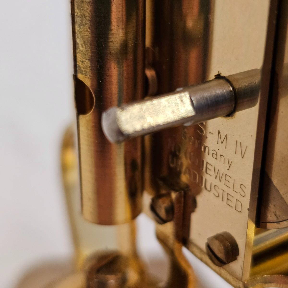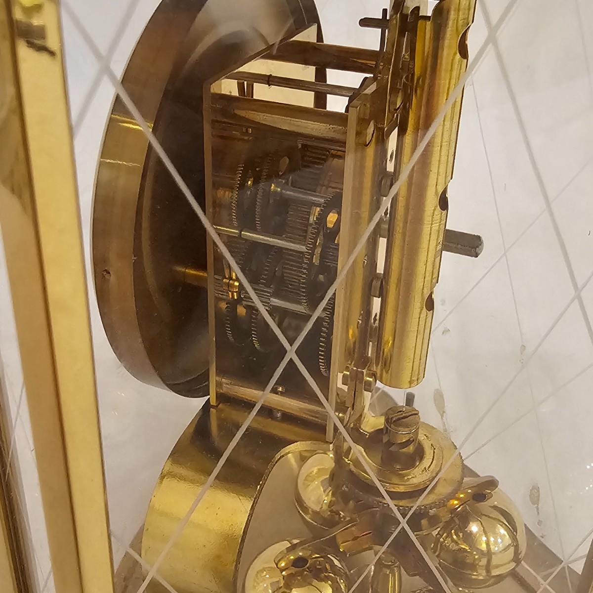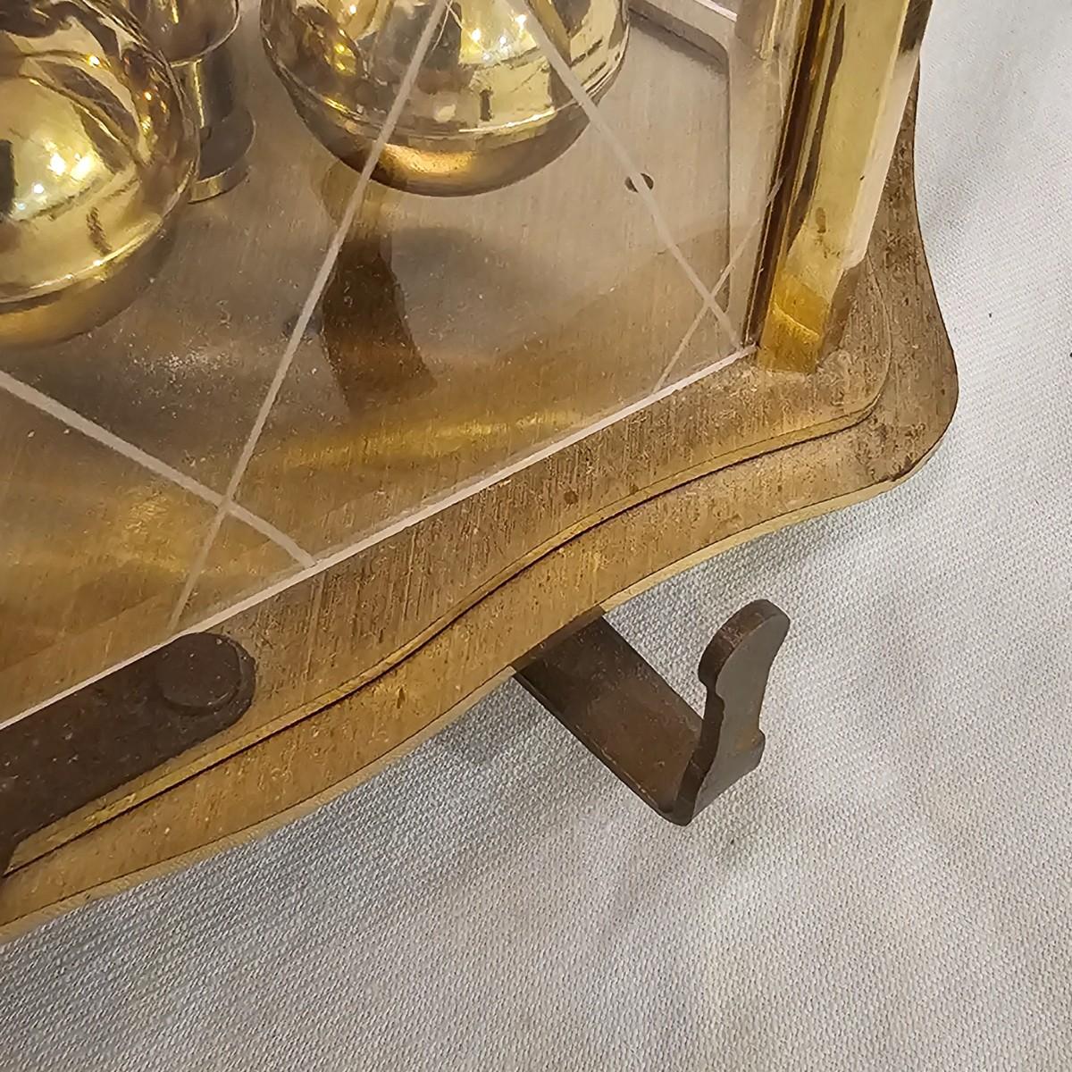 Brass and etched glass case, this German timepiece by Kern is beautiful and stylish. Roman numerals on face with engraved backpiece, this clock measures 6" x 4.5" x 8"H. Clustervof four Brass balls at bottom rotates as clock unwind to keep time. Lever on bottom side of case secures cluster for transport. Case has three screw type leveling points, and entire case is removable for cleaning. It is not known if clock functions and/or keeps time. See photos for details. Shipping available.