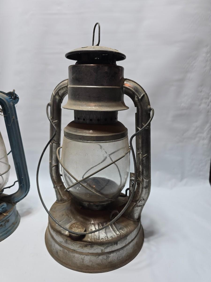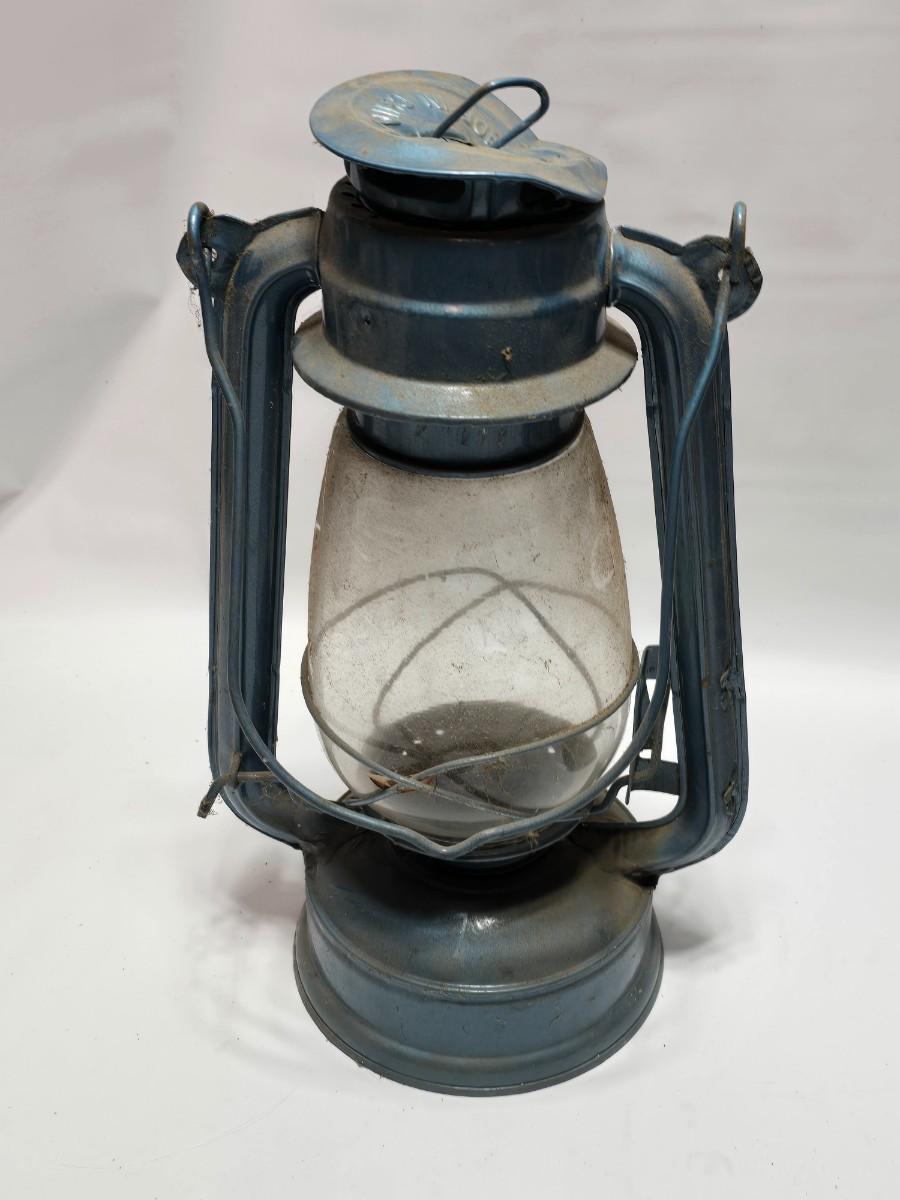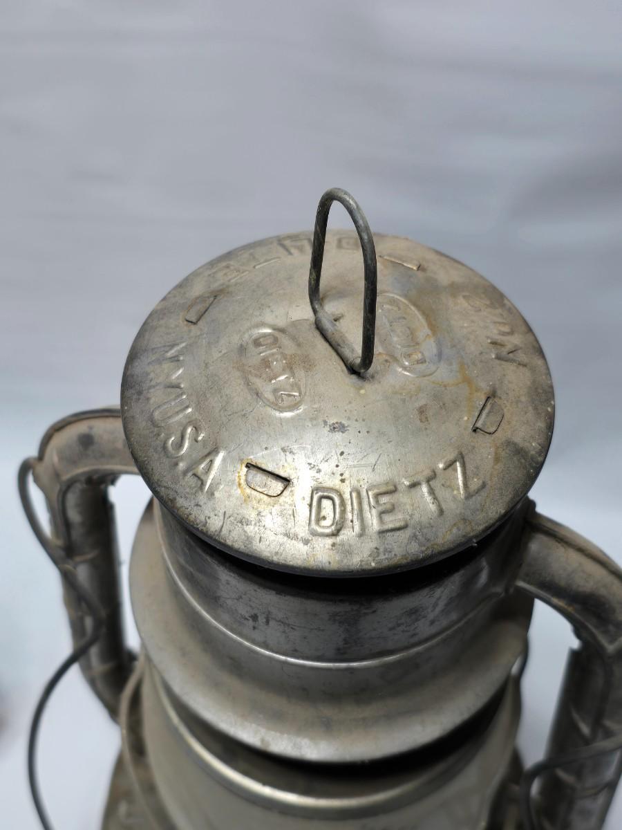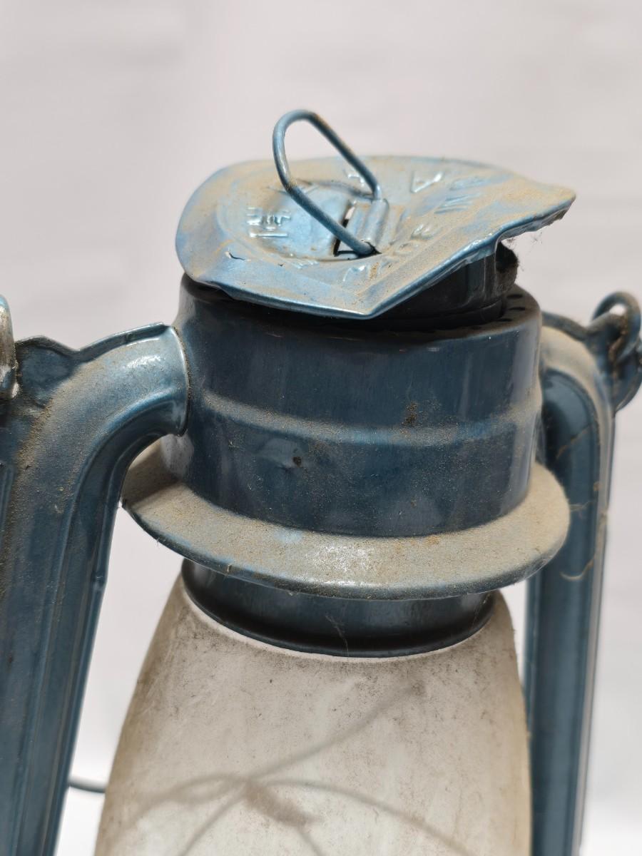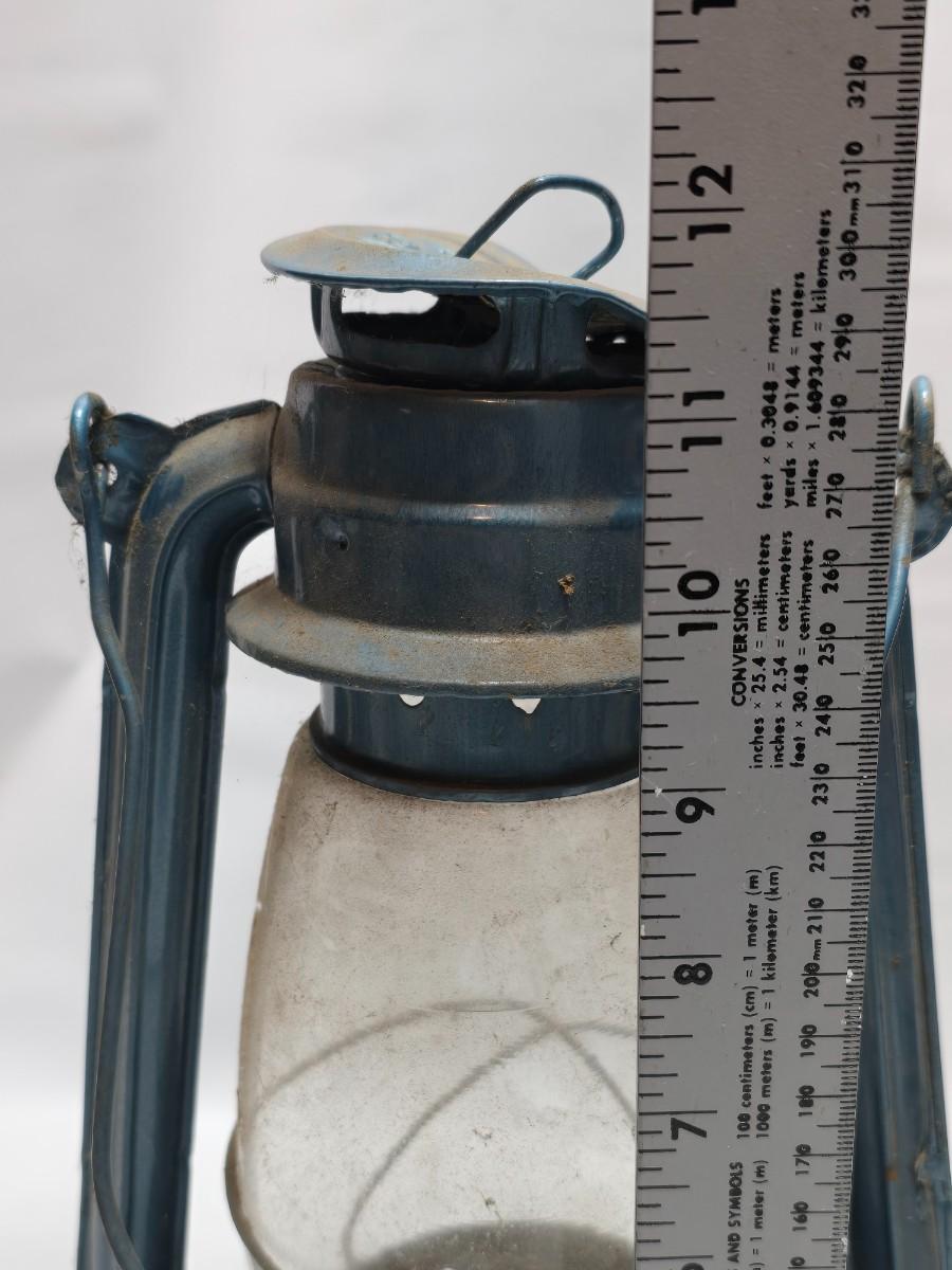 Kerosene Lanterns - Dietz USA New York No 2 - damaged bent top Made in China Blue with glass globes