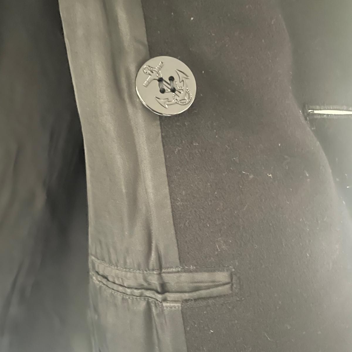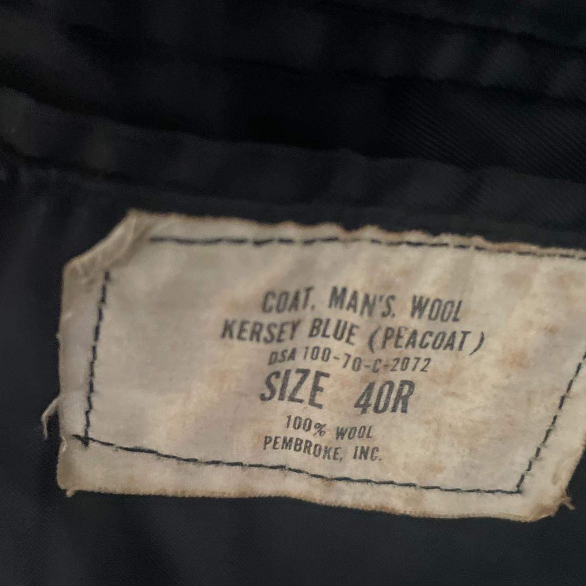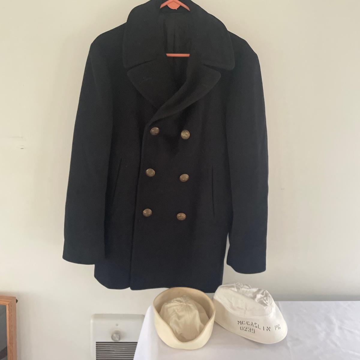 This heavy wool blue peacoat is size 40R and is in very good condition but is musty as the home has mildew. Two sailors hats are included that appear to be authentic.