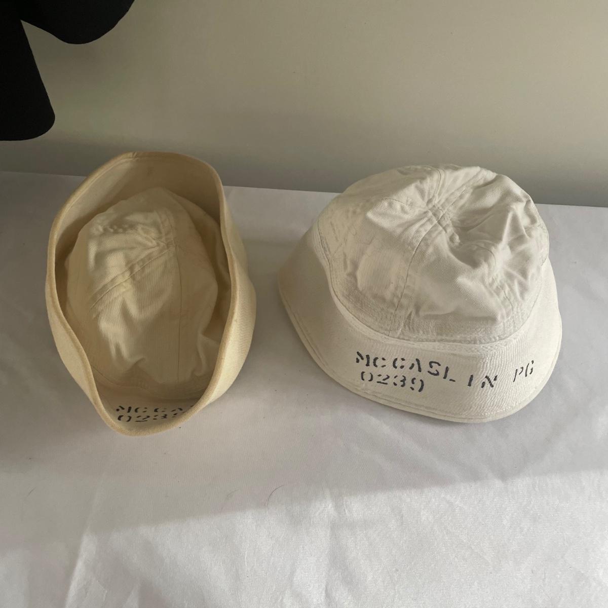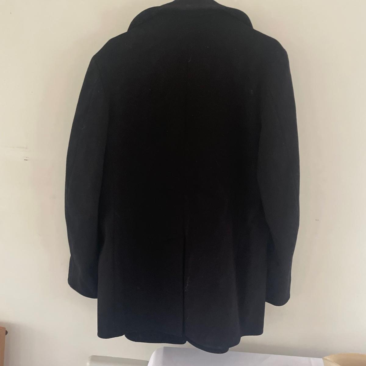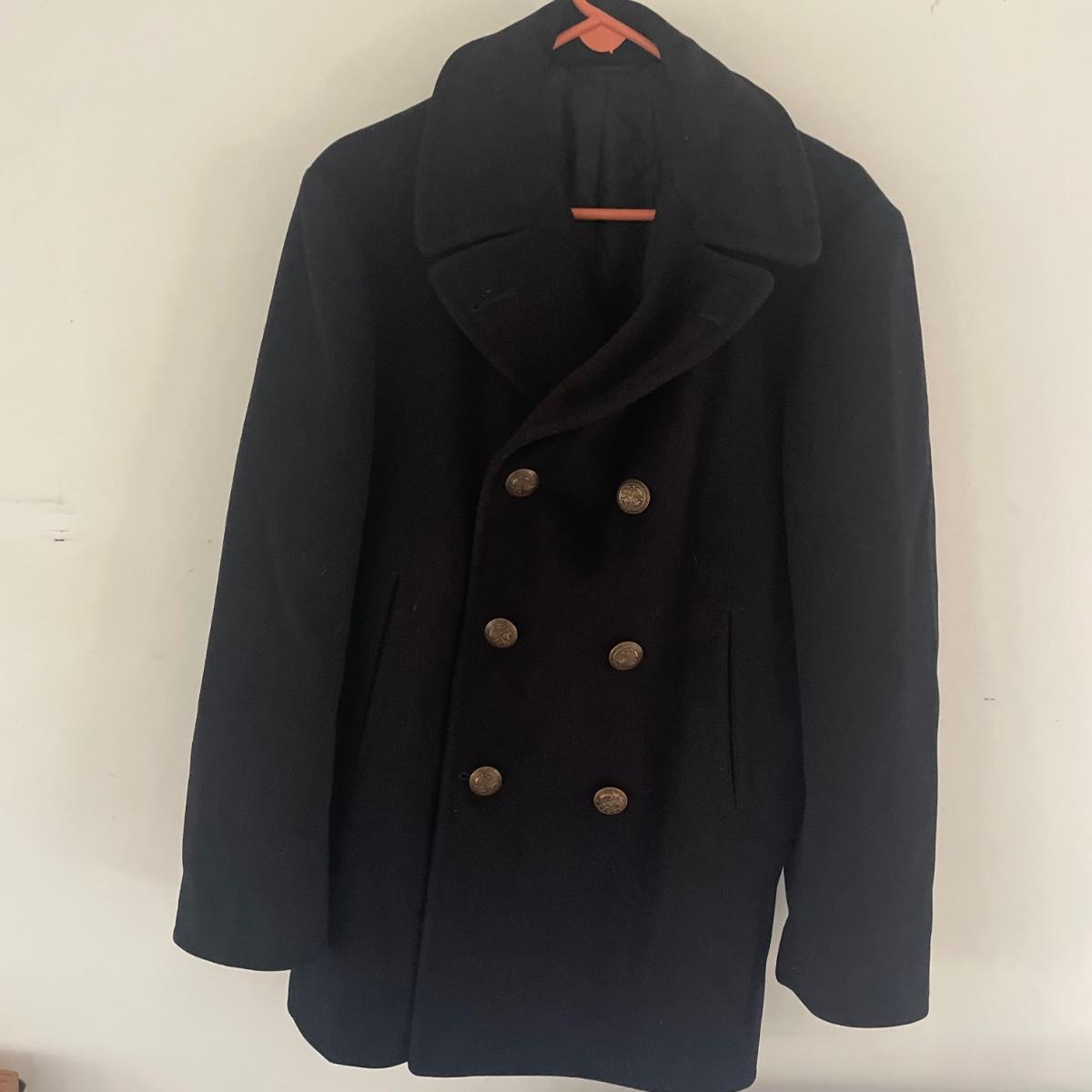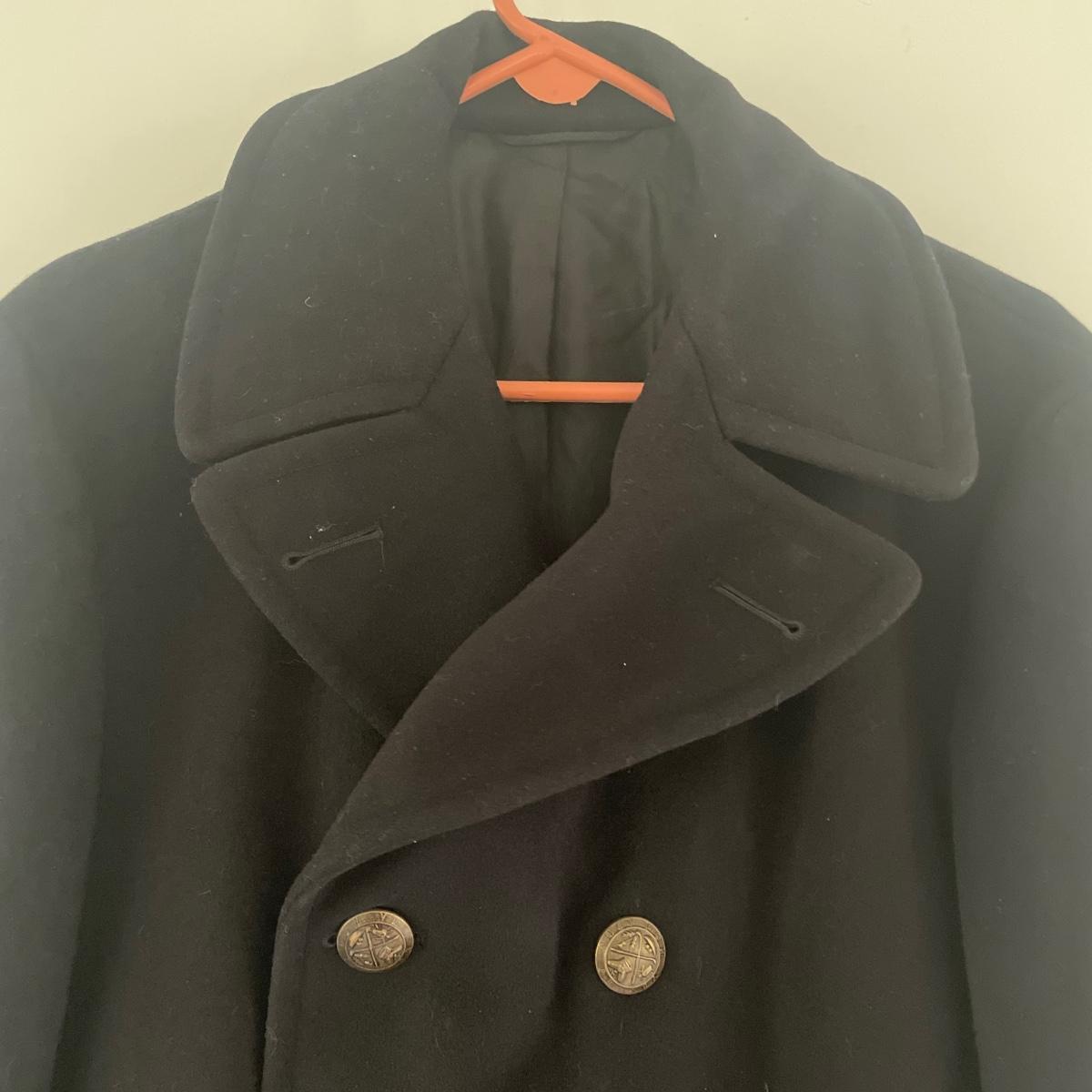 This heavy wool blue peacoat is size 40R and is in very good condition but is musty as the home has mildew. Two sailors hats are included that appear to be authentic.